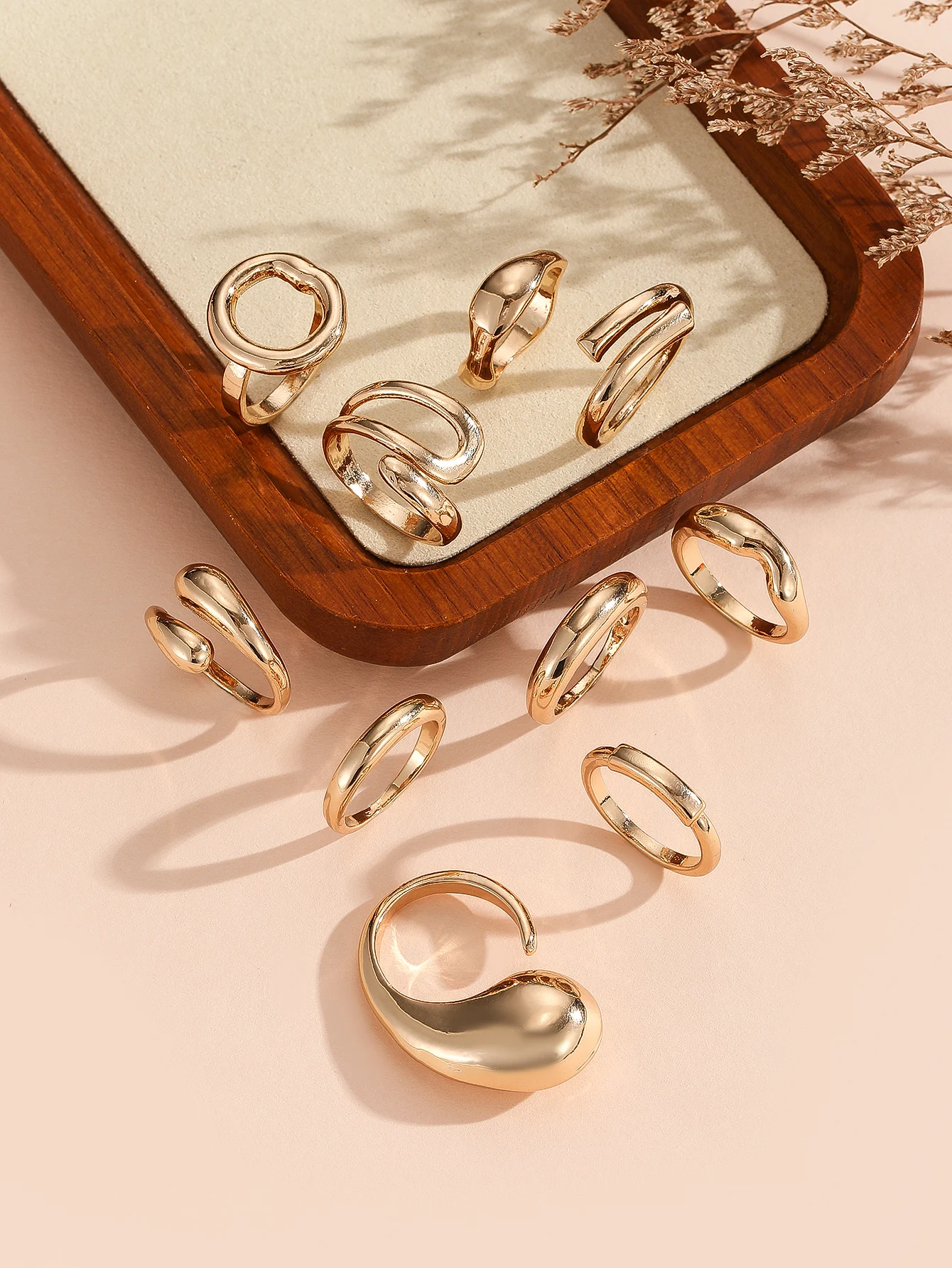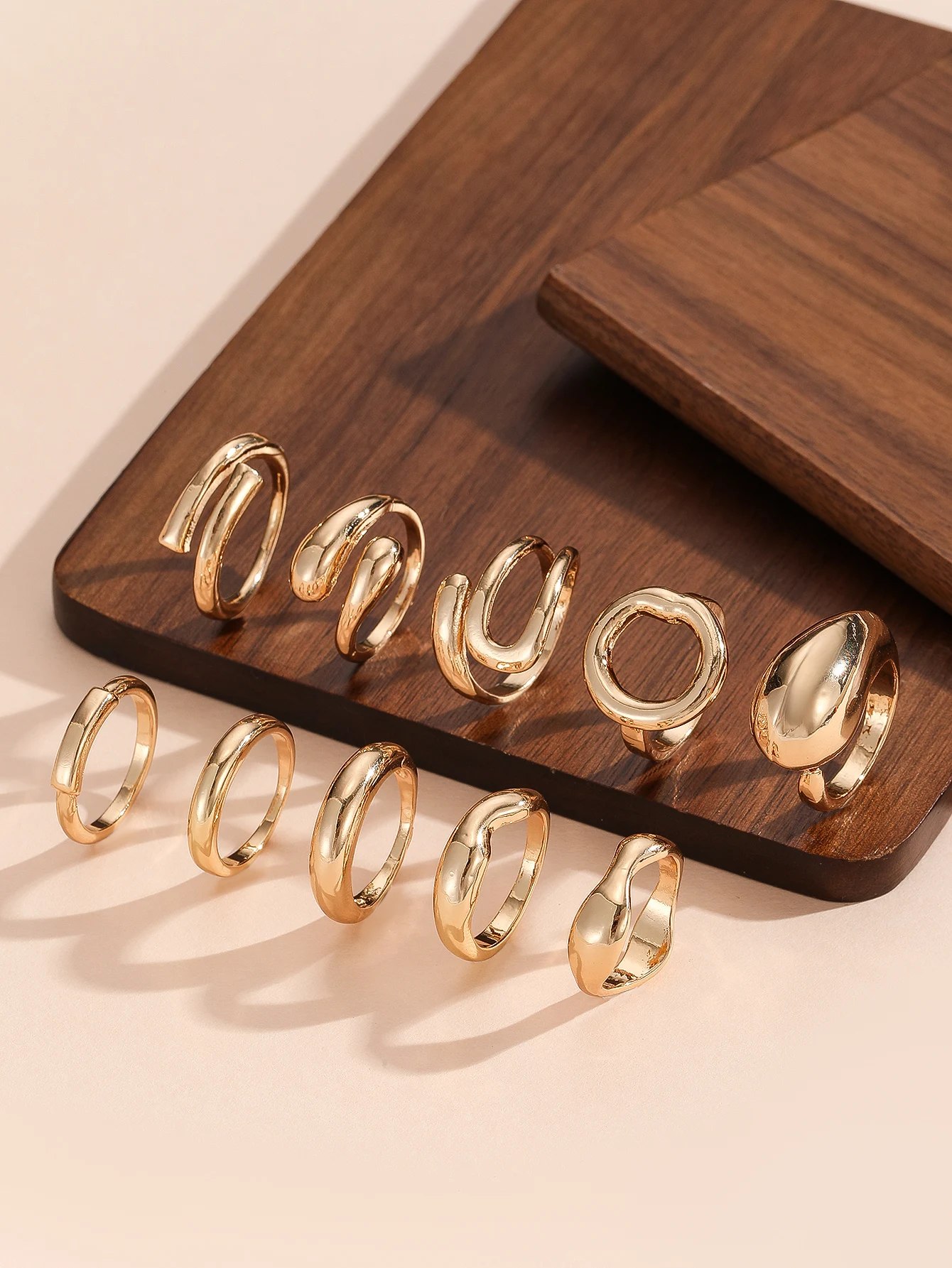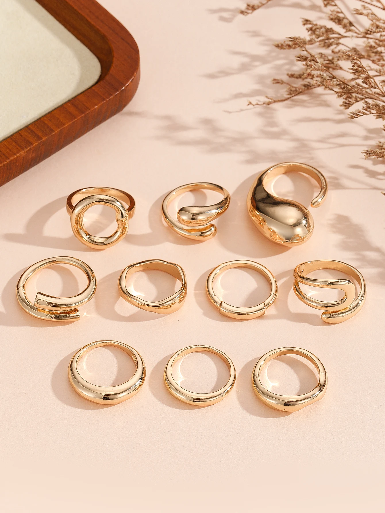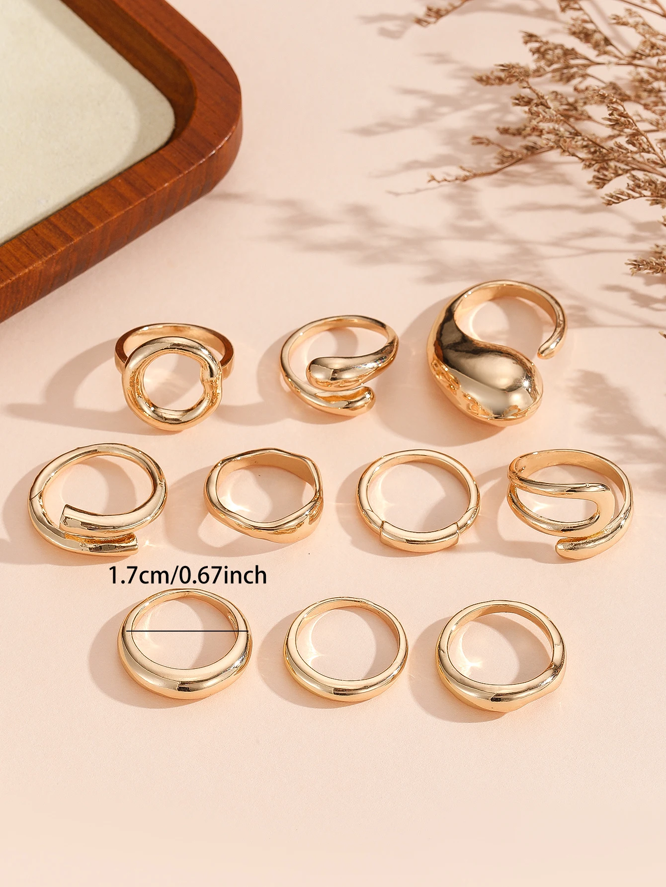 - Set includes 10 fashion-forward rings with lava-textured water drop and geometric styles, crafted from zinc alloy with a durable 14k gold plating finish for long-lasting shine.
