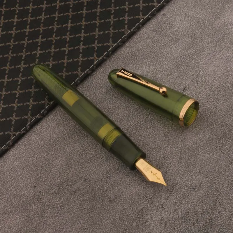 Experience the perfect combination of style and function with this sleek transparent green fountain pen. Crafted from high-quality acrylic, its smooth, uniform body showcases internal mechanisms, adding a modern touch. The 40mm heartbeat No. 8 nib feels exceptionally smooth on paper, providing a refined writing experience whether you're in a business meeting, at the office, or studying. Its ergonomic design includes a comfortable diameter of 18mm and an overall length of 148mm, making it easy to handle for extended writing sessions. The pen's polished, rounded cap features a metallic clip with a warm gold finish, enhancing its sophisticated look. Enjoy the durability, elegance, and performance each time you put pen to paper with this stunning and functional writing instrument. Perfect for those seeking style and reliability in their writing tools.