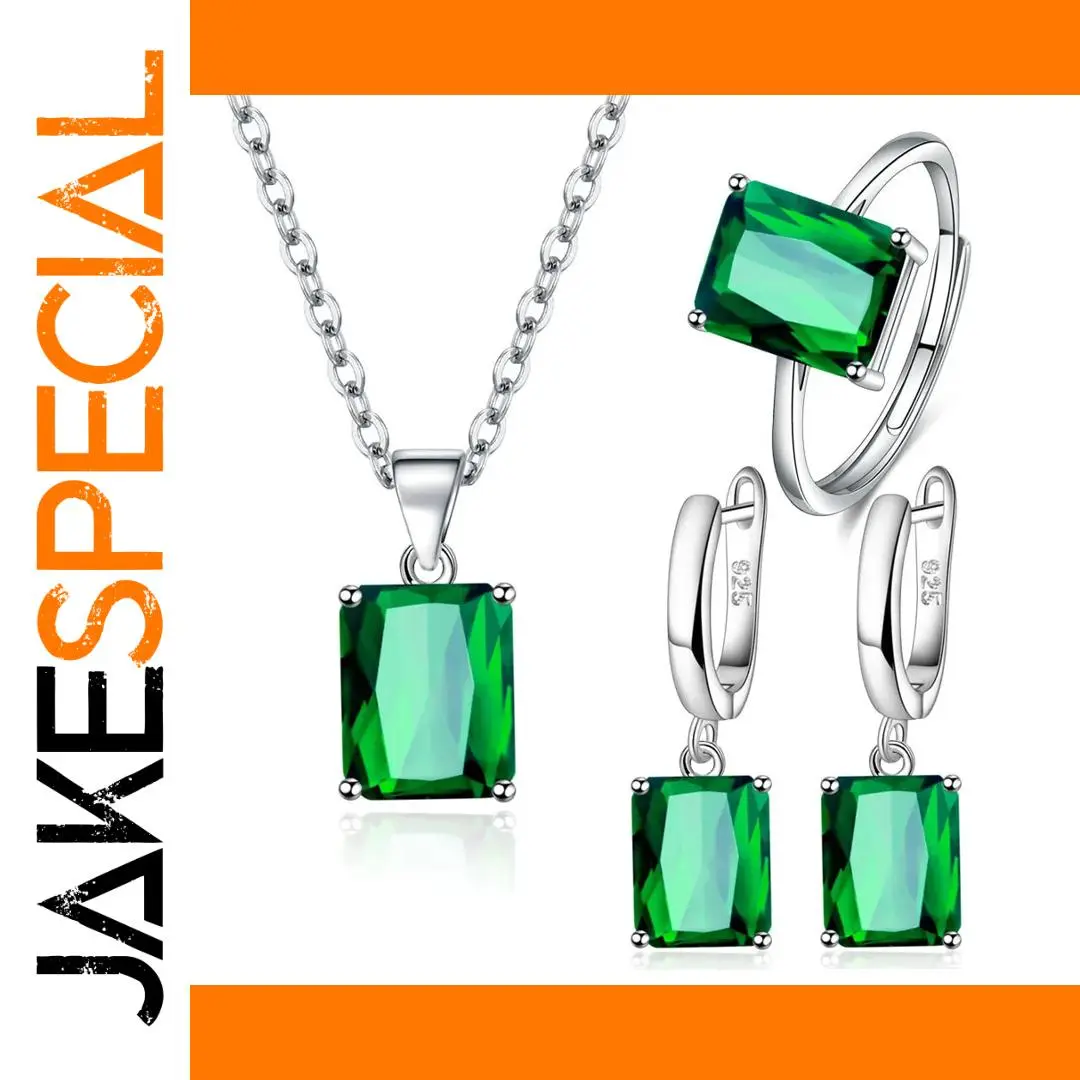 - Includes a necklace, earrings, and a resizable ring, all with matching rectangular cubic zirconia stones in a bold green hue for a cohesive style.