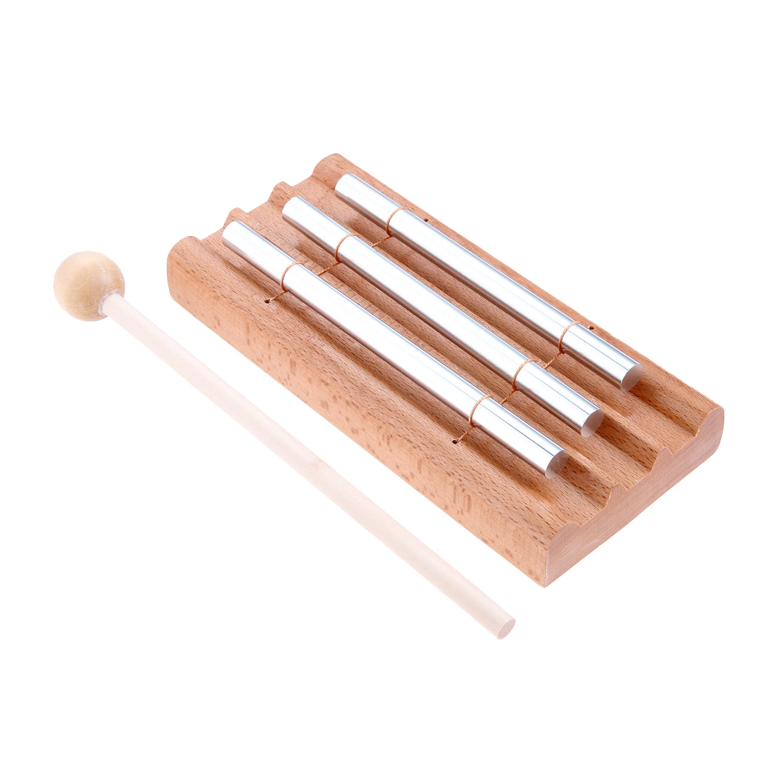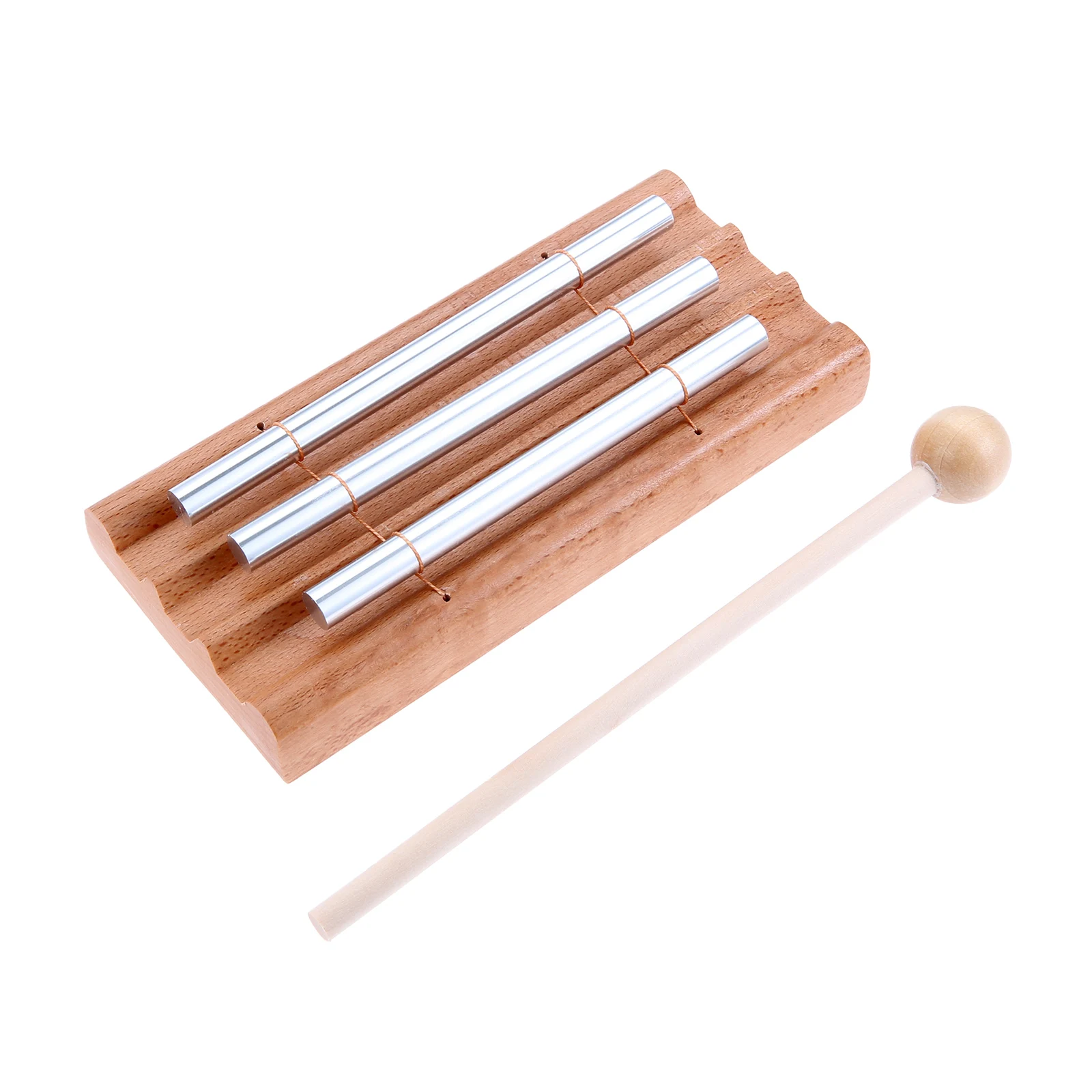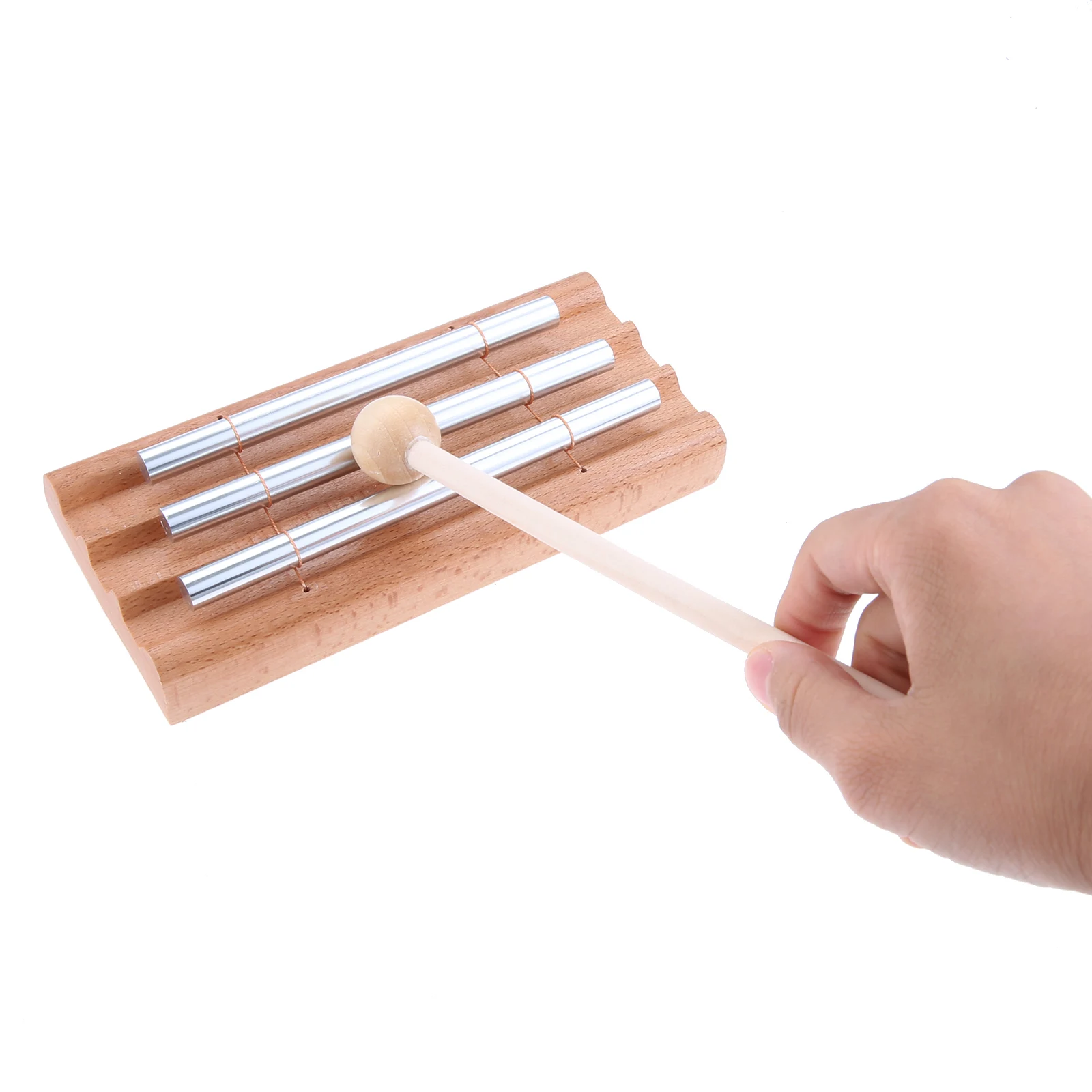 - The handcrafted design features a durable, natural wooden rectangular base, balanced with three shiny aluminum rods that emit a pristine and sustained “Ding” sound for relaxation and meditation.