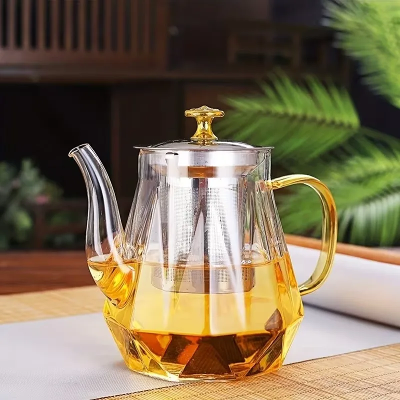 Experience brewing elegance with this high borosilicate glass teapot. Its diamond-shaped, faceted design creates a jewel-like appearance that catches the light beautifully. Crafted from durable, heat-resistant glass, it resists cracking from open flames, ensuring safe, long-lasting use. The teapot features a sleek, glossy finish that highlights its transparency and meticulous craftsmanship. Adorned with luxurious gold accents on the handle and lid knob, it blends contemporary Nordic minimalism with a touch of sophistication. Inside, the amber-colored tea visible through the glass adds warmth and charm to your table. Whether for a quiet morning or entertaining guests, this versatile teapot elevates your tea or coffee experience with style and durability.