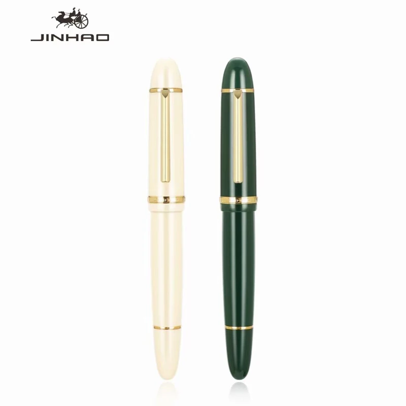 Experience a refined writing experience with this sophisticated Jinhao X159 fountain pen. Crafted with a glossy ivory acrylic body, its sleek cylindrical design offers a comfortable grip and a luxurious look. The matching cap features a slim, polished gold clip and a delicate gold ring engraved with “Jinhao,” adding subtle elegance. The 40mm gold-tone nib, intricately engraved with the brand and emblem, provides precise writing with EF or F tips. Weighing 28 grams and measuring 148mm in length, this pen combines weight and balance for effortless handling. Ideal for business, office, or scholarly use, it uses 2.6mm ink cartridges or a converter, with a smooth spin mechanism for ink regulation. Its minimalist design emphasizes quality and style, perfect for daily or special occasions.