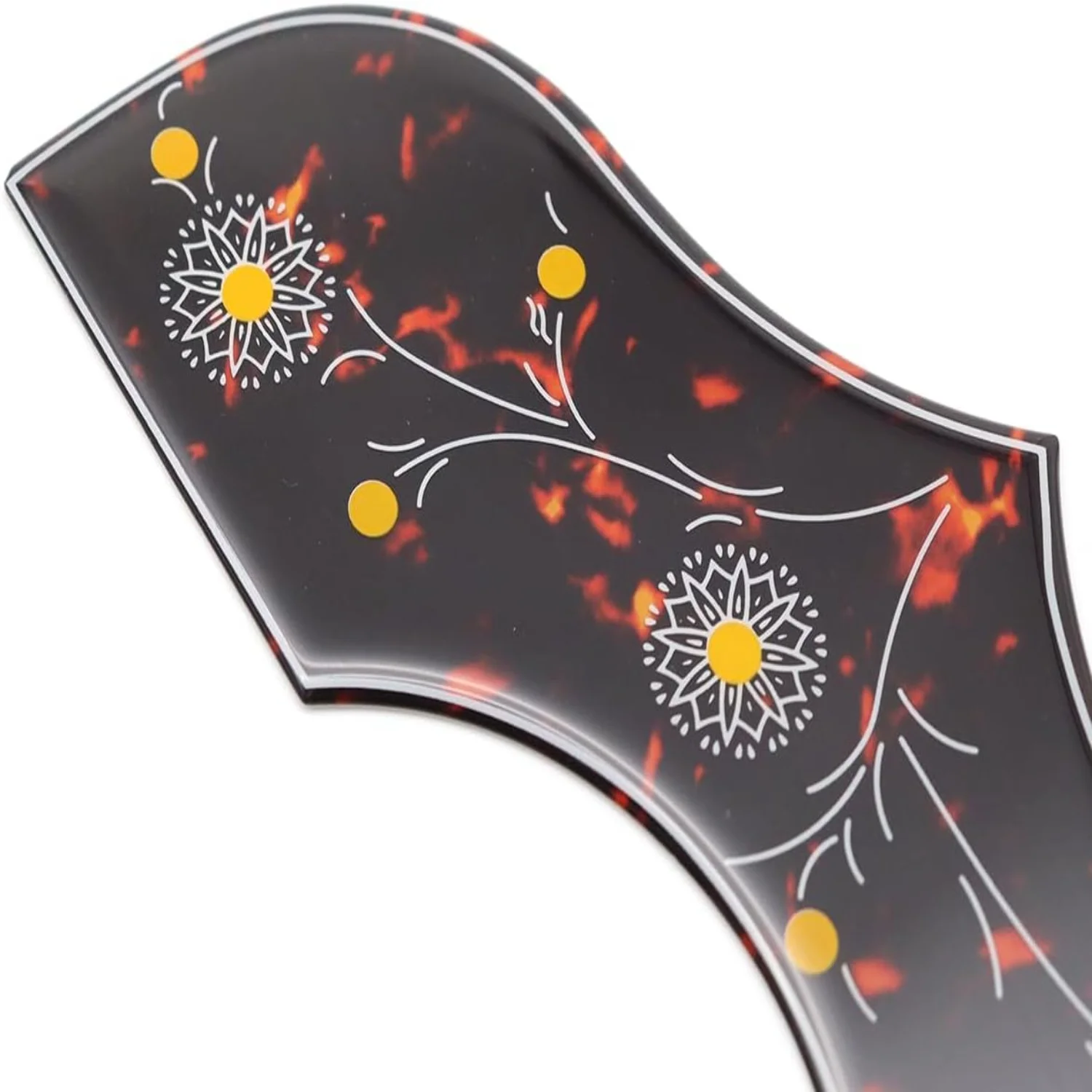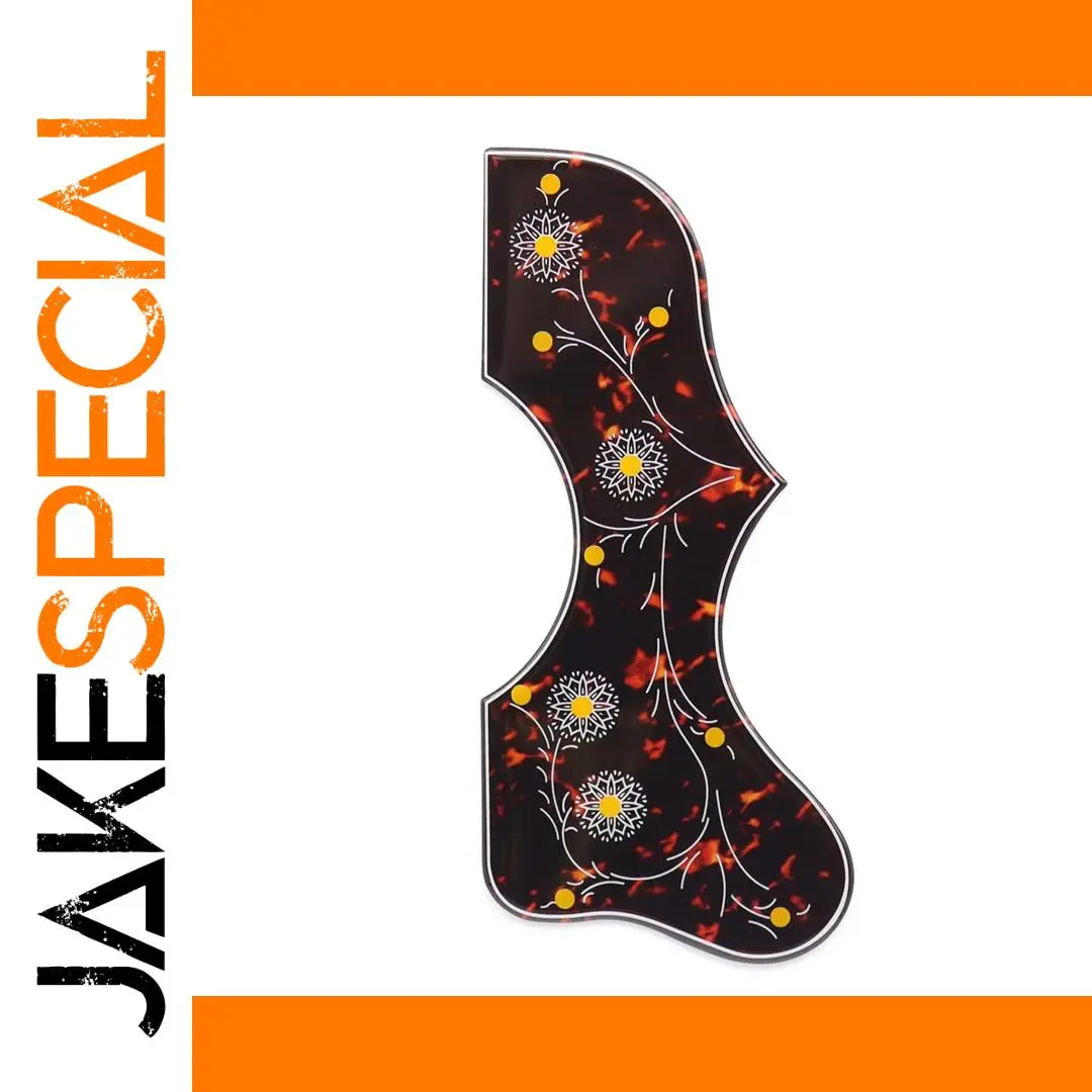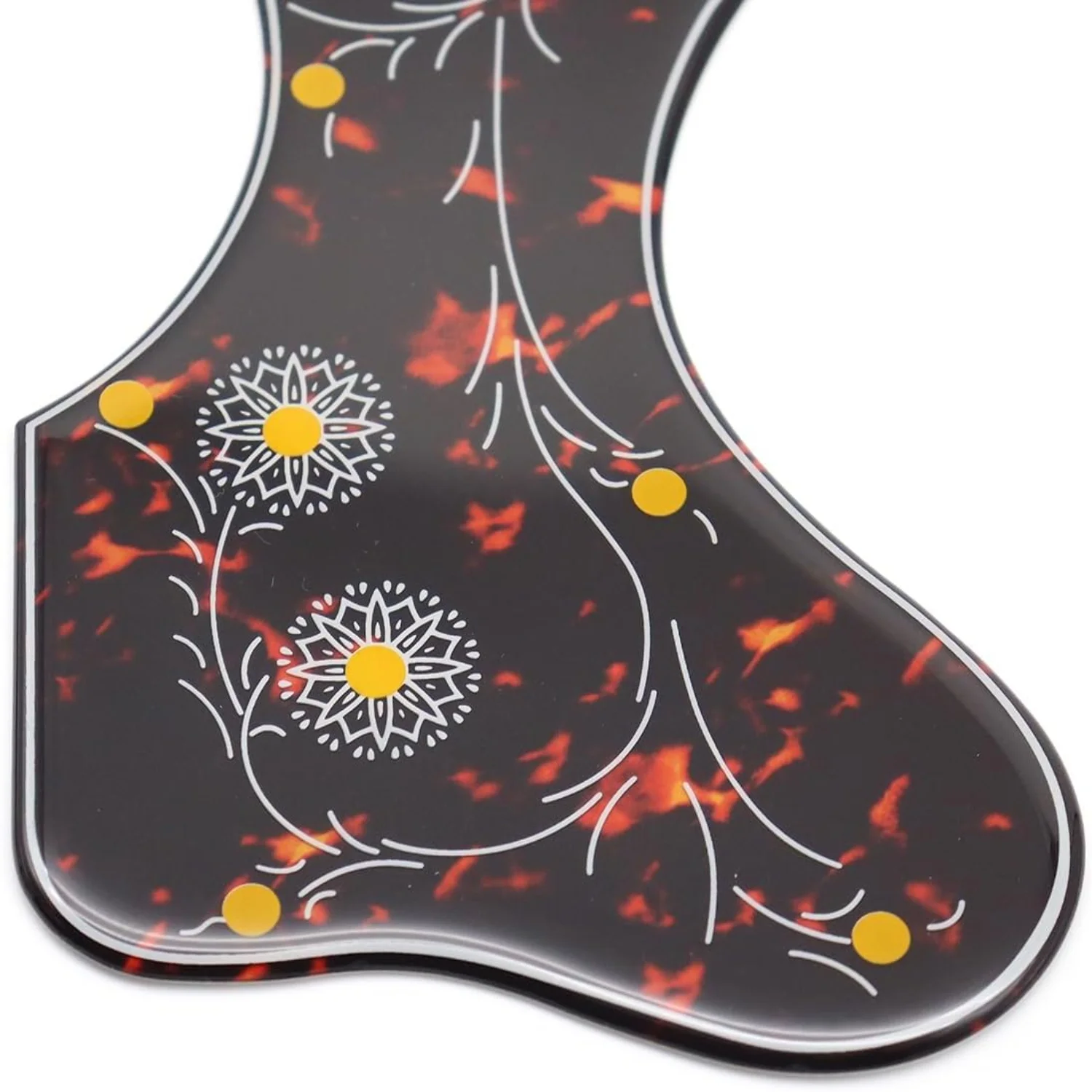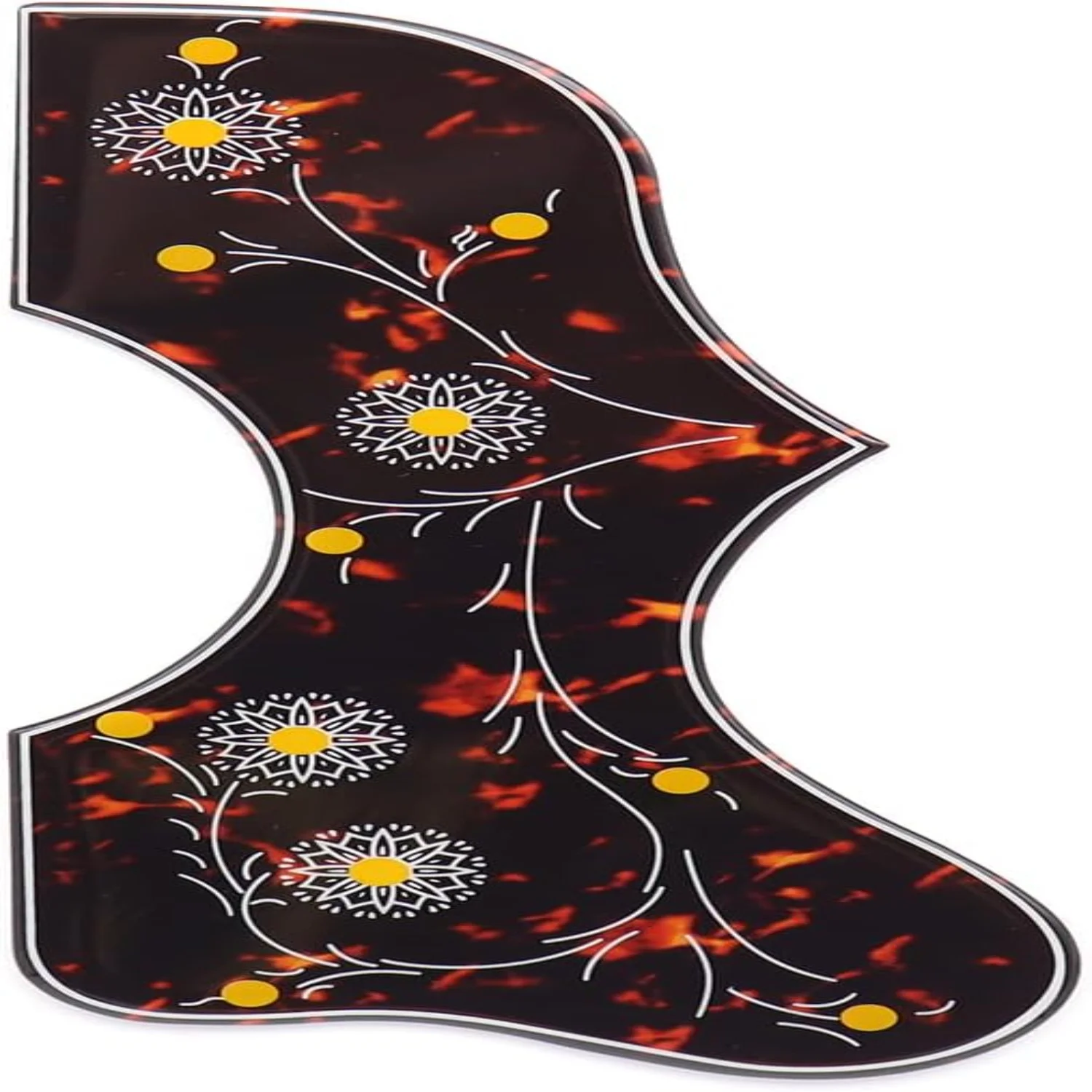 Transform the look of your J200 or SJ200 style acoustic guitar with this beautifully designed pickguard. Crafted from high-quality celluloid and glass epoxy resin, it offers durability and an artistic touch. Its deep tortoiseshell-like pattern features bold black with fiery orange and reddish accents, creating a vivid, eye-catching effect. The delicate white floral motifs, interconnected by elegant curved lines, enhance its artistic appeal, while yellow dots add bright contrast. Its precise chamfered edges reflect light subtly, giving a luxurious and refined appearance. Measuring around 25 cm long and 11 cm wide, with a thickness of 2 mm, this pickguard seamlessly combines style and functionality, protecting your guitar's surface from scratches while adding a personalized touch to your instrument’s aesthetics. Enjoy easy installation thanks to the self-adhesive backing, effortlessly blending protection with artistic beauty.