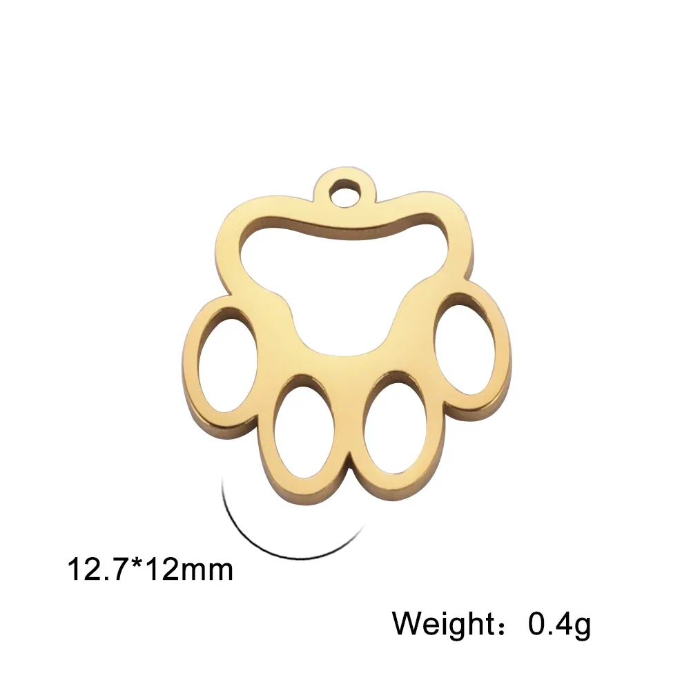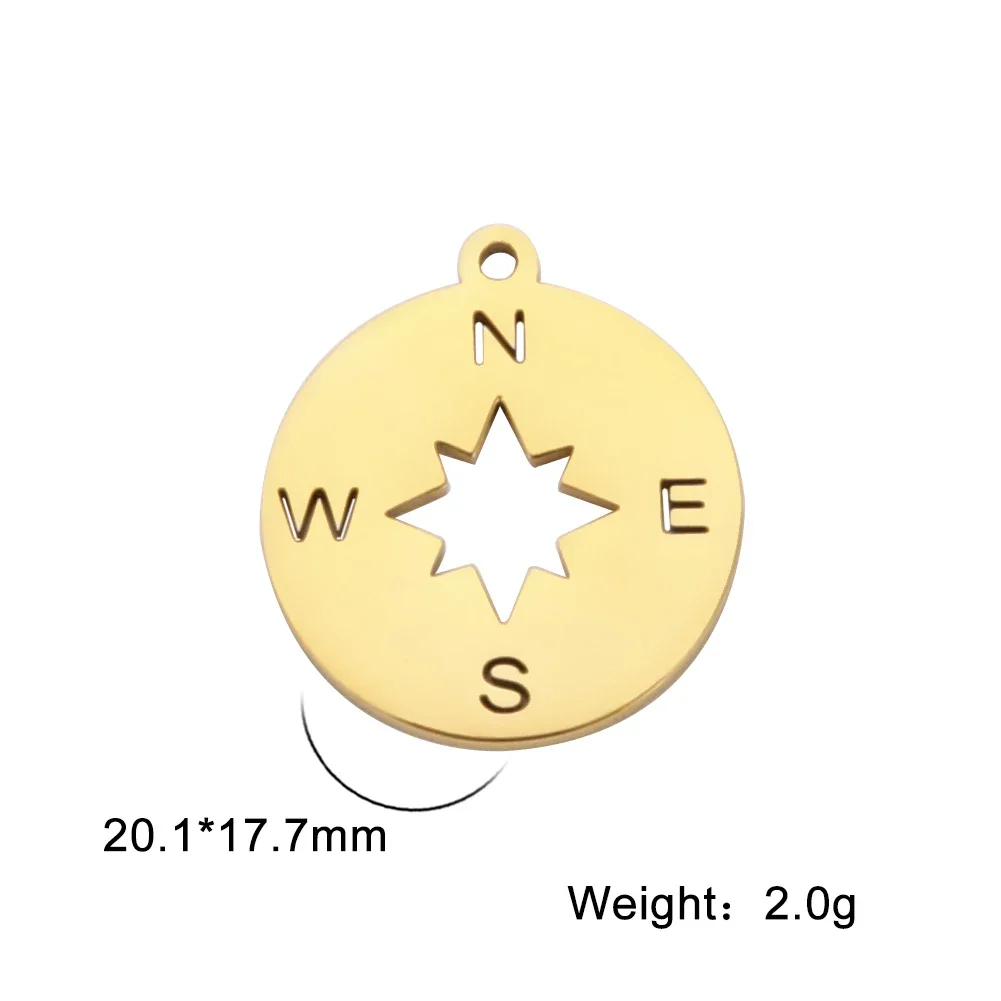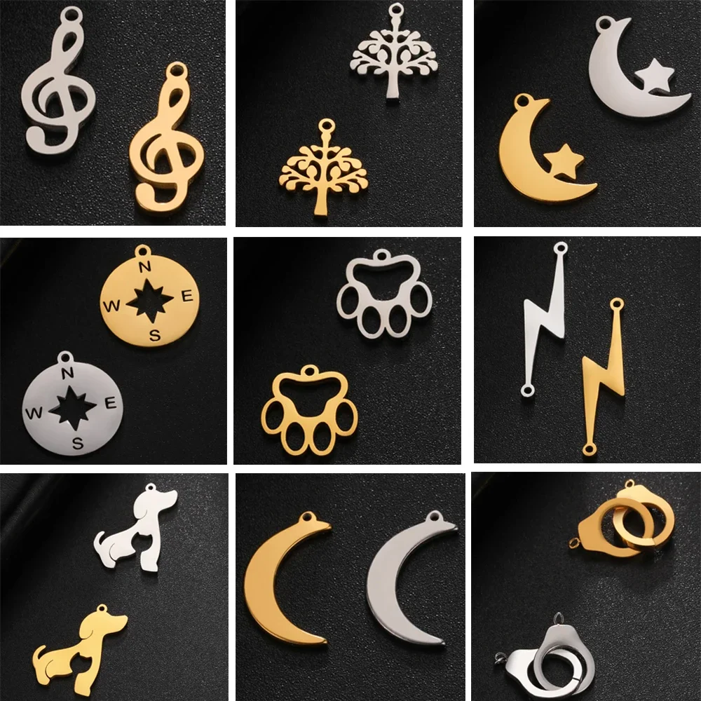 - Set of 5 stainless steel charms featuring diverse designs like moon-star, music note, tree, paw, and compass; available in steel and gold vacuum plating finishes for versatile styling.