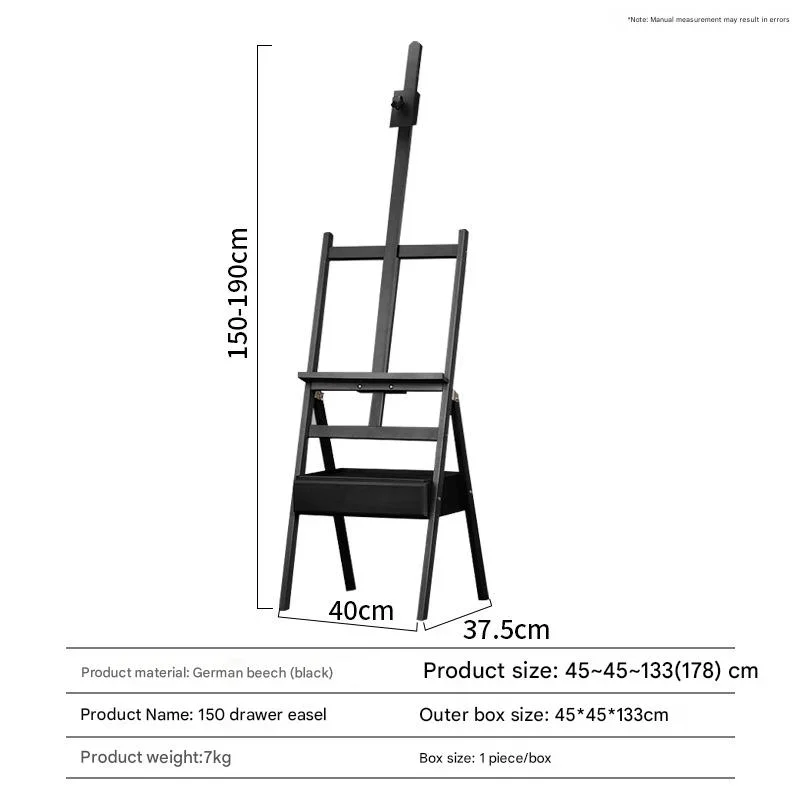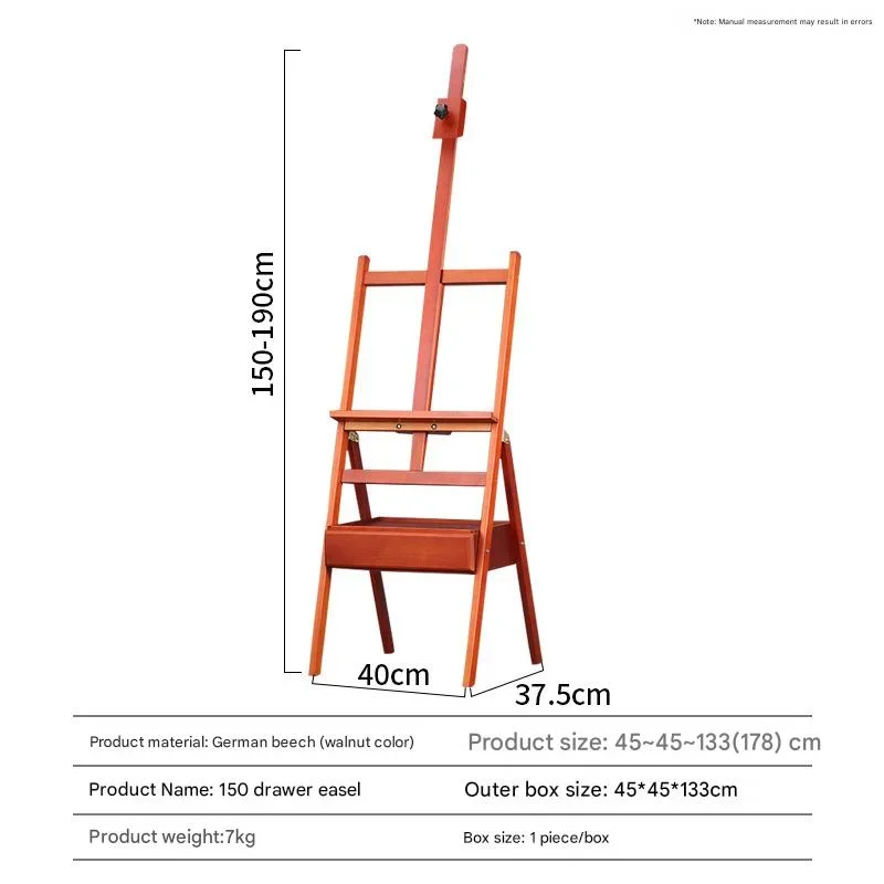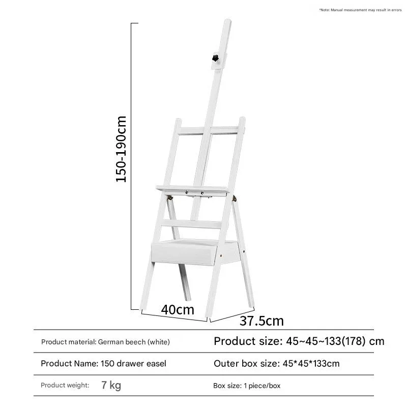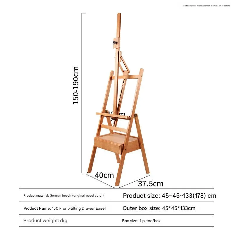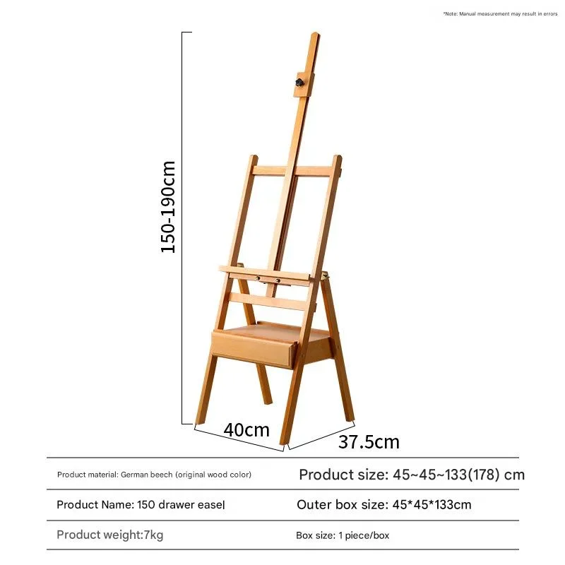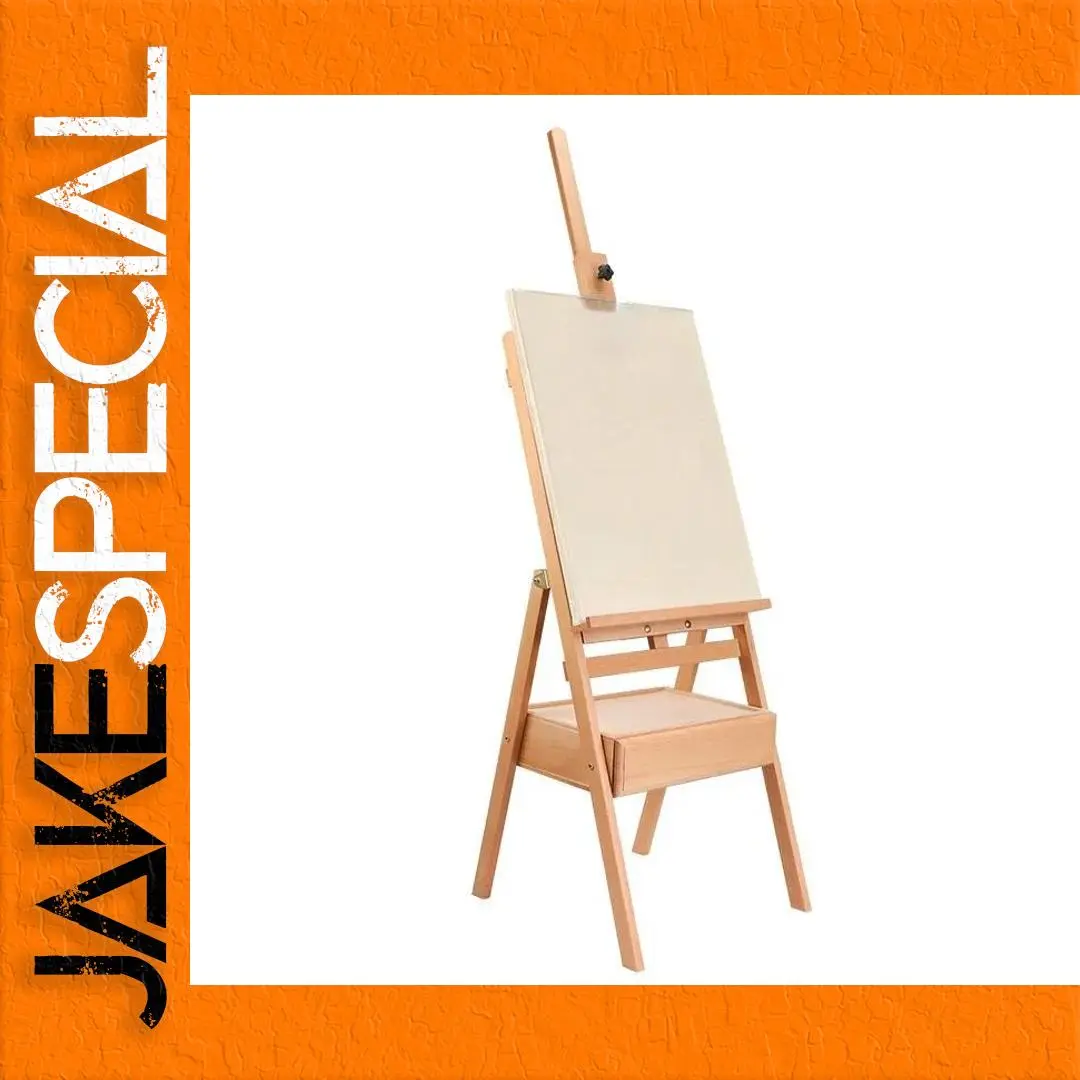 Immerse yourself in your art with this beautifully crafted large wooden studio easel, designed for both serious amateurs and professional artists. Made from high-quality, hand-sanded aged beechwood grown in Germany, it boasts a warm, natural appearance with a smooth oil finish that highlights the rich grain. Its sturdy H-frame design provides exceptional stability, while the adjustable mast and canvas rest make it versatile for different canvas sizes and working positions—whether sitting or standing. The easel features a wooden clamp to securely hold your canvas, a liftable storage drawer, and a practical shelf, ensuring all your art supplies are within reach. Its aesthetic emphasizes craftsmanship and functionality, inspiring creativity.