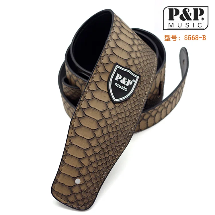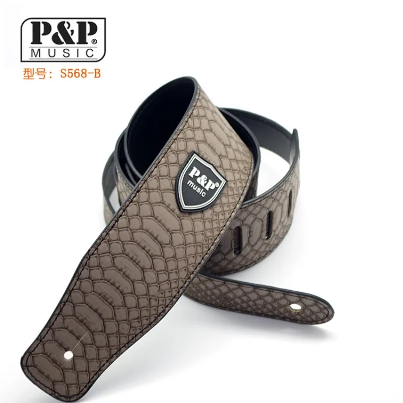 Imagine elevating your performance with this stylish leather guitar strap, designed to combine durability and elegance. Crafted from high-quality leather, it features a textured pattern resembling snake or crocodile skin, adding a touch of exotic sophistication. Available in three versatile colors—beige, brown, and black—you can effortlessly match your instrument and personal style. The neat stitching along the edges ensures long-lasting strength, while the black patch with a white shield logo adds a subtle branding touch. Designed to fit both electric and Western string instruments, this strap offers secure support and adjustable comfort. Its refined craftsmanship makes it suitable for studio use or stage performances, blending function with fashion effortlessly.