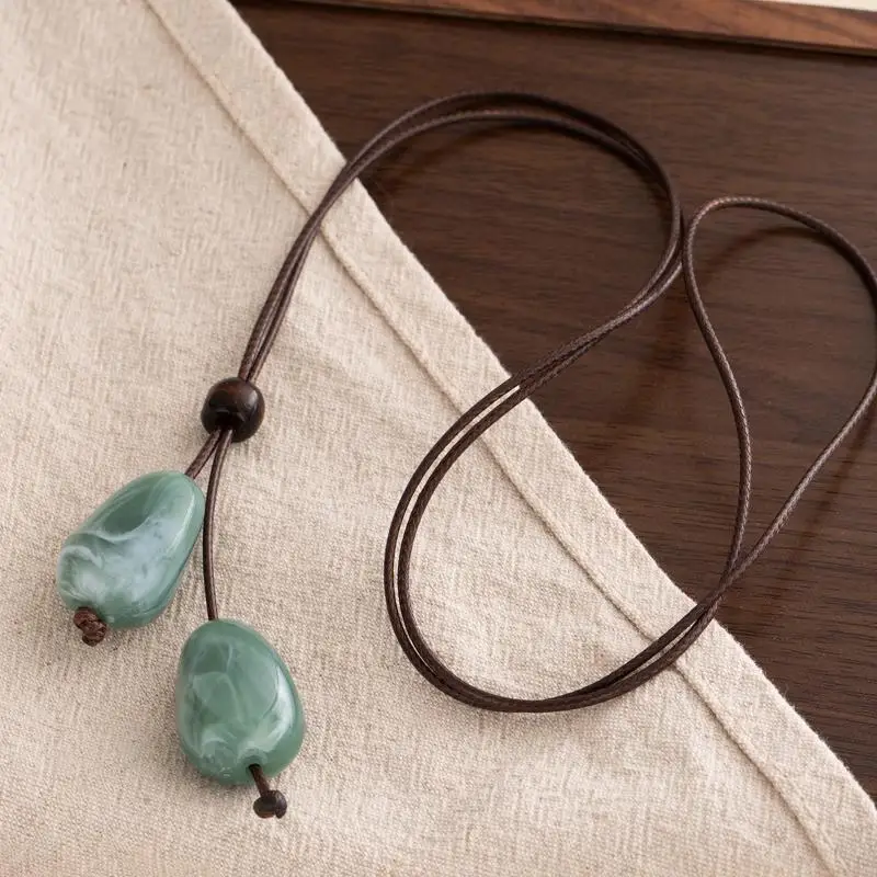 Experience elegance and cultural charm with this long oval pendant necklace featuring a zinc alloy chain available in two metal color options, A1 and A2. Crafted from premium stones with a glossy, polished finish, the necklace showcases a retro zen water drop design inspired by Chinese Mori style. The simple yet luxurious aesthetic is complemented by a natural wooden bead near the top, emphasizing organic beauty. Designed for versatility, this necklace is perfect for various occasions, offering a refined statement of style and craftsmanship. Free from high-concern chemicals, it provides durable durability and sophisticated appeal, making it an ideal accessory for modern, elegant looks.