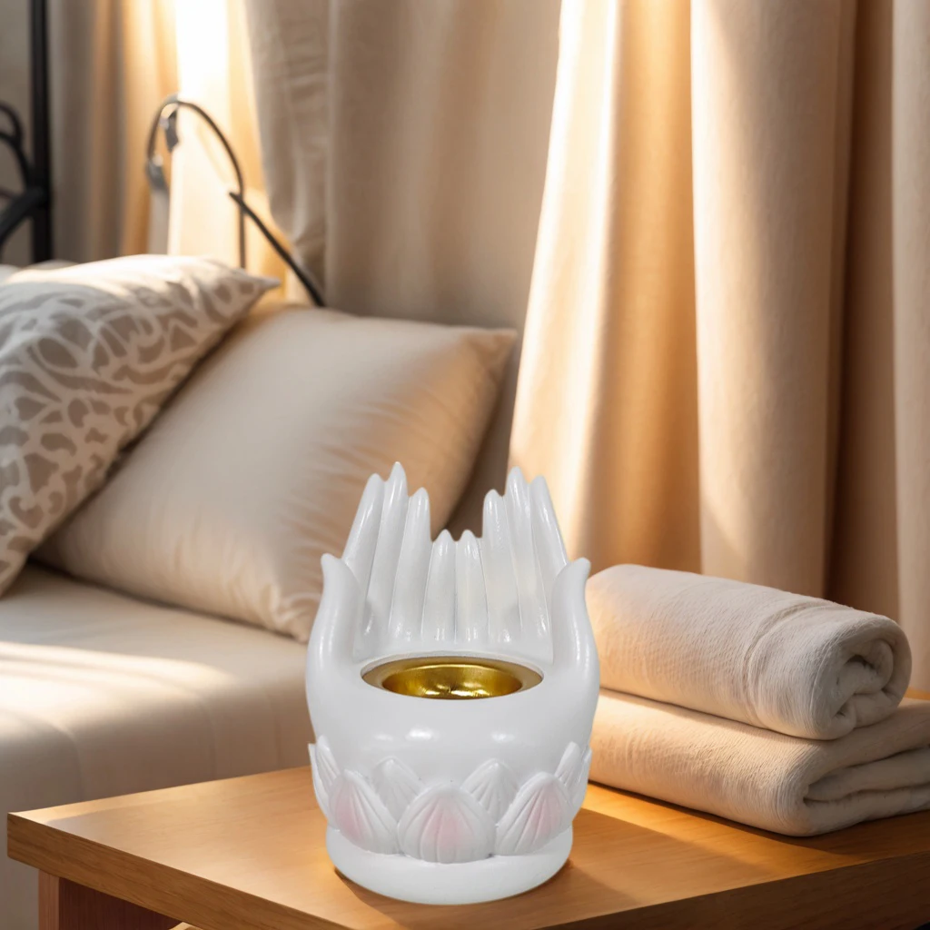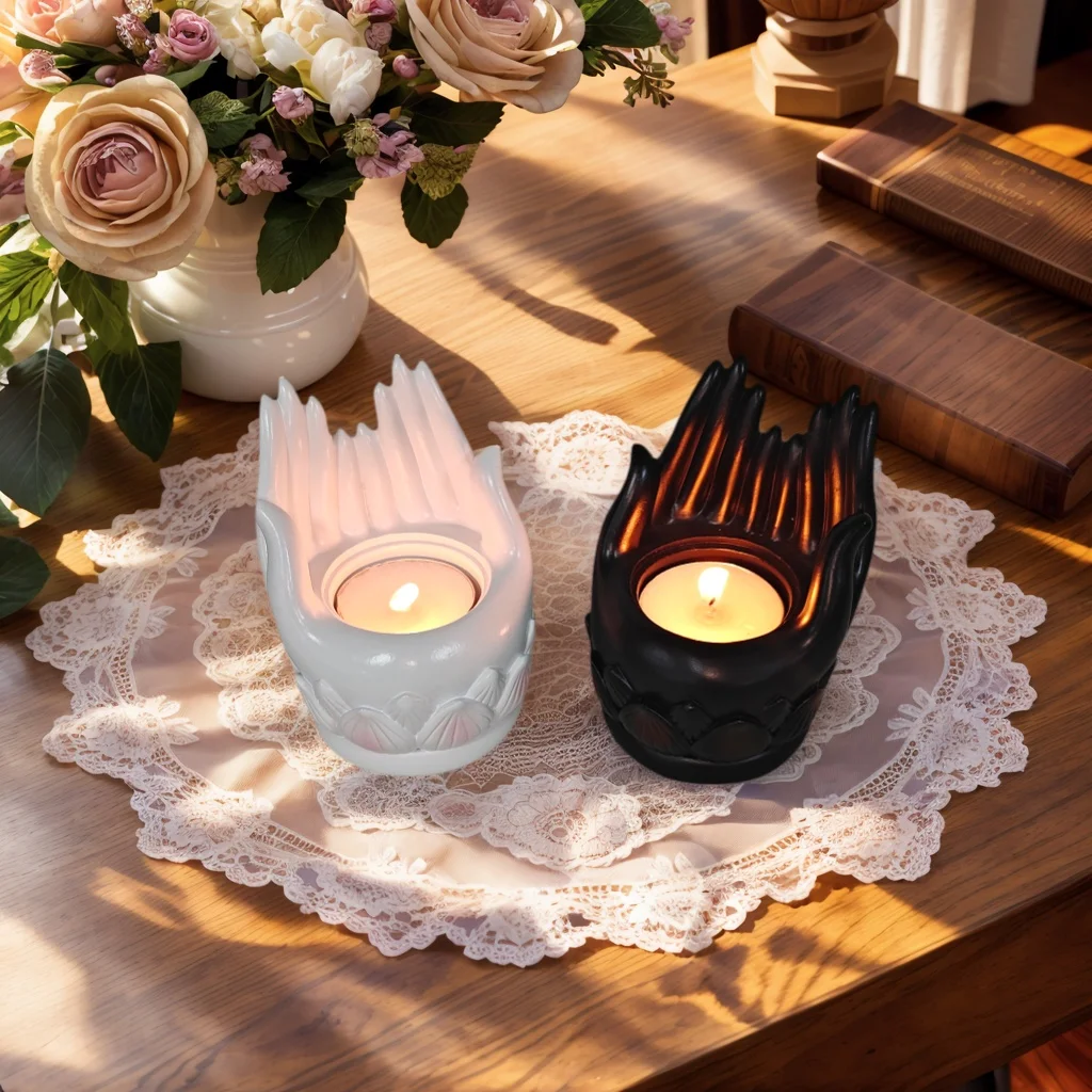 Imagine enhancing your space with this beautiful Lotus-in-Hand Candlestick, a perfect blend of traditional symbolism and modern elegance. Crafted from resin, it features intricate textures resembling petals and leaves at the base, topped with a stylized flame or crown shape reminiscent of lotus flowers. Available in two refined colors—pristine white and sleek black—this decorative ornament adds a tranquil, spiritual touch with its cultural significance of blessings, purity, and holiness. When lit, the white version casts a warm, delicate glow, creating soothing shadows that emphasize craftsmanship, while the black offers a timeless, sophisticated presence. It’s ideal for adding serene beauty to your study, bedroom, or living room, effortlessly elevating your interior decor.