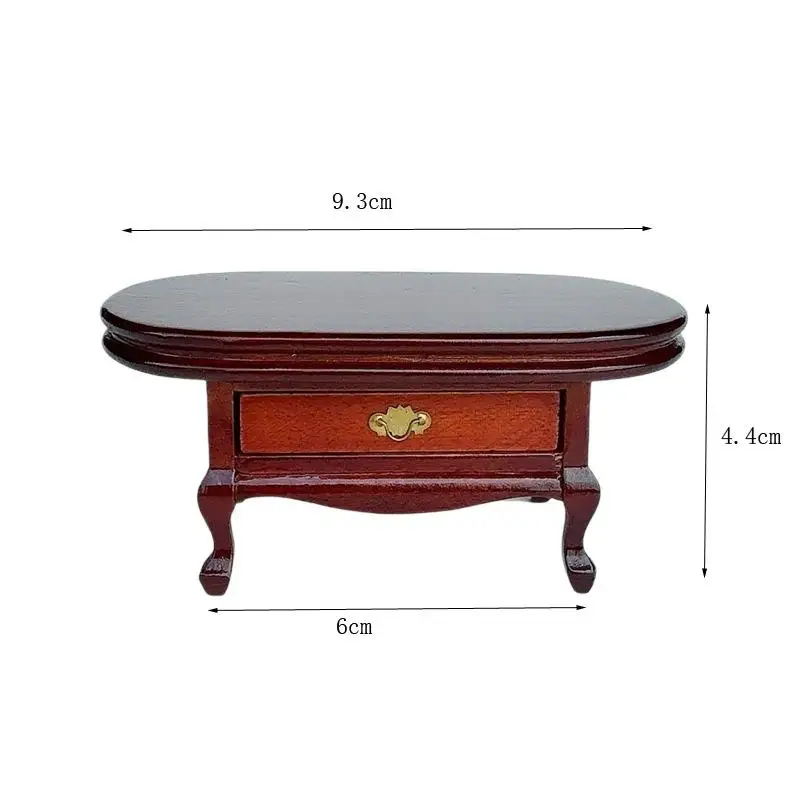 Imagine enhancing your miniature world with this beautifully crafted dollhouse coffee table. Designed with meticulous attention to detail, this piece features a rich, dark brown wooden finish that adds a touch of vintage charm. Its rectangular tabletop is smooth, polished, and slightly rounded along the edges, providing a realistic appearance. The delicate raised border around the tabletop emphasizes its classic style, while the ornate, curved cabriole legs lend elegance and stability. Two tiny, functional drawers with small handles complete the realistic design, perfect for adding charm and utility to your miniature living space. Whether for collection or decoration, this lifelike furniture piece creates a warm, inviting atmosphere in any dollhouse scene.