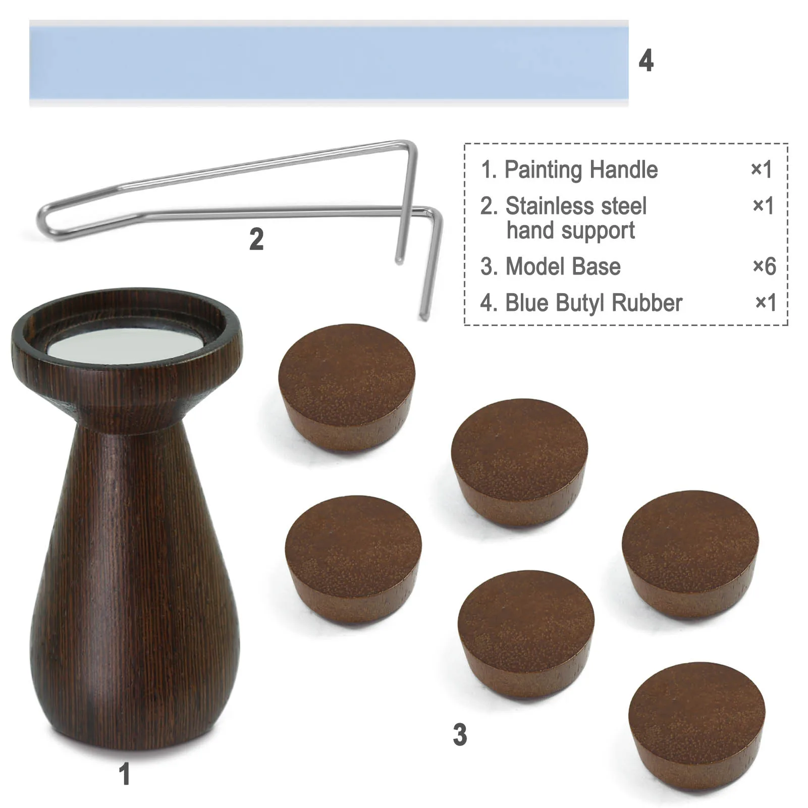 Experience precise control with this handcrafted wood painting handle, available in high rubberwood, high wenge, short rubberwood, and short wenge options. Designed for small-sized models such as human figures and miniature chess pieces, it features a sleek, ergonomic design with a smooth finish that highlights natural wood grain. The handle includes a secure, circular clamp with two metallic support arms that allow 360-degree rotation, providing full visibility for detailed painting from any angle. Perfect for hobbyists and miniature artists aged 18 and above, this lightweight, durable tool ensures steady handling and effortless access to all model details, elevating your craftsmanship to professional standards.