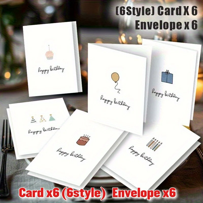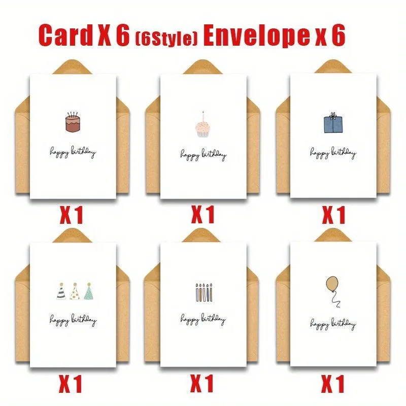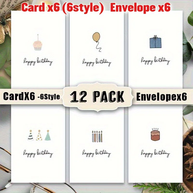 Create heartfelt messages with this set of 12 blank greeting cards and envelopes, perfect for birthdays and celebrations. Each card features an elegant, minimalist design on high-quality paper, adorned with small colorful illustrations like birthday cakes, party hats, balloons, and gift boxes, all accented with delicate cursive “happy birthday” text. The cards are paired with light brown kraft paper envelopes, adding a warm, natural touch. Suitable for thank you notes or personal greetings, these 6 sets (12 cards and 12 envelopes) help you express your warm wishes beautifully and effortlessly, making every occasion special.