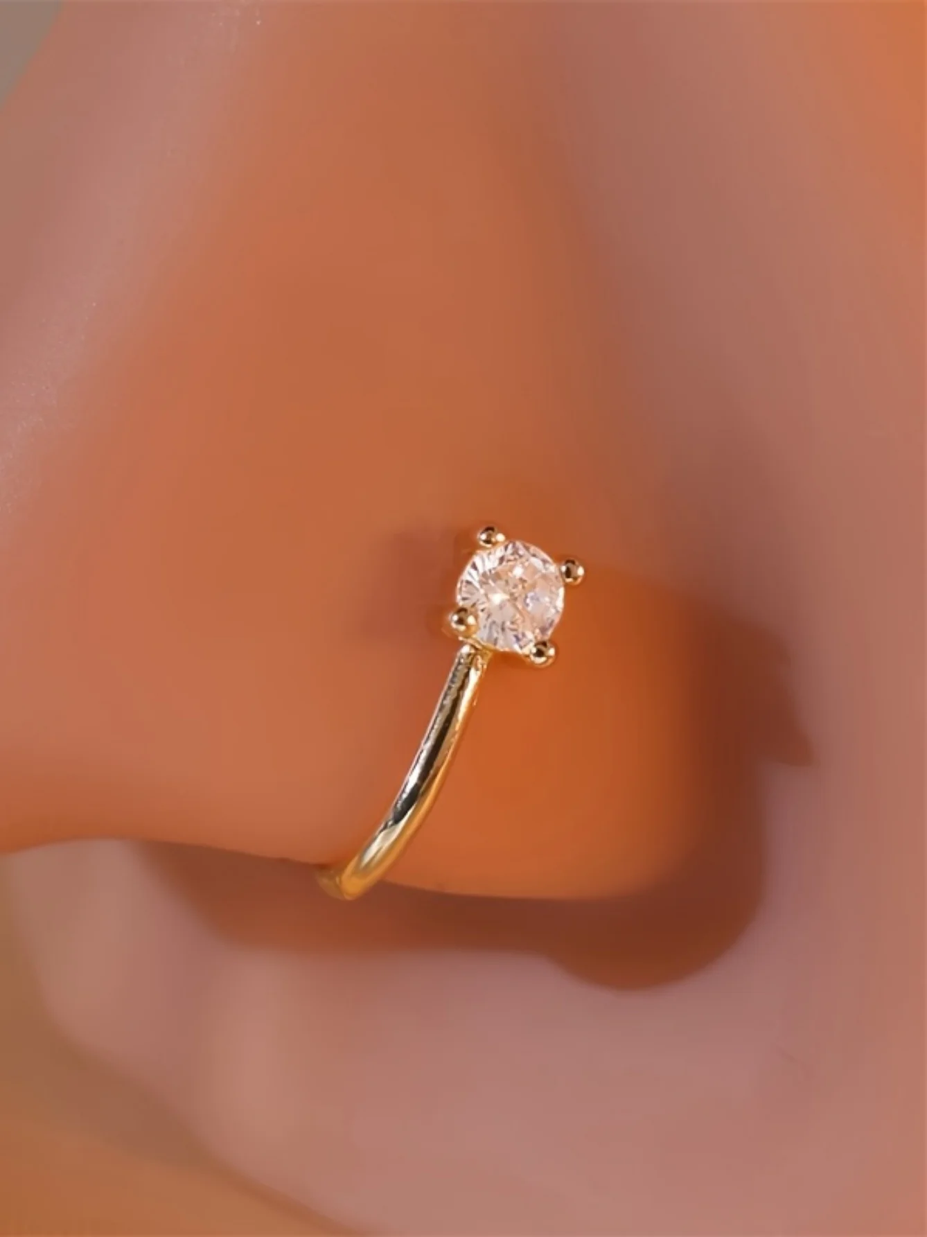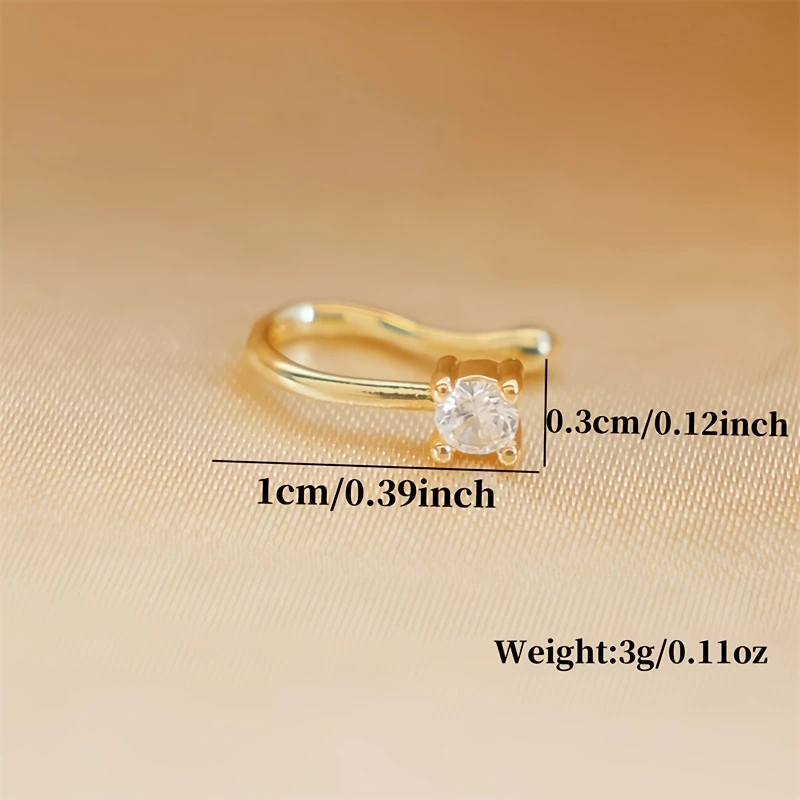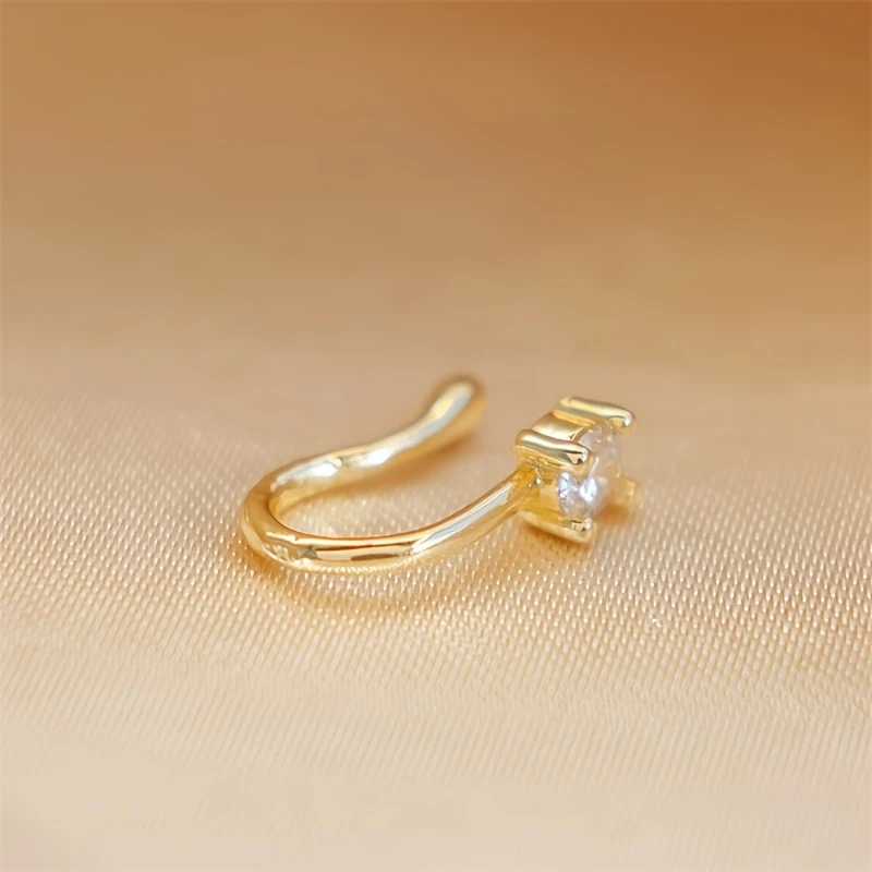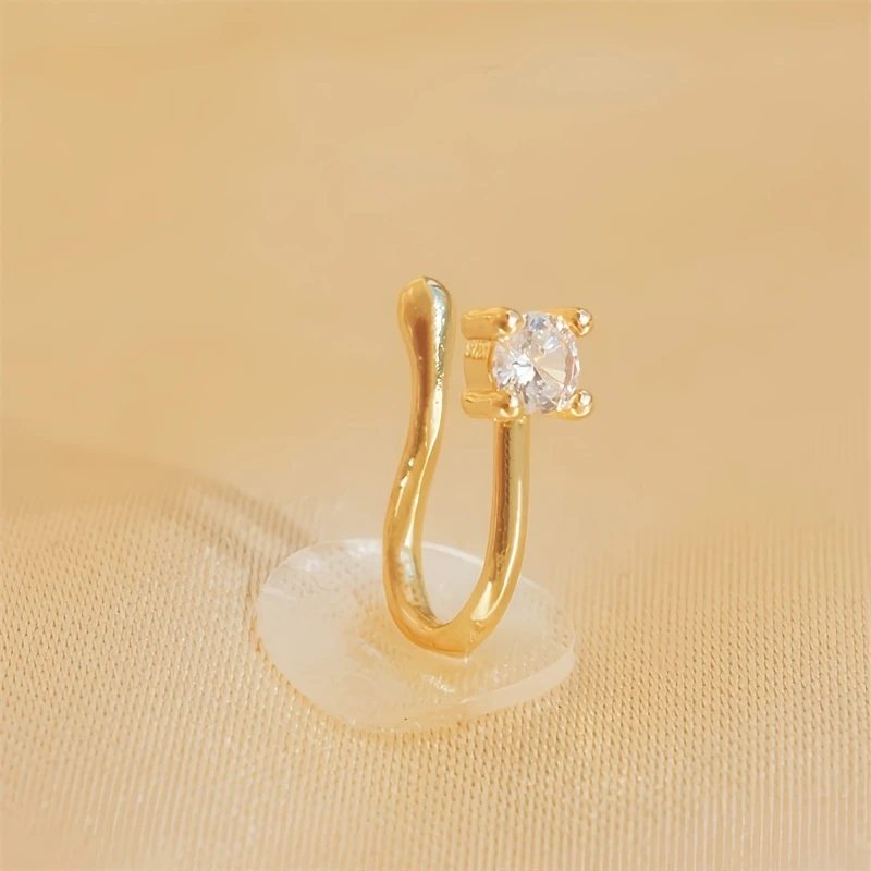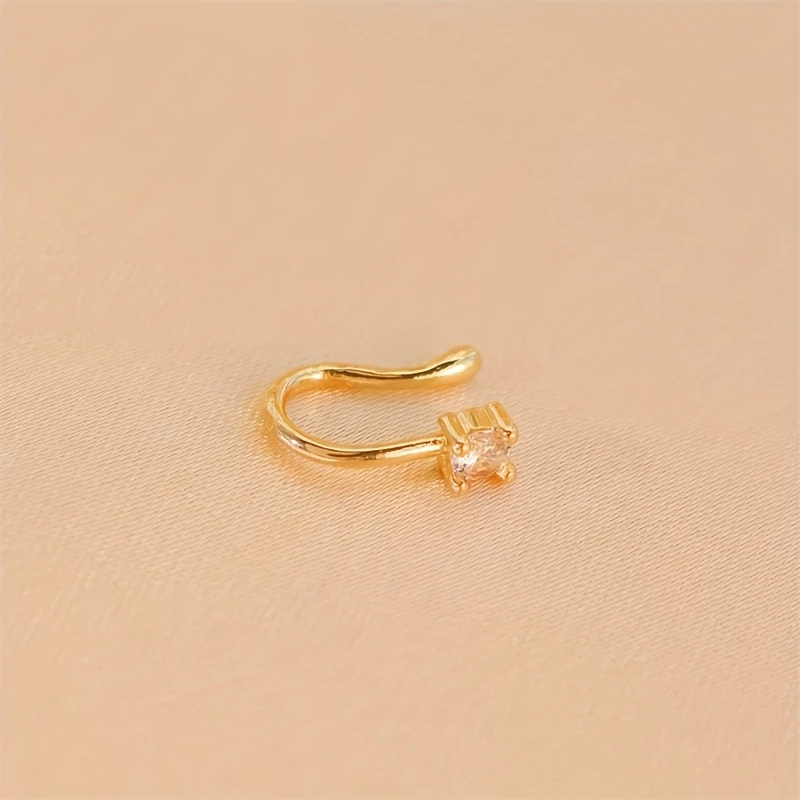 Step into a world of subtle sophistication with this this elegant non-perforated nose ring. Crafted with a delicate, classic round shape, it features a smooth, polished light yellow gold-colored finish that exudes timeless charm. Designed for comfort and style, its adjustable brass construction ensures a perfect fit for any wearer, making it ideal for daily wear or special occasions. The dazzling central clear gemstone, set in a sturdy prong setting, captures light beautifully, adding a touch of brilliance to your look. Perfect for those seeking a refined yet minimalist accessory, this faux nose ring offers an effortless way to enhance your natural beauty without the commitment of an actual piercing.