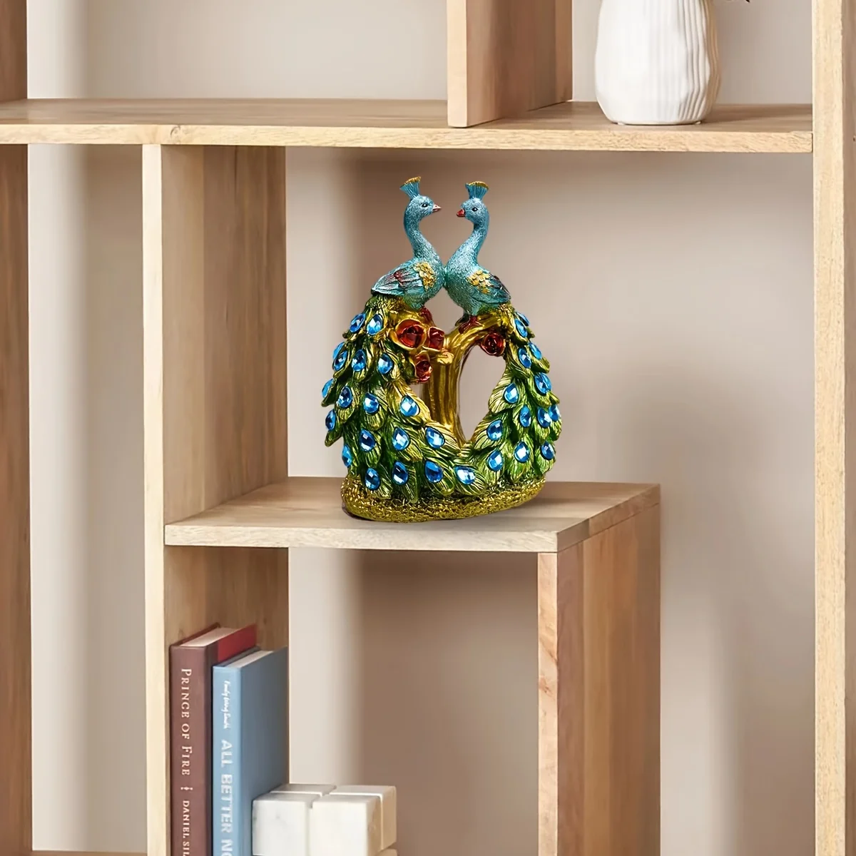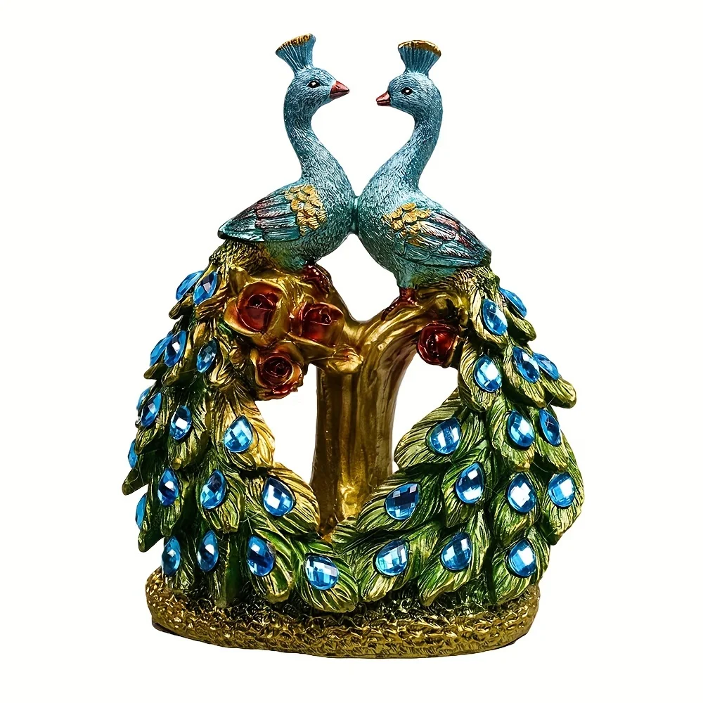 - This vibrant resin ornament features two peacocks facing each other, with intricate feather textures, causing your holiday display to stand out with lively colors and elegant details.