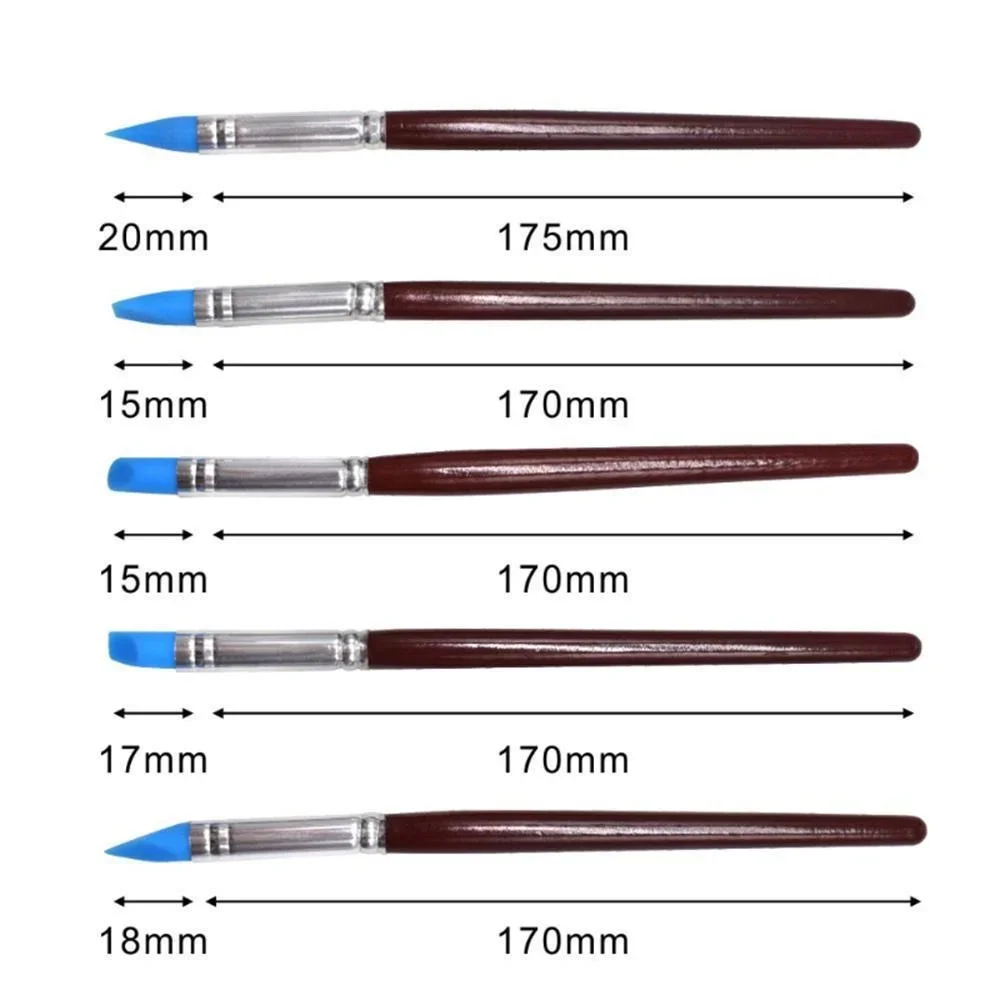 Enhance your sculpting and modeling projects with this set of five wood-handled tools, each approximately 170-175mm long. Featuring smooth, polished dark red wooden handles and shiny metallic silver ferrules, these tools are topped with light blue silicone tips ranging from 15-20mm in length, designed for precision carving, shaping, and smoothing. Ideal for working with clay, wax, pottery, ceramic, or polymer materials, their delicate yet durable construction offers excellent control and convenience for detailed DIY crafts. Elevate your artistry with these professional-grade tools crafted for precise, creative expression in every project.