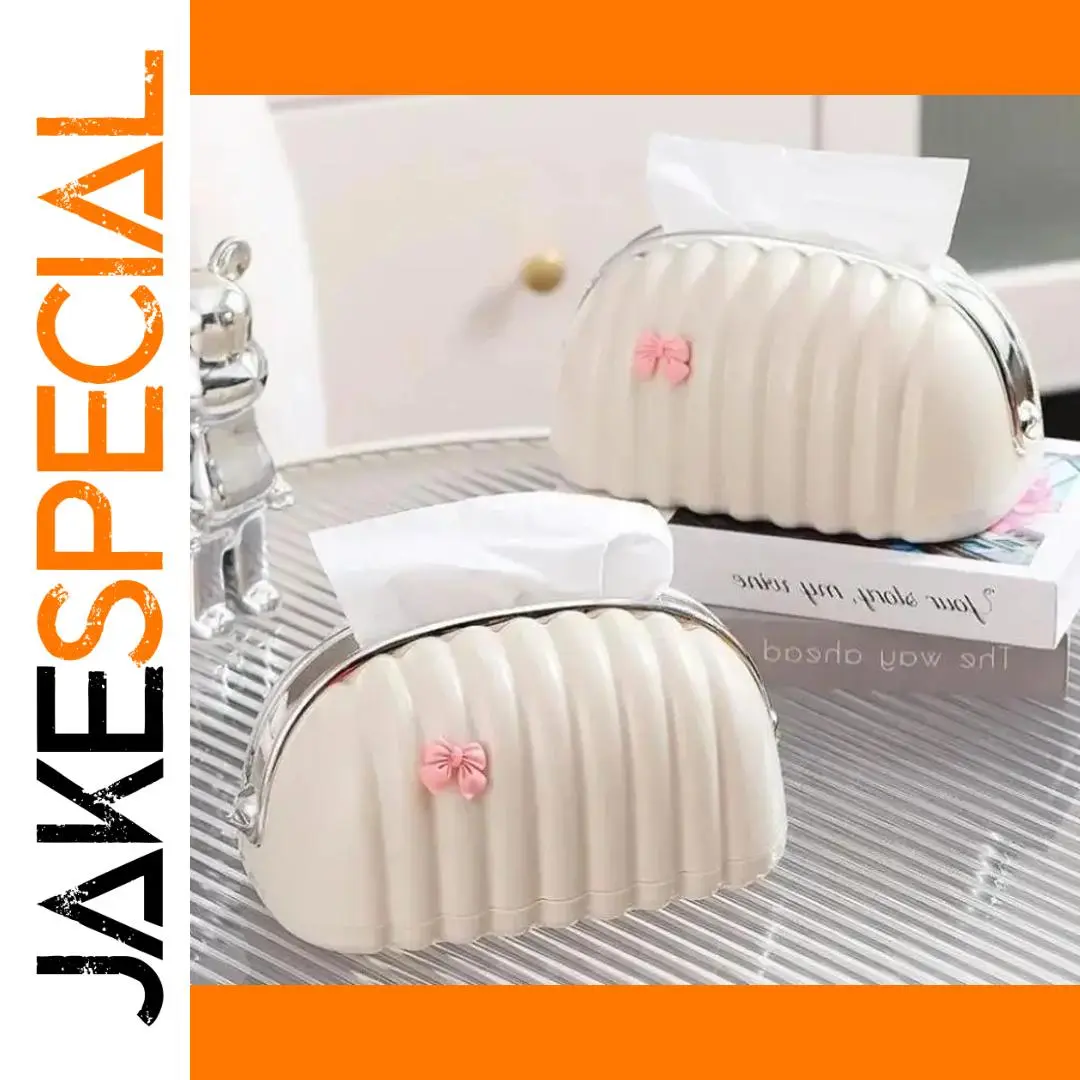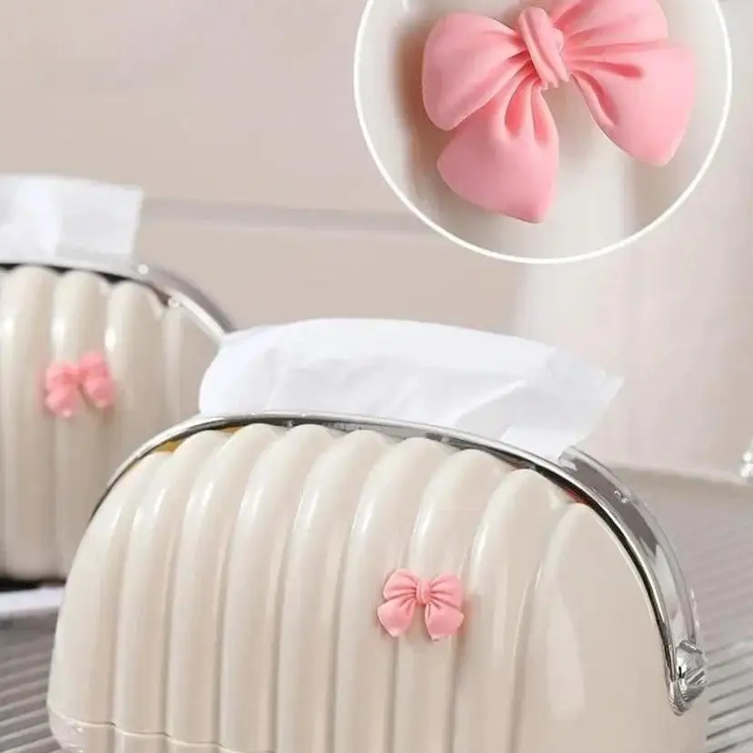 Enhance your living space with this high-end, light luxury shell-shaped tissue box, designed to blend functionality with sophisticated aesthetics. Made from durable plastic, it features a sleek, glossy off-white finish and a unique seashell-inspired shape with vertical ridges that mimic natural textures. The delicate pink bow accent on the front adds a soft touch of elegance, while the shiny metallic rim framing the tissue opening elevates its luxurious appeal. Its compact size and spring-loaded mechanism make tissue access effortless, ensuring quick usability. Perfect for placing on coffee tables, bedside surfaces, or living room settings, this tissue box not only keeps tissues organized but also acts as a stylish décor piece. Its minimalist yet refined design makes it an eye-catching addition to any interior.