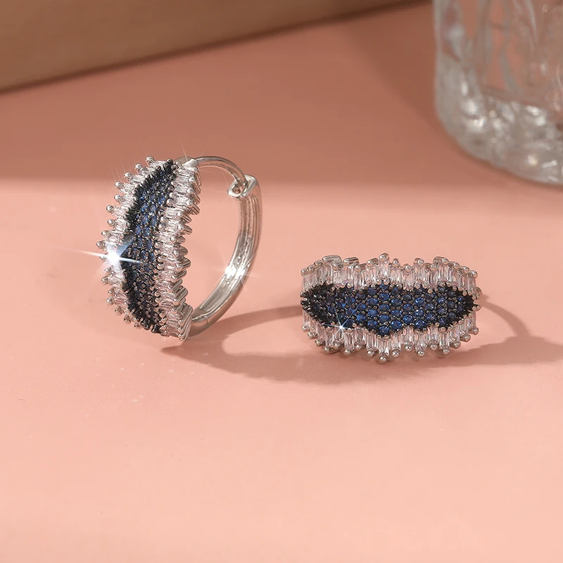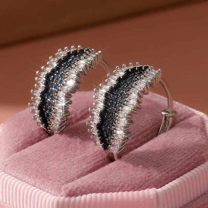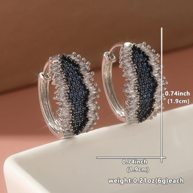 Experience the charm of these stunning silver-colored hoop earrings, crafted with a sleek copper alloy base. Their elongated oval, geometric shape adds a modern touch, while the radiant deep blue cubic zirconia stones create a captivating sparkle. The densely set stones inside the hoop bring both texture and depth, making these earrings perfect for elevating any outfit. Whether you're attending a celebration, getting married, or simply enjoying daily wear, these earrings seamlessly blend elegance and trendiness. They are lightweight and comfortable, ideal for women and girls who want a versatile accessory. Their polished silver finish or optional gold tone provides a stylish, sophisticated look suited to any occasion and personal style.