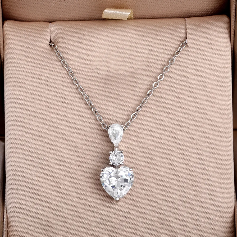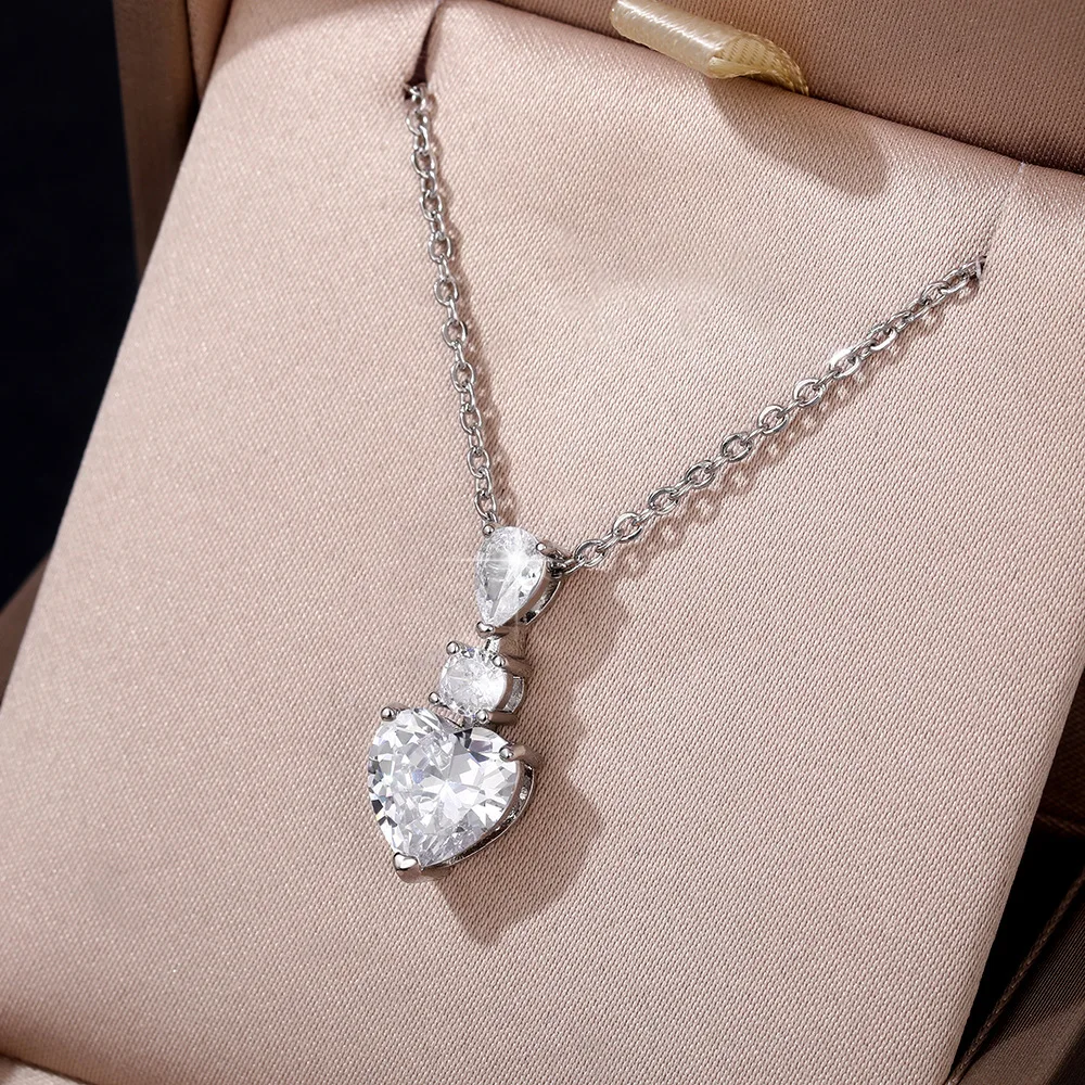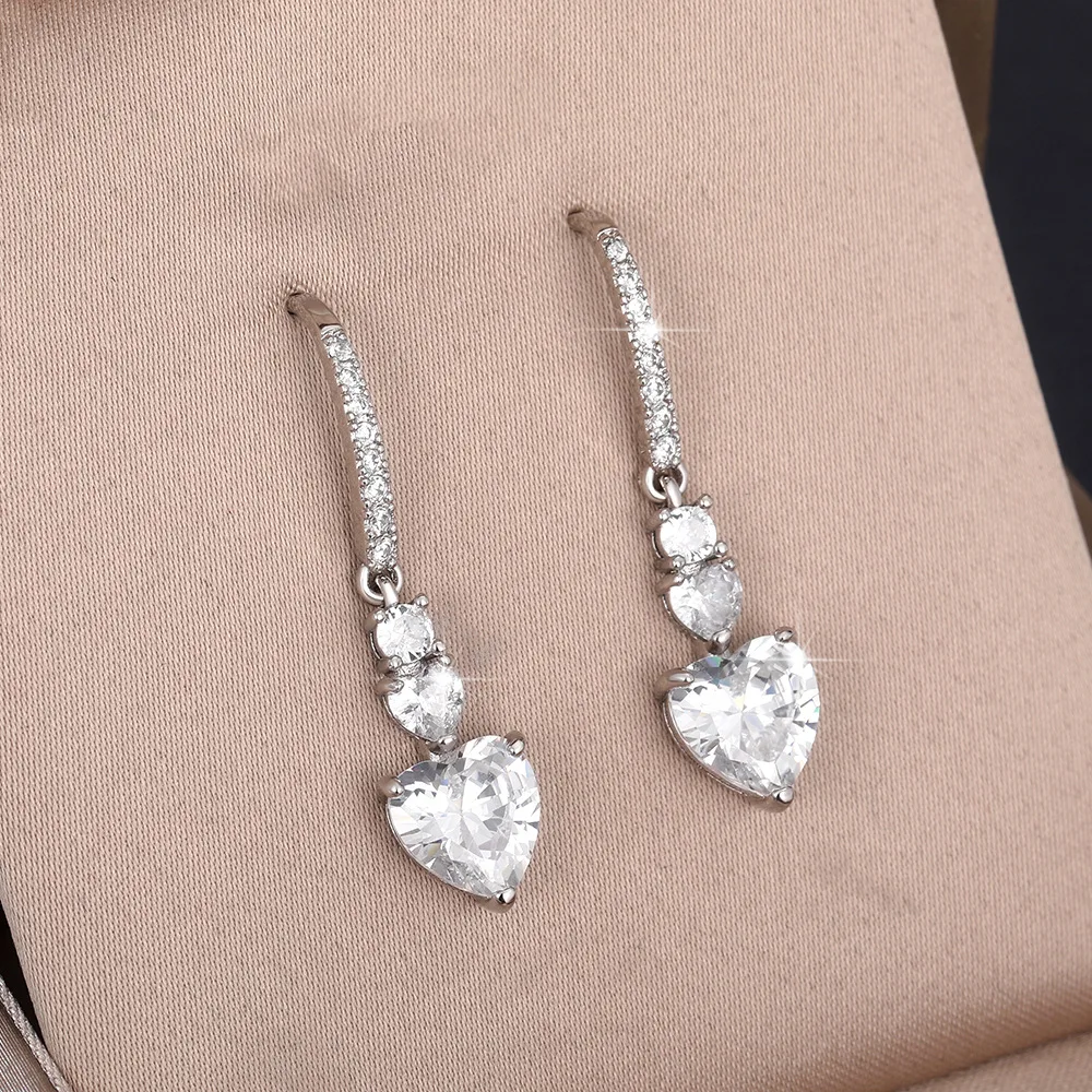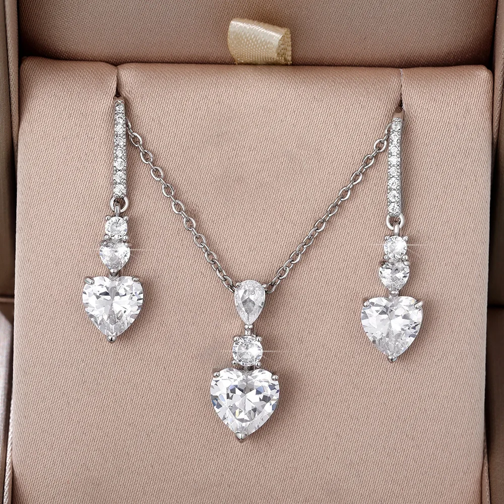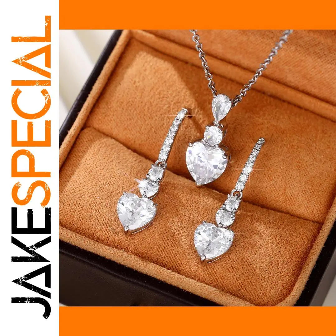 - Includes a love heart-shaped necklace with a cascading pendant featuring teardrop, round, and heart-shaped crystals, complemented by matching earrings with vertical crystal arrangements and tiny embedded stones.