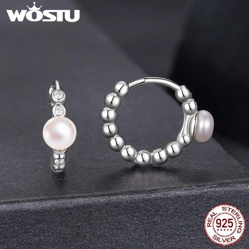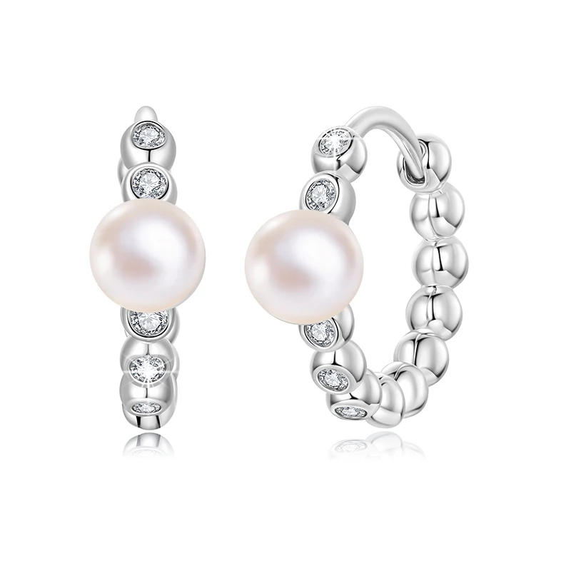 Experience timeless elegance with these stunning hoop earrings, crafted from genuine 925 sterling silver with a platinum finish for superior shine and durability. The design features a sleek, round shape adorned with textured silver beads, creating a sophisticated textured aesthetic. Centered on each hoop is a lustrous white pearl measuring approximately 0.4 to 0.5 centimeters, adding classical grace. Interspersed with small, clear moissanite stones of 0.12 centimeters (0.008 carats), boasting a D color grade, EX cut, and VVS1 clarity, they radiate brilliance. The inner diameter of 1.3 centimeters ensures a comfortable fit, making these earrings perfect for special occasions such as weddings, anniversaries, or gifting to loved ones. Elevate your jewelry collection with these exquisite pieces that blend modern sparkle with timeless style.