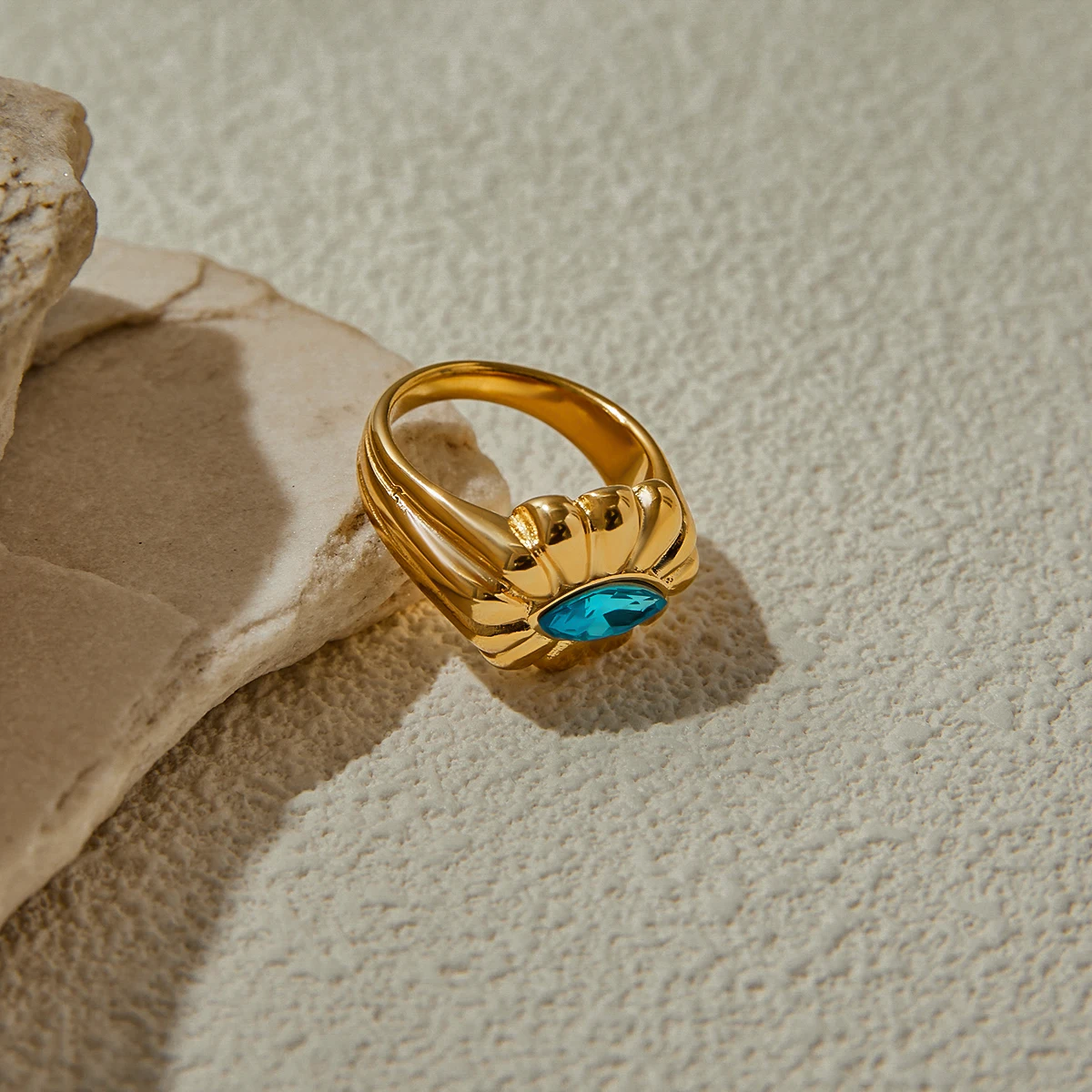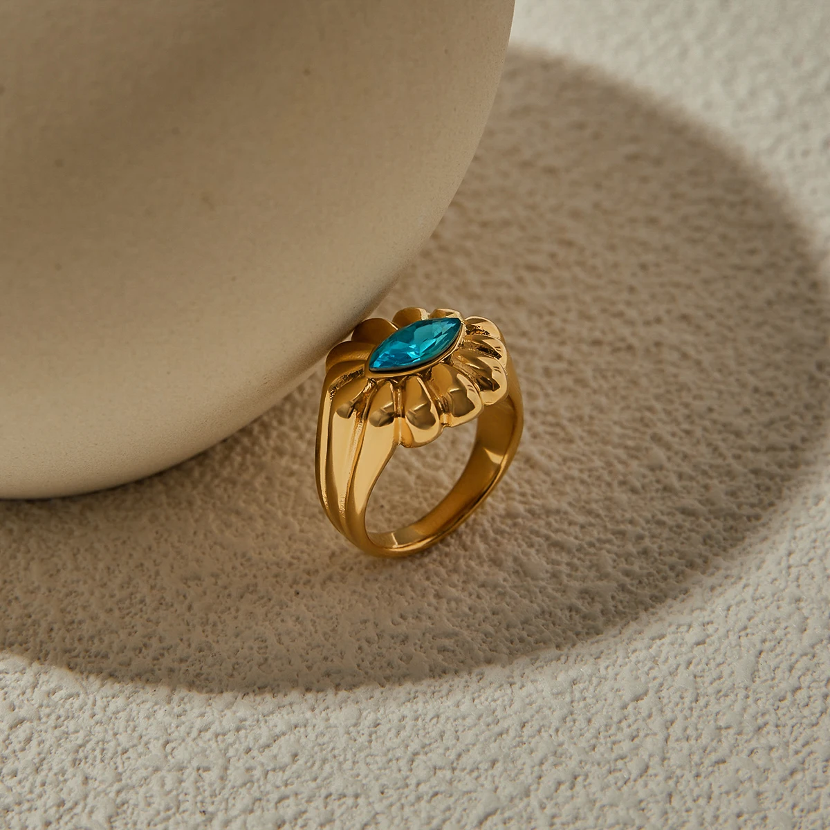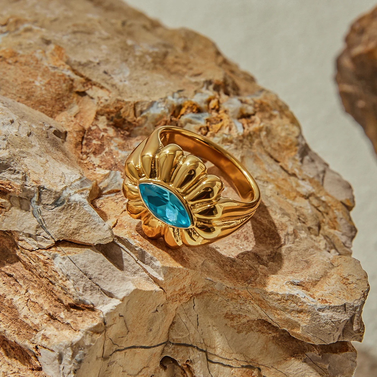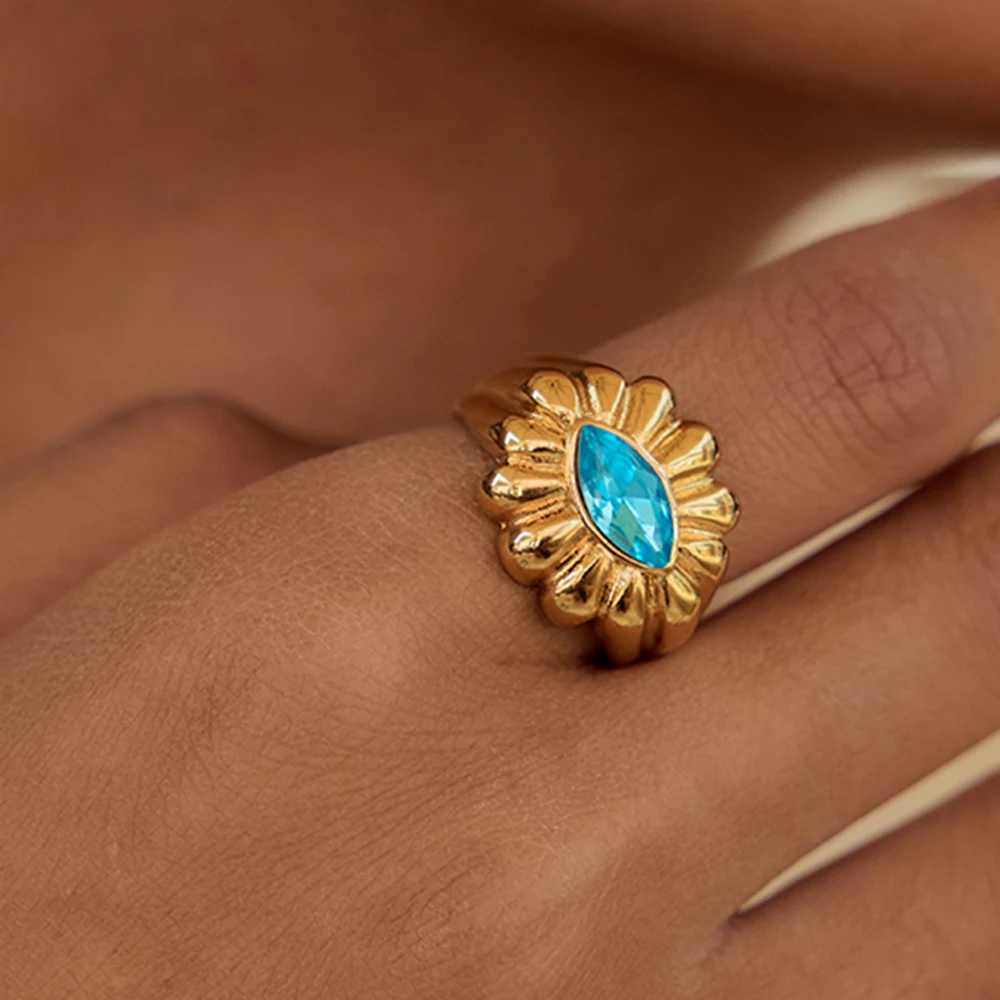 Experience the stunning beauty of this fashionable blue zircon flower ring, crafted from durable stainless steel with a PVD gold coating. Its intricate design features a water drop-shaped blue zircon stone set in a radiant floral pattern, capturing light beautifully and adding a touch of sophistication. The ring’s delicate 2mm band complements the vibrant gemstone and tiny pave-set white zircon accents, creating a sparkling textured surface that enhances its modern yet elegant aesthetic. Perfect for parties or stylish outings, this jewelry combines luxurious appearance with durability and comfort. Imagine yourself wearing this eye-catching piece, completing your look with confidence and grace. Its waterproof, nickel-free, lead-free, and cadmium-free properties make it a reliable choice for everyday and special occasions alike, blending fashion with quality seamlessly.