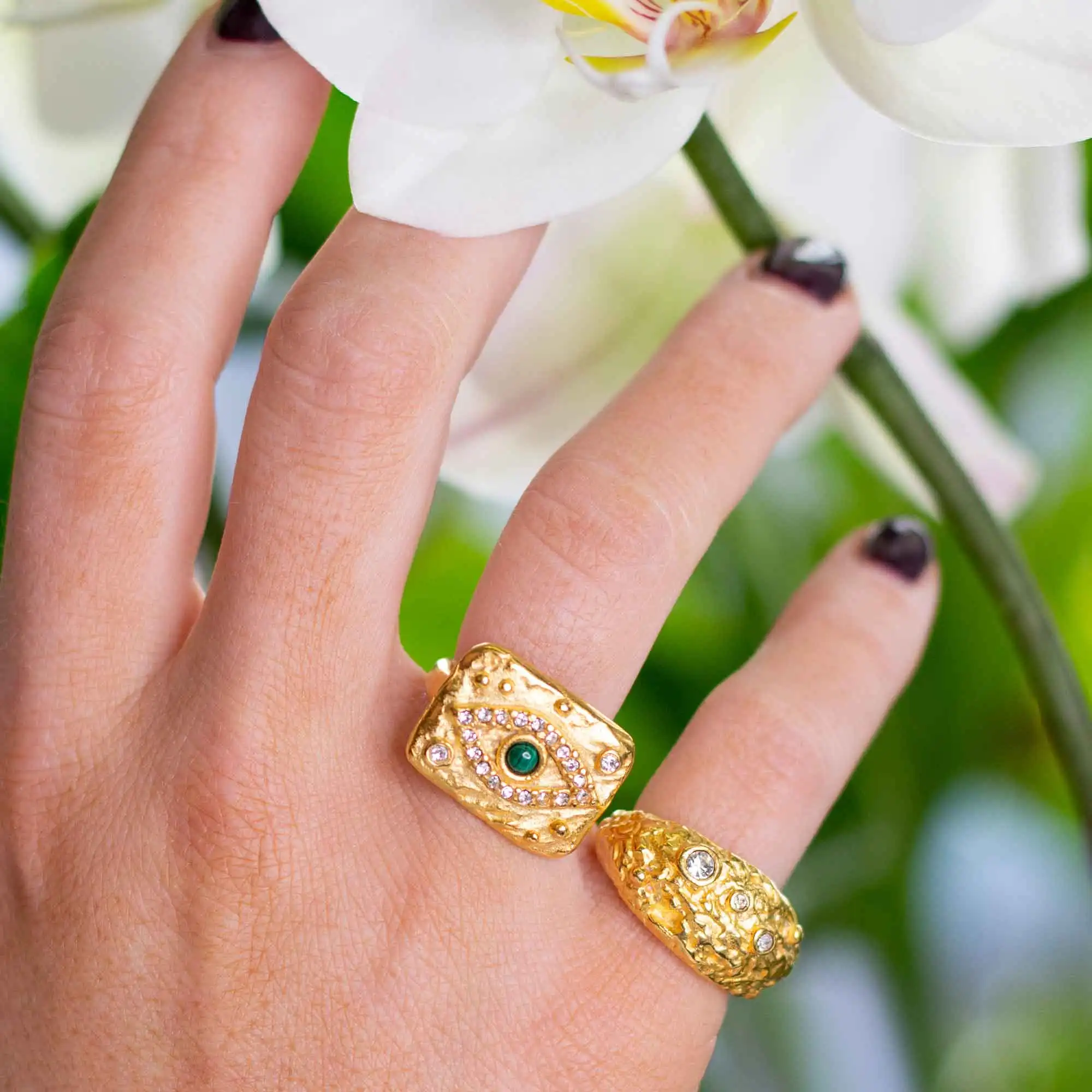 - Features vibrant, genuine malachite and purple gemstones, adding a luxurious and colorful touch with the eye motif at the center.