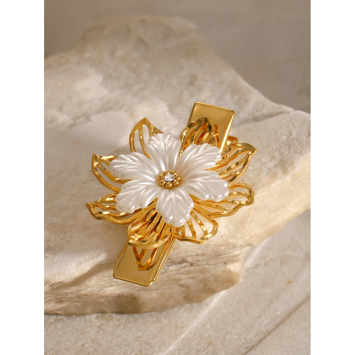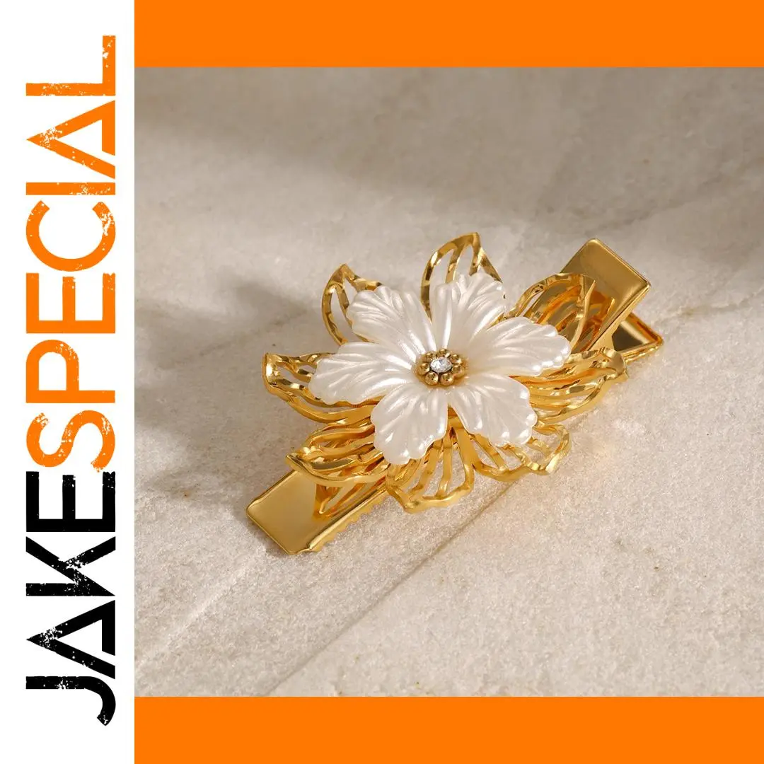 Picture yourself enhancing your style with this stunning flower hairpin, designed to bring sophistication and charm to any look. Crafted from high-quality stainless steel with a PVD gold finish, this accessory boasts a long-lasting, scratch-resistant, and waterproof construction. Its large, layered flower features smooth, glossy petals in a pearl-like white with an iridescent sheen that catches the light beautifully. At the center, a delicate clear rhinestone surrounded by tiny gold beads adds a subtle sparkle. The open filigree base creates an airy, refined silhouette, perfectly blending trendy and elegant styles. Weighing 50.2 grams, it offers a comfortable yet substantial feel that stays secure in your hair throughout your day or evening event.