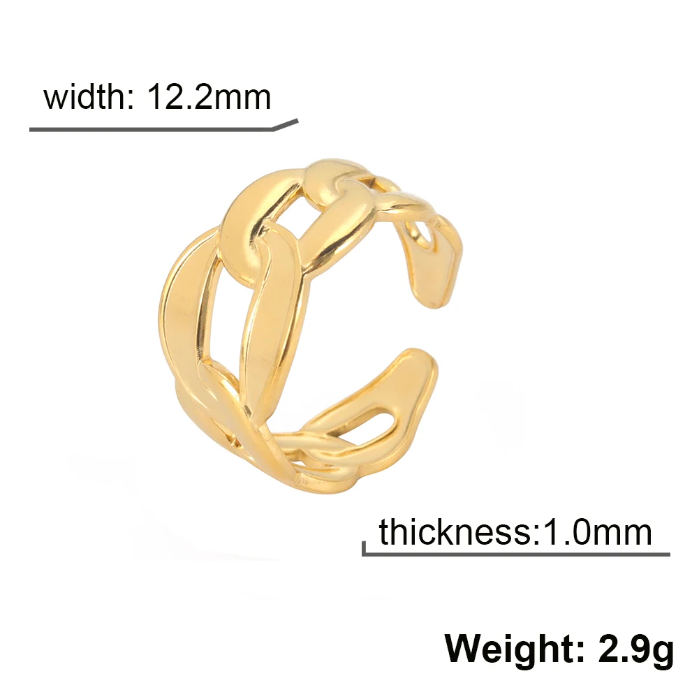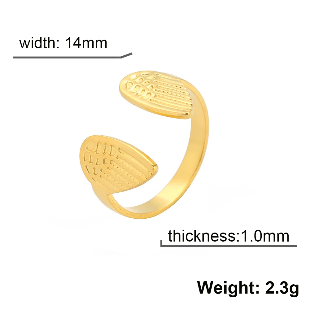 - Technical specifications: stainless steel core, 18k gold plating, polished shiny finish, open-ended adjustable design, compatible with most finger sizes, resistant to corrosion and tarnish.
