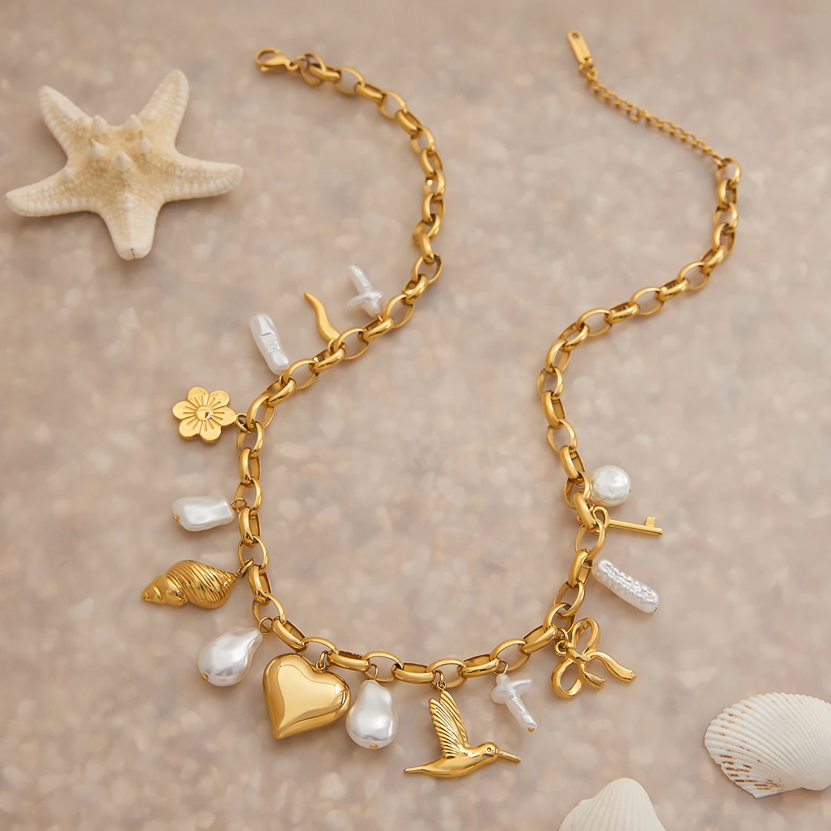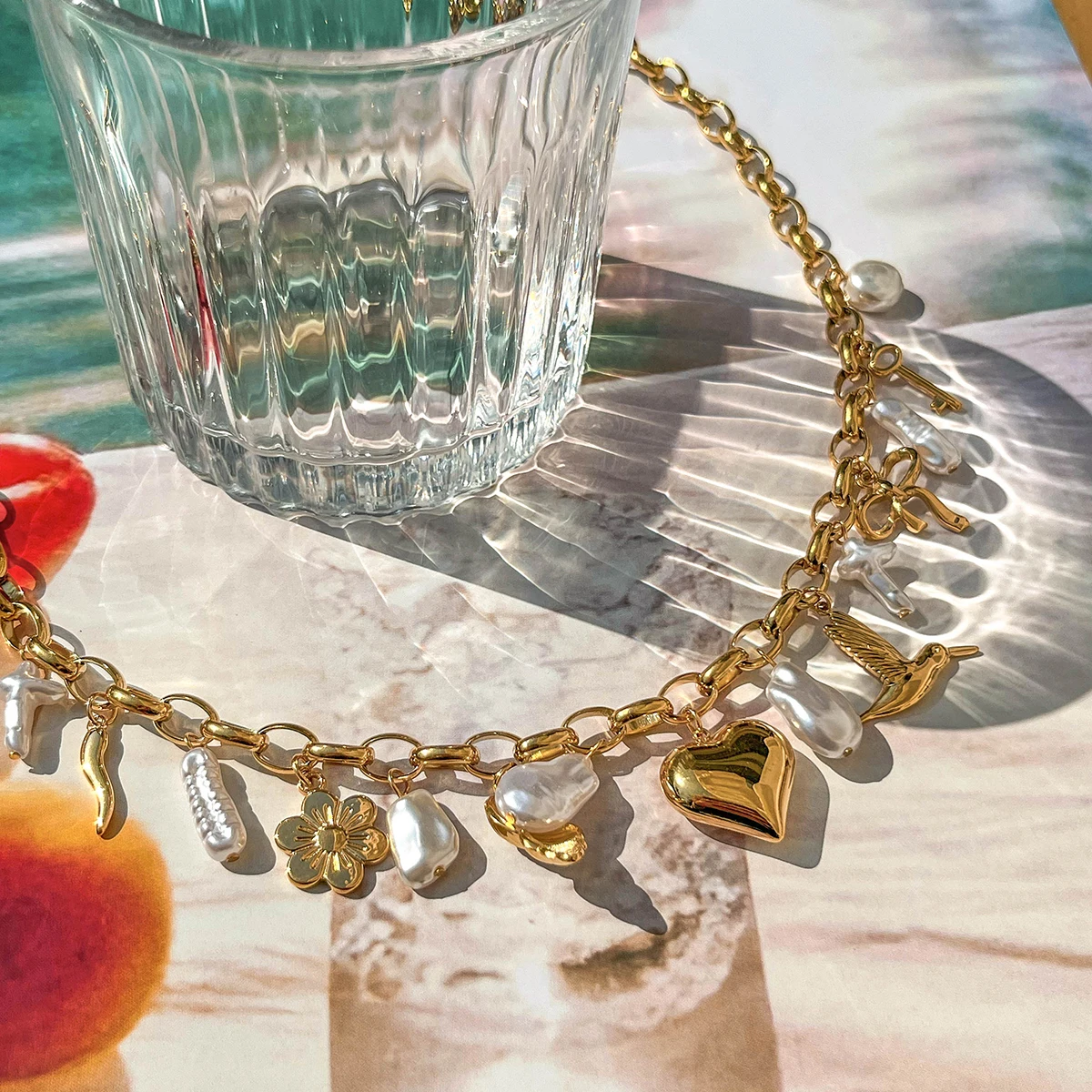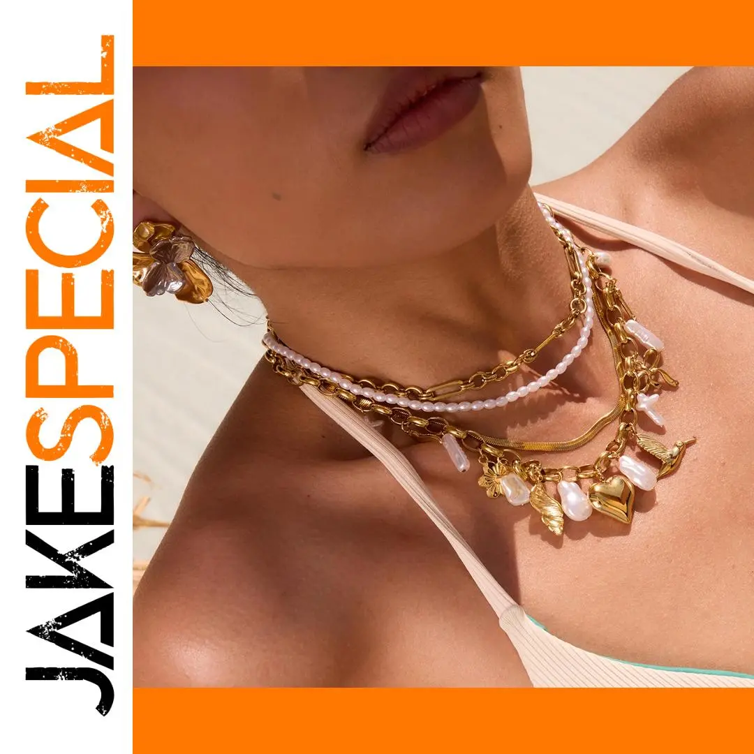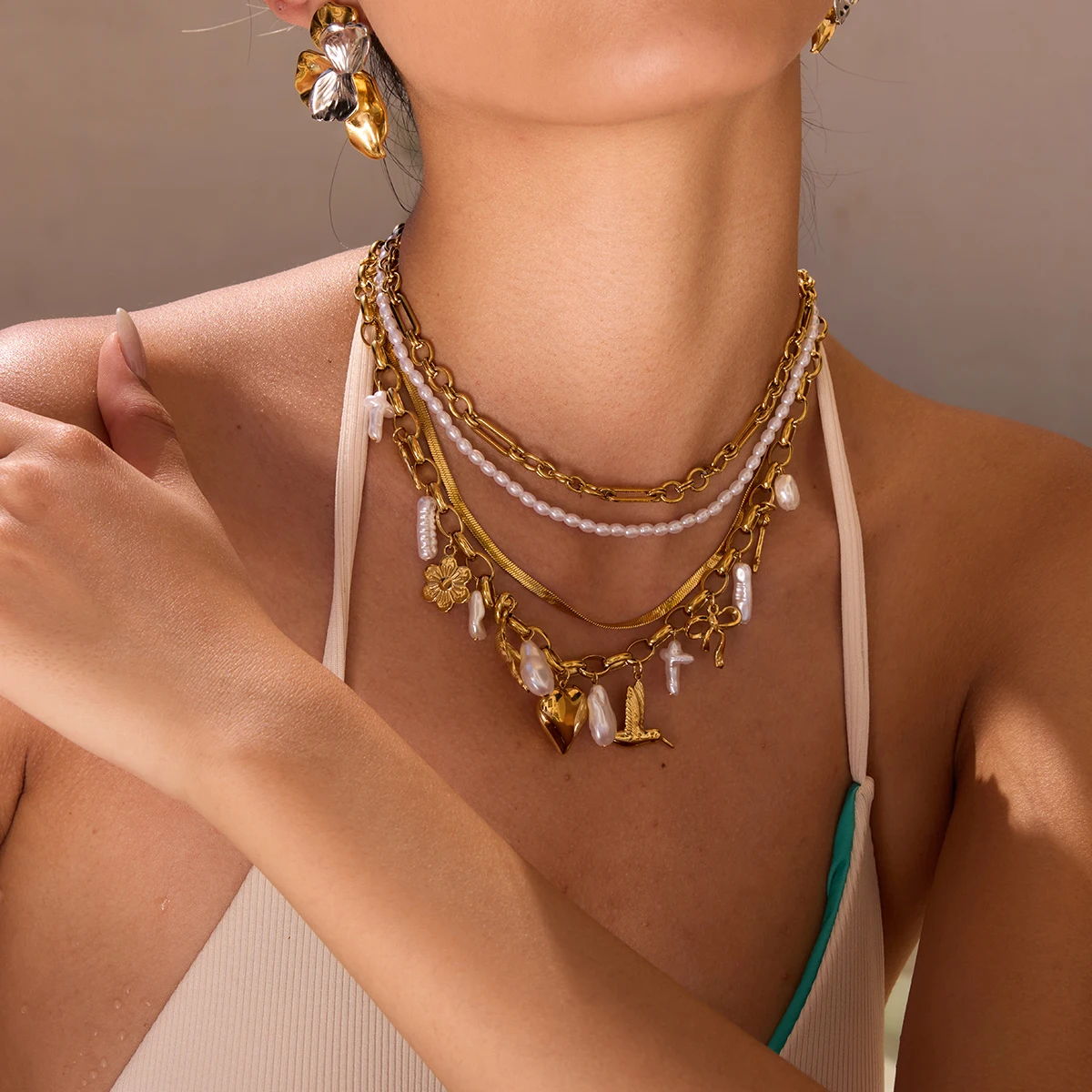 Imagine elevating your style effortlessly with this stunning women's pendant necklace. Crafted from durable stainless steel with a PVD gold finish, it offers a shiny, long-lasting appearance resistant to scratches and fading. The layered design features a sleek link chain, a delicate string of white pearls, and a broad flat gold chain, all harmoniously combined for a trendy yet luxurious look. The focal point, a heart-shaped pendant adorned with a conch flower motif and a large, irregular white pearl, adds a unique organic touch that enhances your fashionable appeal. Light and comfortable to wear, this jewelry piece is perfect for any occasion, transforming your outfit into a statement of elegance and modern chic.