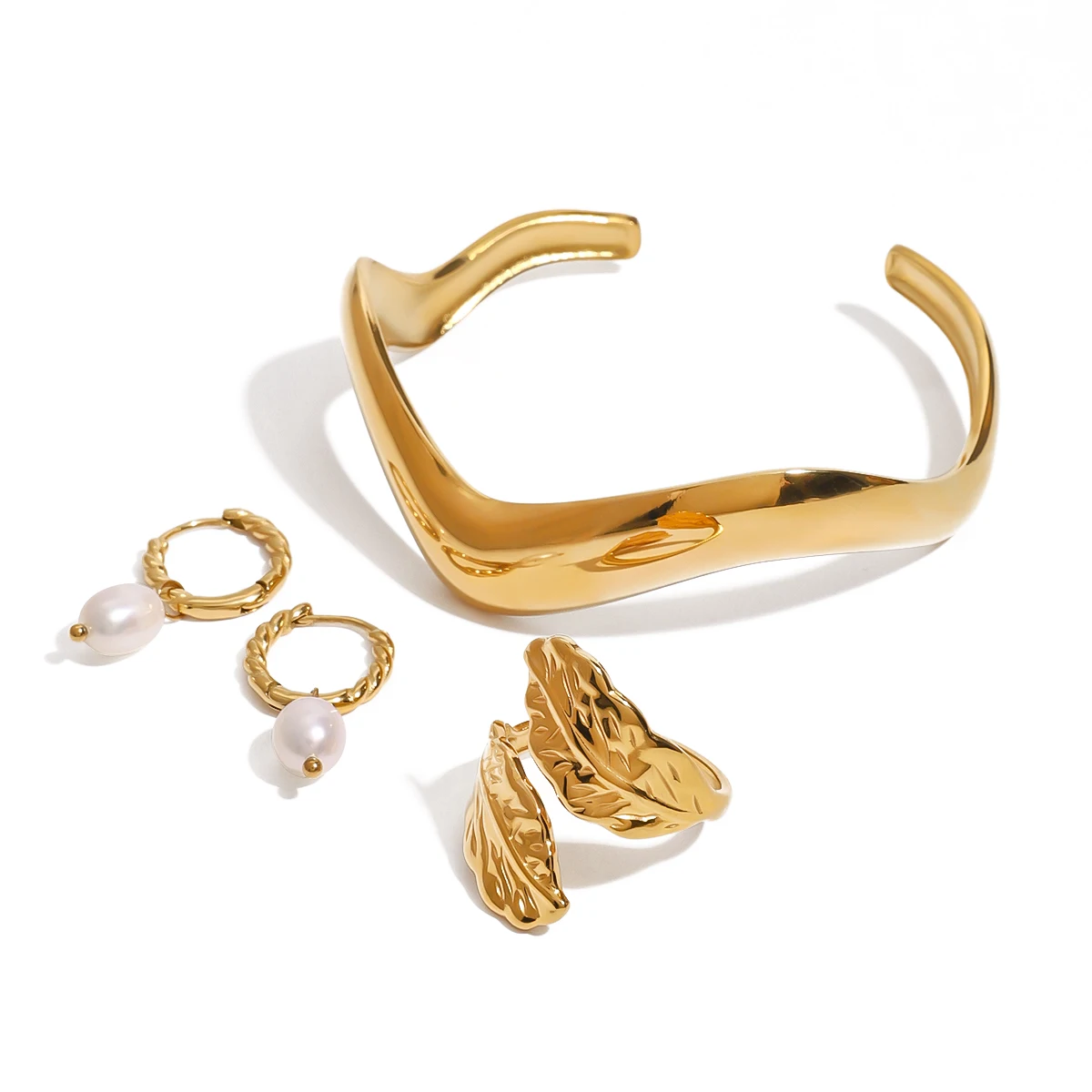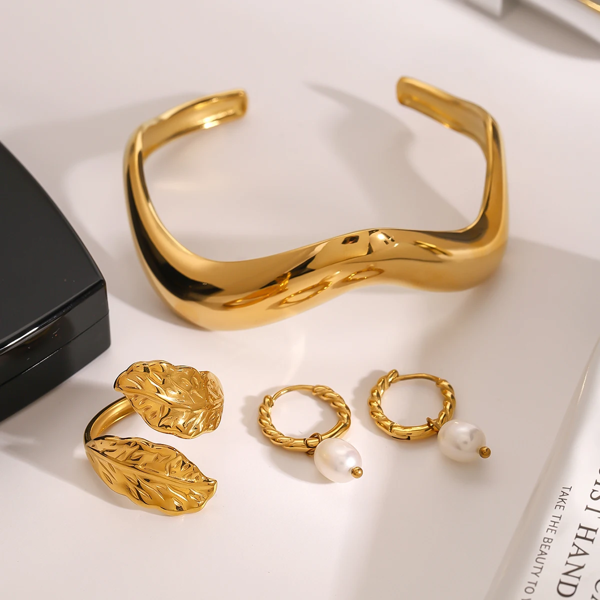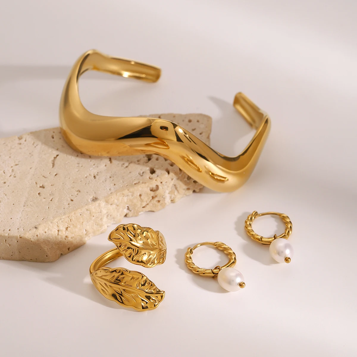 Elevate your jewelry collection with this stylish 4-piece set crafted from stainless steel with PVD gold, featuring waterproof, fade-resistant, and scratch-proof durability. The set includes elegant pearl earrings with teardrop-shaped white pearls on textured gold hooks, two leaf-shaped rings with realistic vein details, and a sleek, irregular open cuff bracelet with a shiny gold finish. Weighing only 15 grams, these contemporary pieces showcase plant-inspired patterns, perfect for adding a touch of elegance to special occasions like engagements or casual outings. Designed for women, this collection combines trendy design with long-lasting quality, ensuring you look sophisticated and feel confident wherever you go.