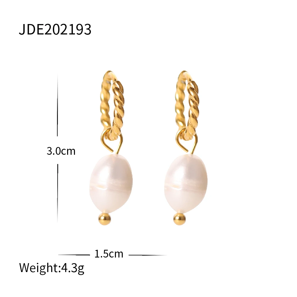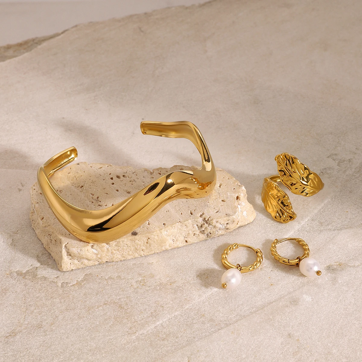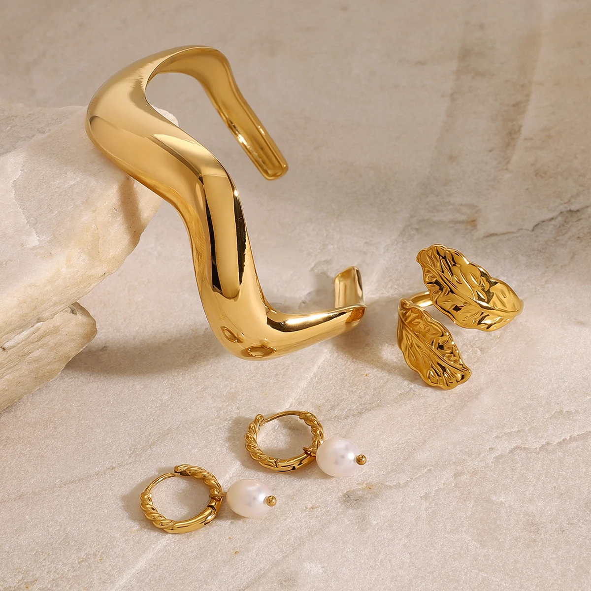 Elevate your jewelry collection with this stylish 4-piece set crafted from stainless steel with PVD gold, featuring waterproof, fade-resistant, and scratch-proof durability. The set includes elegant pearl earrings with teardrop-shaped white pearls on textured gold hooks, two leaf-shaped rings with realistic vein details, and a sleek, irregular open cuff bracelet with a shiny gold finish. Weighing only 15 grams, these contemporary pieces showcase plant-inspired patterns, perfect for adding a touch of elegance to special occasions like engagements or casual outings. Designed for women, this collection combines trendy design with long-lasting quality, ensuring you look sophisticated and feel confident wherever you go.