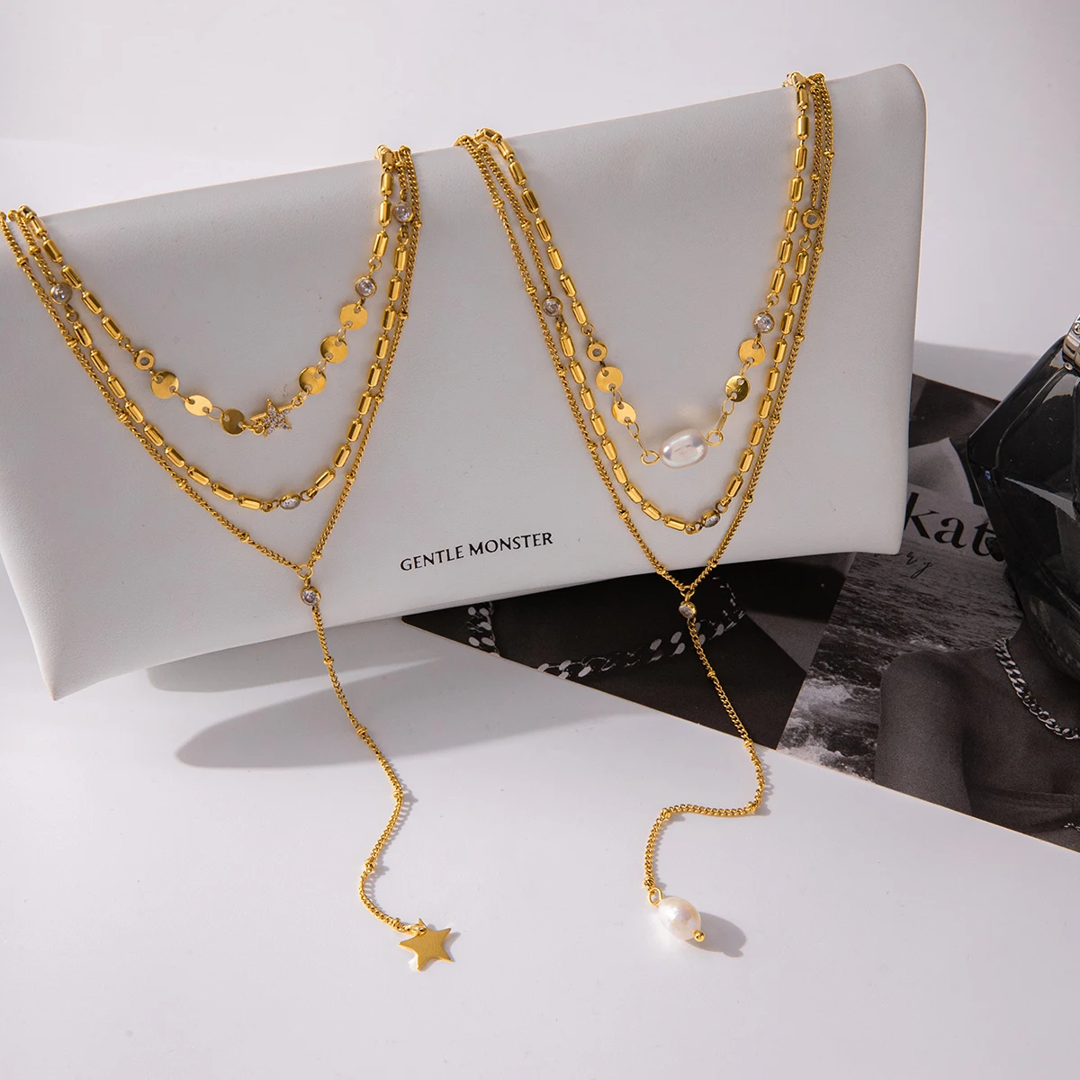 Experience the timeless charm of this this three-layer gold-tone stainless steel necklace, designed to elevate your style at any party or special occasion. Featuring a sophisticated Y-shape, the necklace combines delicate and bold elements, such as a fine chain with pearl inlays, a textured chain with zircon accents, and a statement pearl drop. The warm gold color exudes luxury and complements various outfits, making it a versatile addition to your jewelry collection. Crafted with durable stainless steel, this piece offers long-lasting shine and resistance to tarnishing. Its classic design ensures you'll feel confident and elegant whether attending a party or making a statement at an elegant event. Enjoy the beauty and quality of this refined accessory that suits any fashionable look.