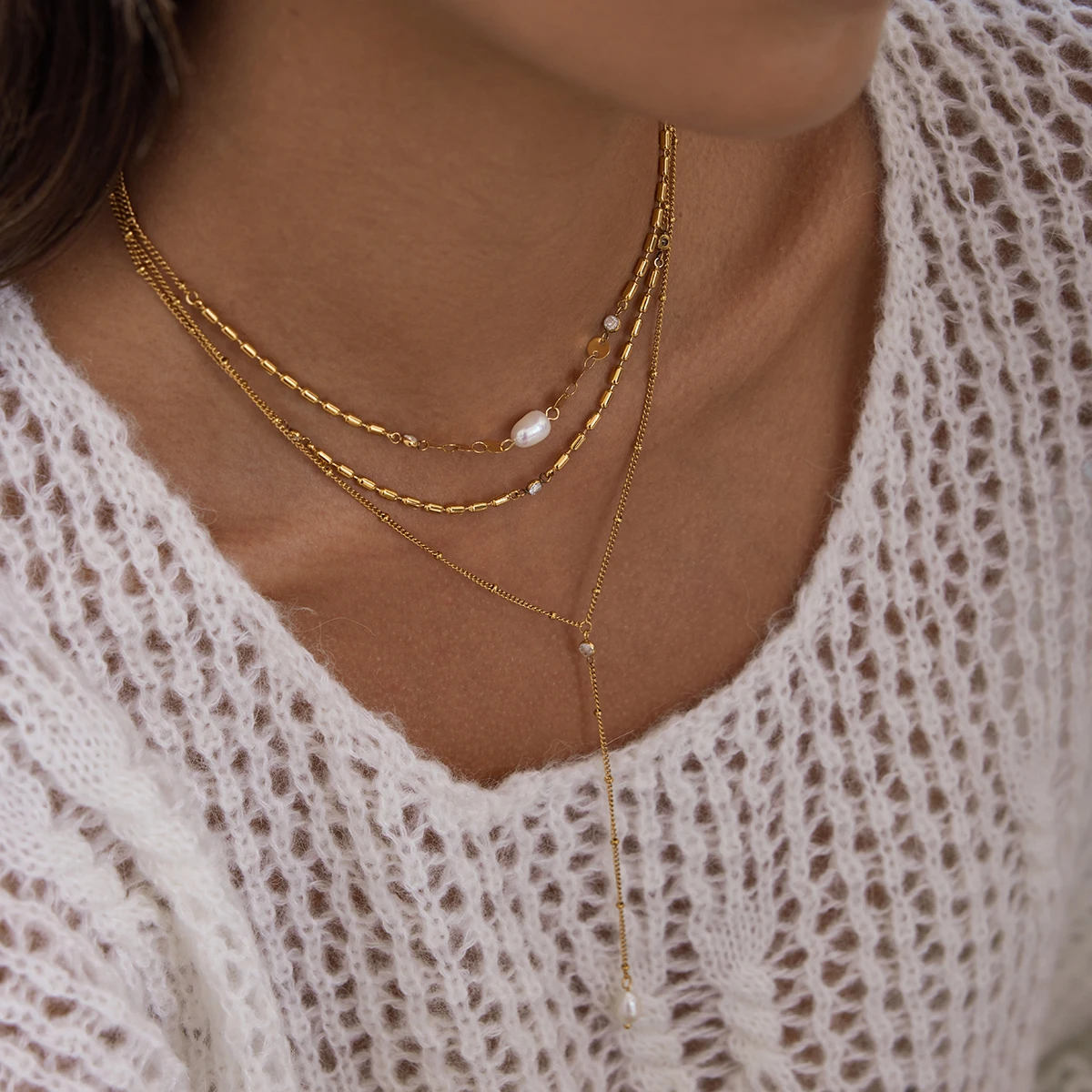 - The longest layer culminates in a fine gold chain with a larger pearl drop at the center, creating a graceful focal point for your look.