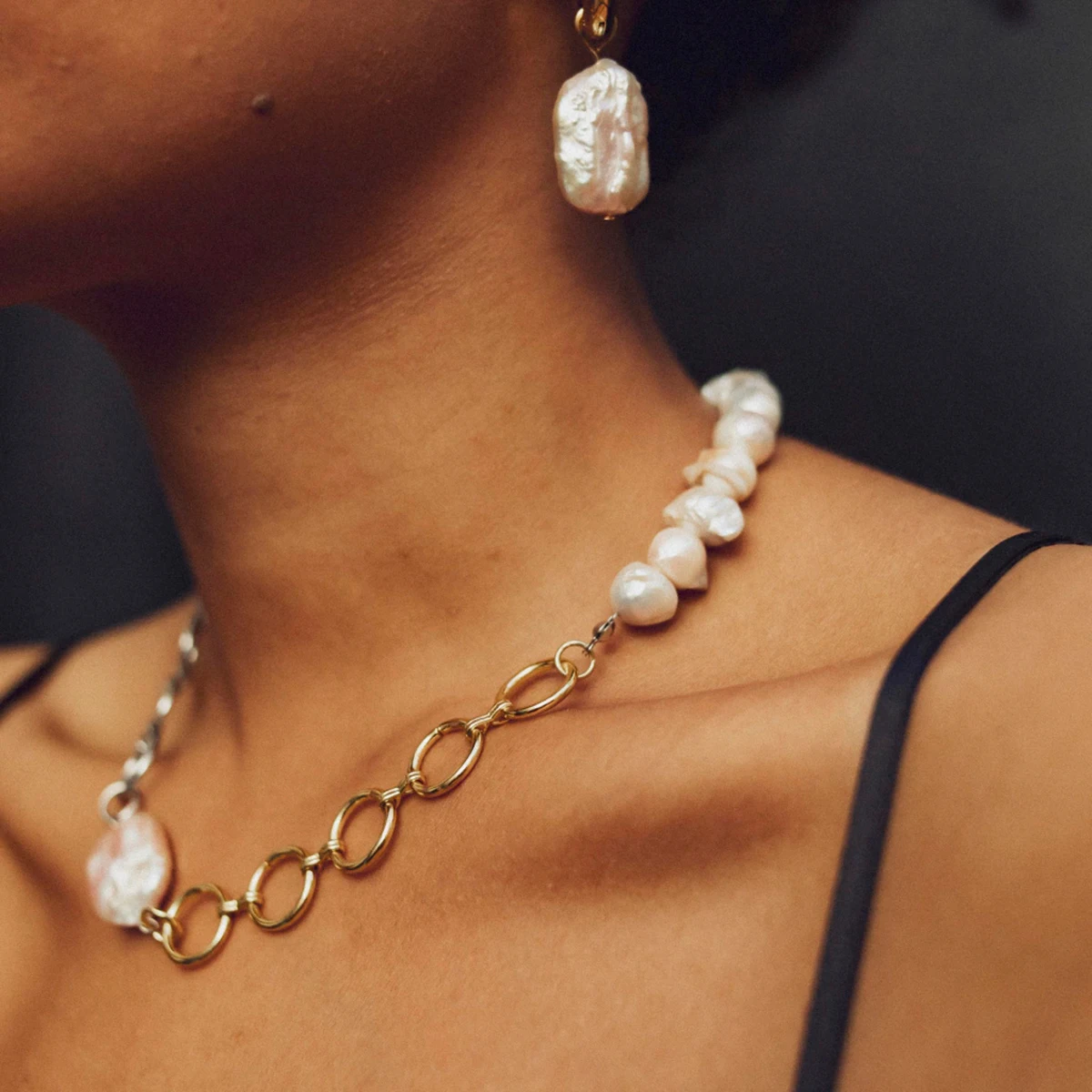 - Features luminous freshwater pearls of irregular shape, spaced evenly along thin, delicate chains, adding a soft, elegant contrast to the gold geometric elements.