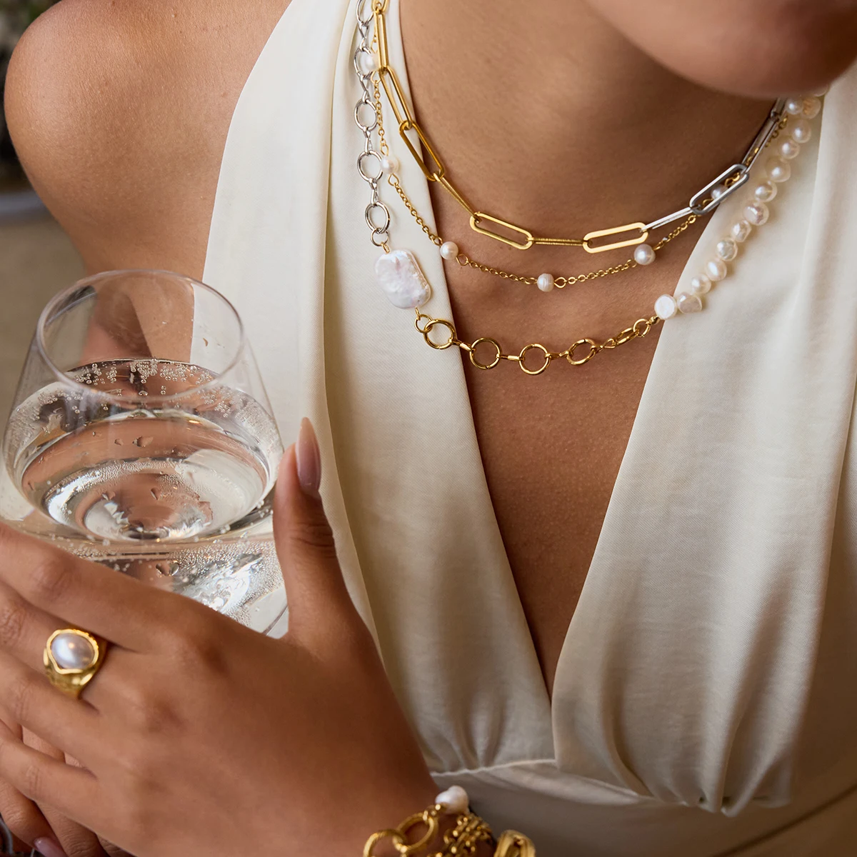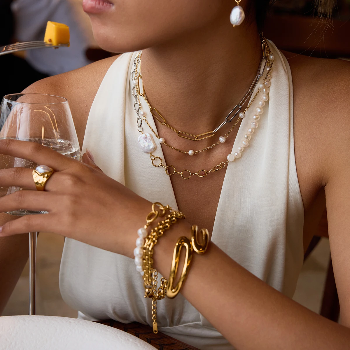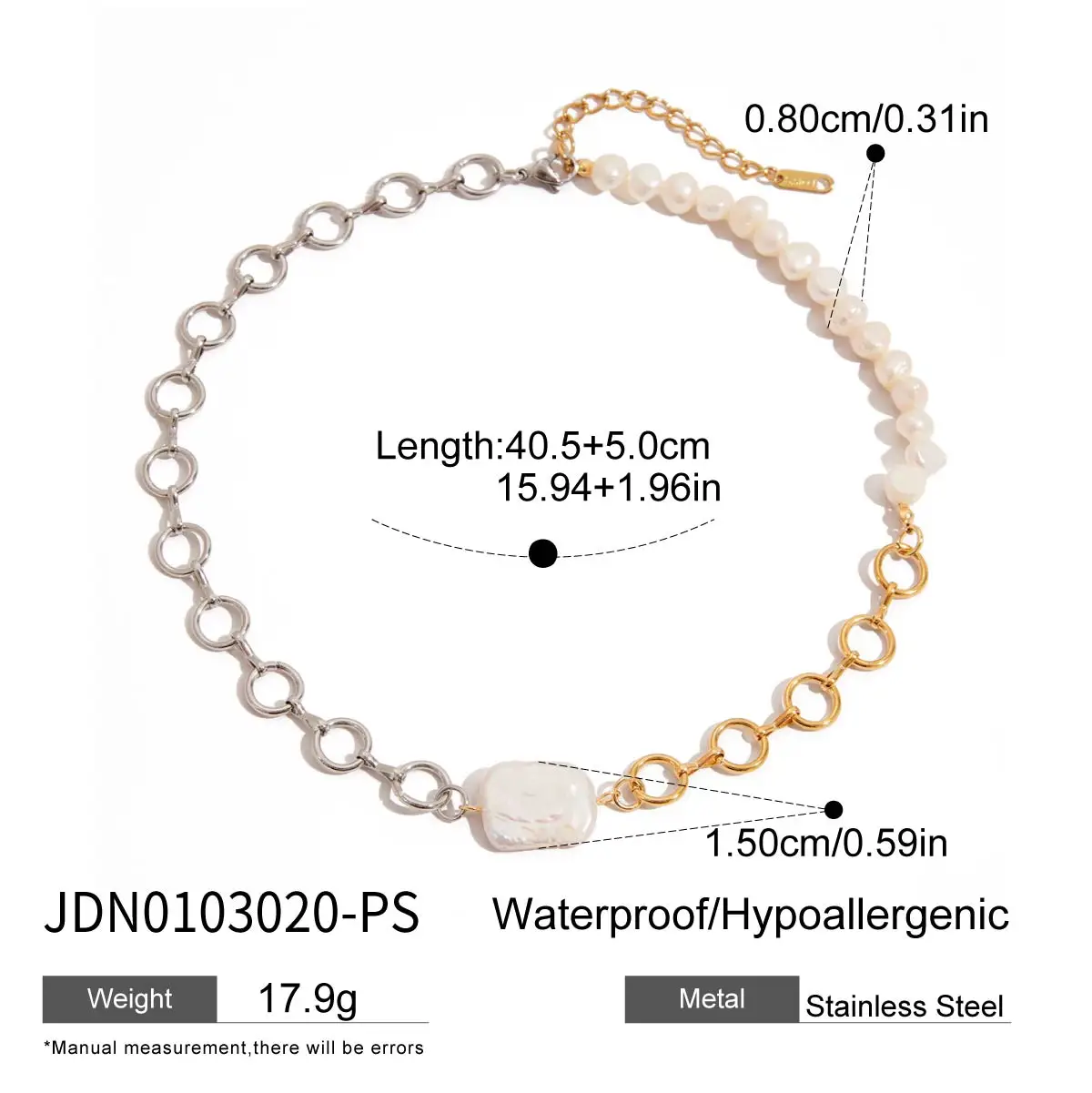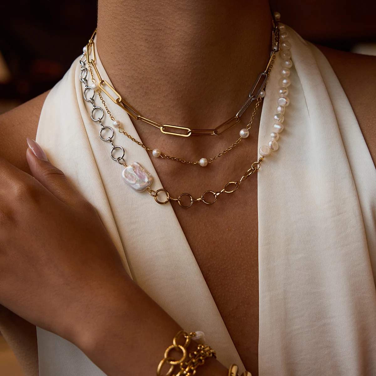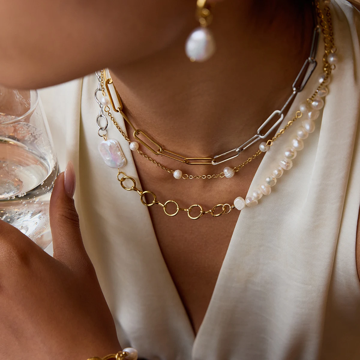 Transform your look effortlessly with this stunning layered necklace that blends modern geometric design with luminous freshwater pearls. Crafted from durable stainless steel with a long-lasting PVD gold finish, this piece shines brilliantly, elevating any outfit for party or special occasions. Combining sleek rectangular links, bold interconnected circular chains, and delicate pearl accents, it offers a sophisticated yet trendy aesthetic. The light 15g weight ensures comfortable wear, while its waterproof, nickel-free, lead-free, and cadmium-free properties make it a reliable, stylish accessory. Whether you want a subtle elegant touch or a statement piece, this necklace complements all styles and outfits, making it a versatile addition to your jewelry collection.