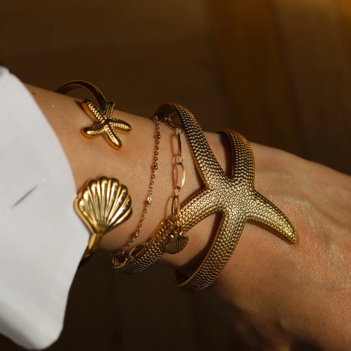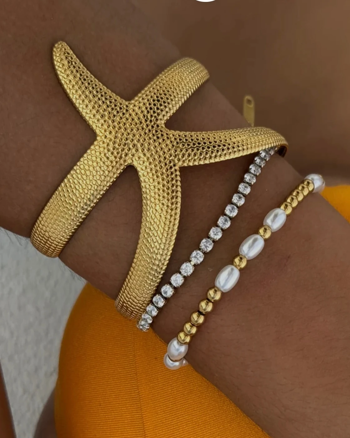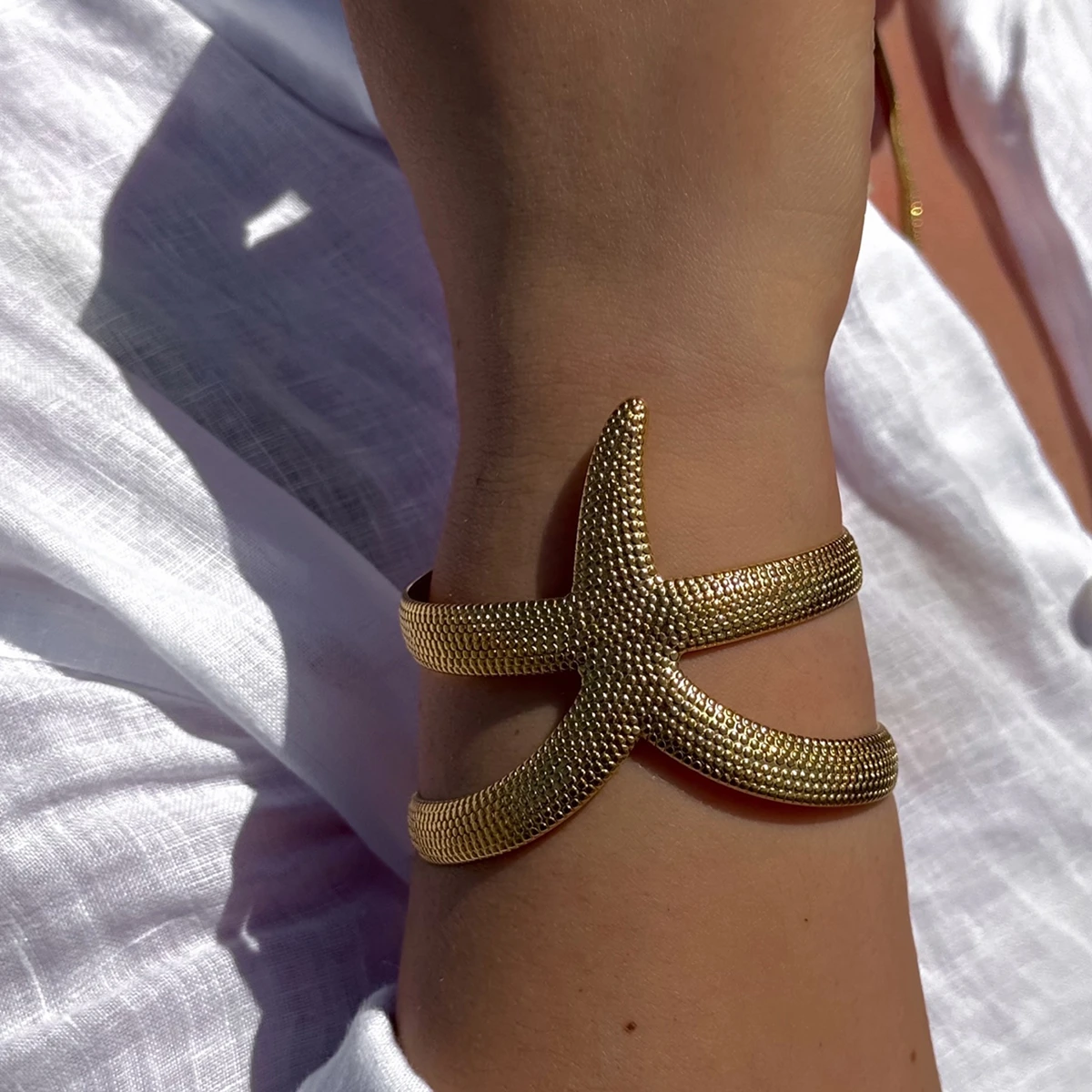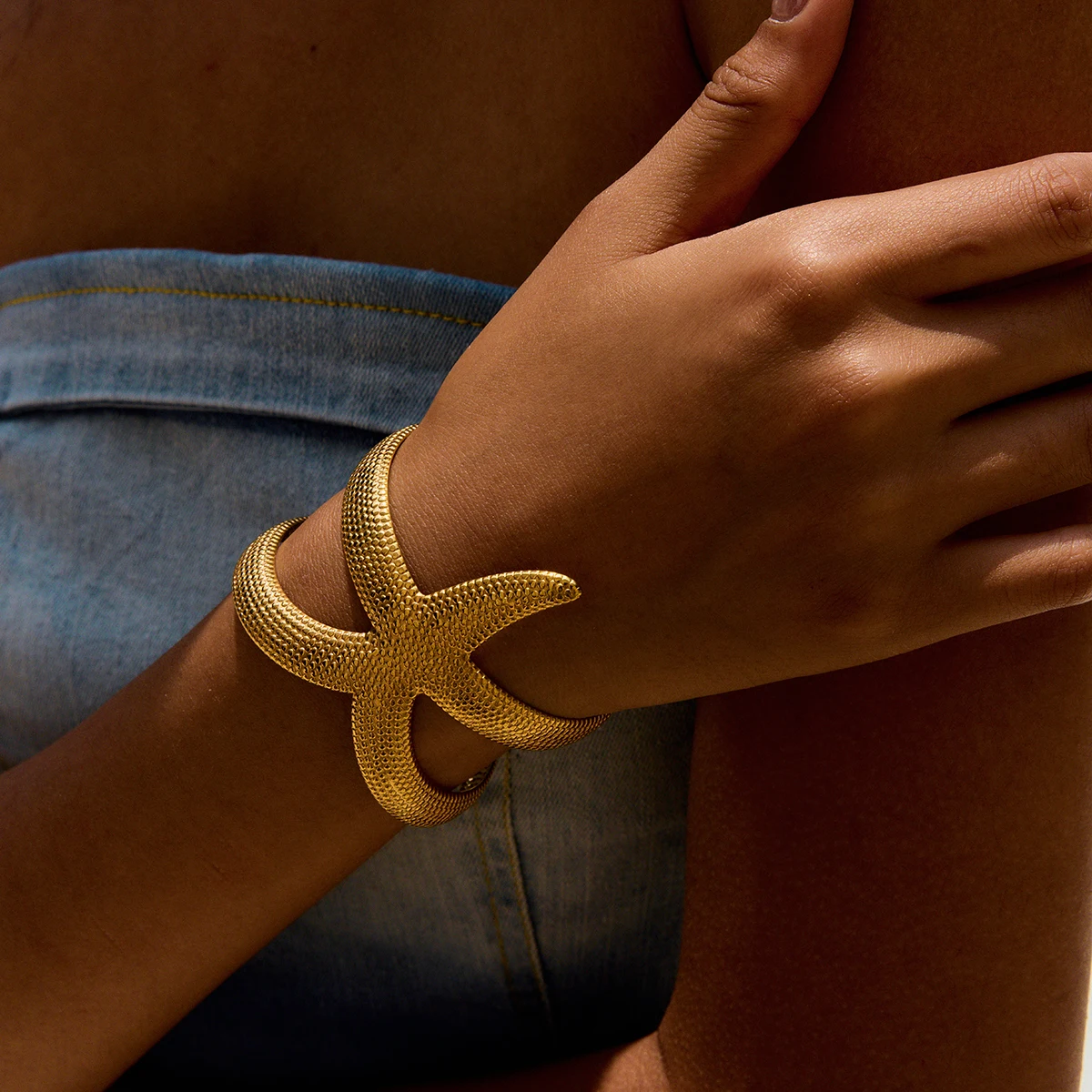 - This bracelet features a starfish motif with a textured, natural-like surface, emphasizing its detailed and stylish design for a modern, minimalist aesthetic.