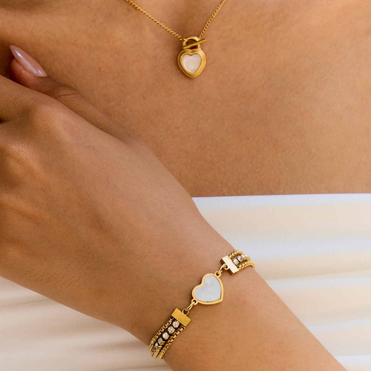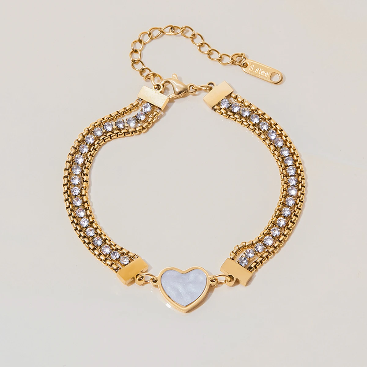 Step into the spotlight with this stylish and sophisticated women's bracelet, meticulously crafted from durable stainless steel with a lustrous gold color finish. Its three-layer chain design creates a trendy, layered look that adds depth and flair to any outfit. The centerpiece features a striking heart-shaped white zircon stone, set within a gold frame, offering a romantic and eye-catching detail. Flanking the heart are two delicate chains adorned with small, sparkling rhinestones or cubic zirconia stones, enhancing its luxurious appeal. The secure lobster clasp ensures a comfortable fit, making it ideal for daily wear or special occasions. Elevate your fashion game with this versatile and charming accessory that complements your personal style effortlessly.