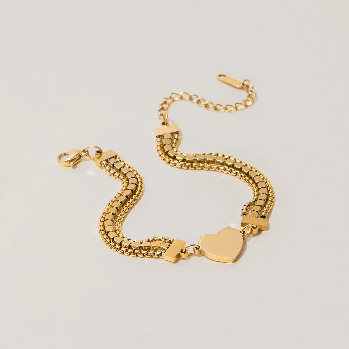 - This bracelet features a three-layer chain design in shiny gold-tone stainless steel, combining elegance and durability for everyday or special occasion wear.