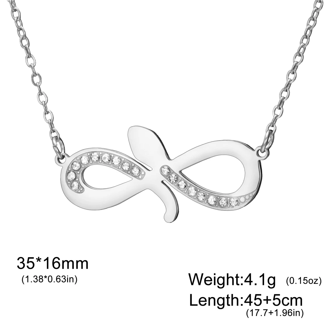 - Technical specifications include 60cm (23.6″) link chain, pendant size of 35mm x 16mm, crafted from stainless steel with rhinestone embellishments.