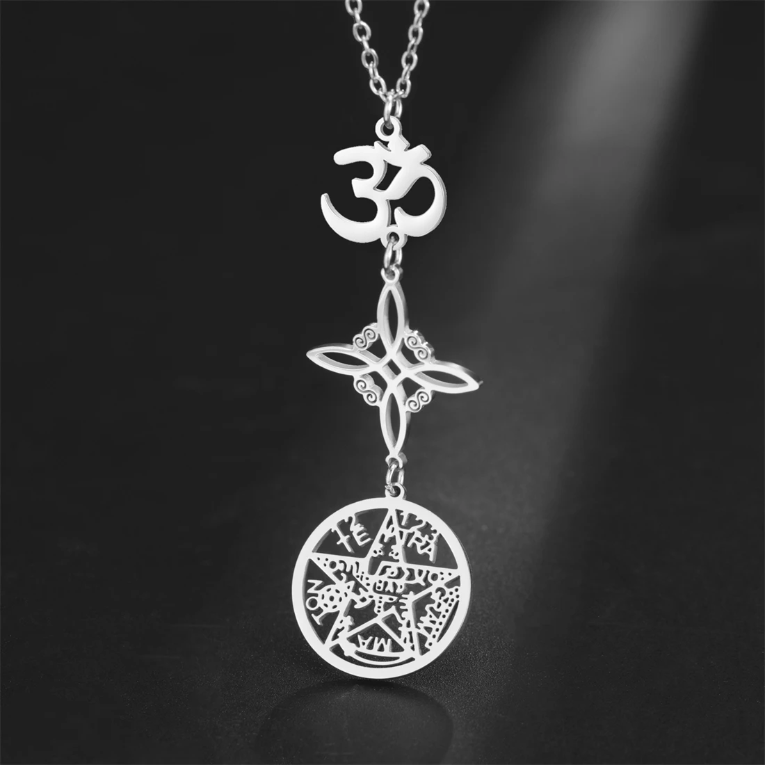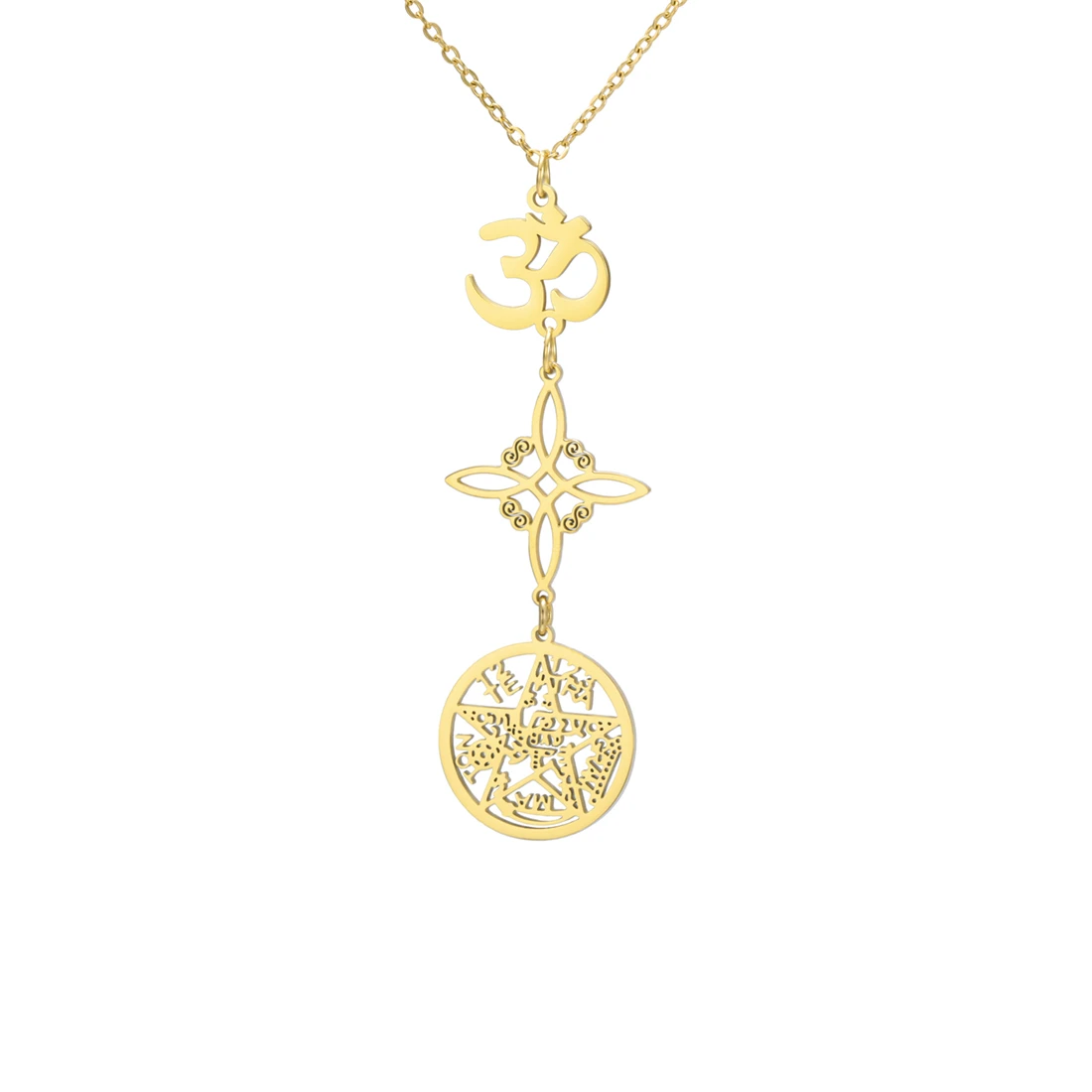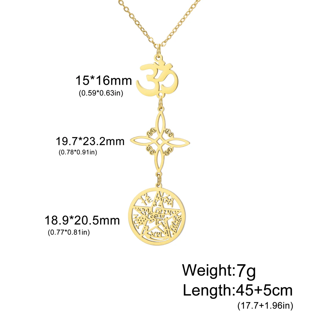 Imagine yourself wearing this exquisite necklace, combining spiritual symbolism with modern craftsmanship. Crafted from durable stainless steel, available in stunning gold-tone or silver-tone finishes, it measures 45 centimeters with a 5-centimeter extension chain for perfect fit. The top pendant features a sleek, polished OM Yoga symbol, complemented by an intricate witch knot design that adds a mystical touch. The circular pendant beneath showcases a detailed geometric pattern resembling a magical sigil, highlighting artistic finesse. All pendants have smooth, polished edges that reflect light beautifully. This necklace is ideal for daily wear or special occasions, presenting a blend of elegance, spirituality, and meaningful design that makes it both a fashionable and personal statement piece.