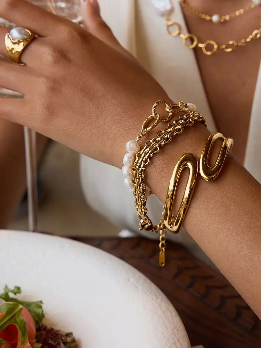 Elegant Stainless Steel Pearl and Gold Bracelet