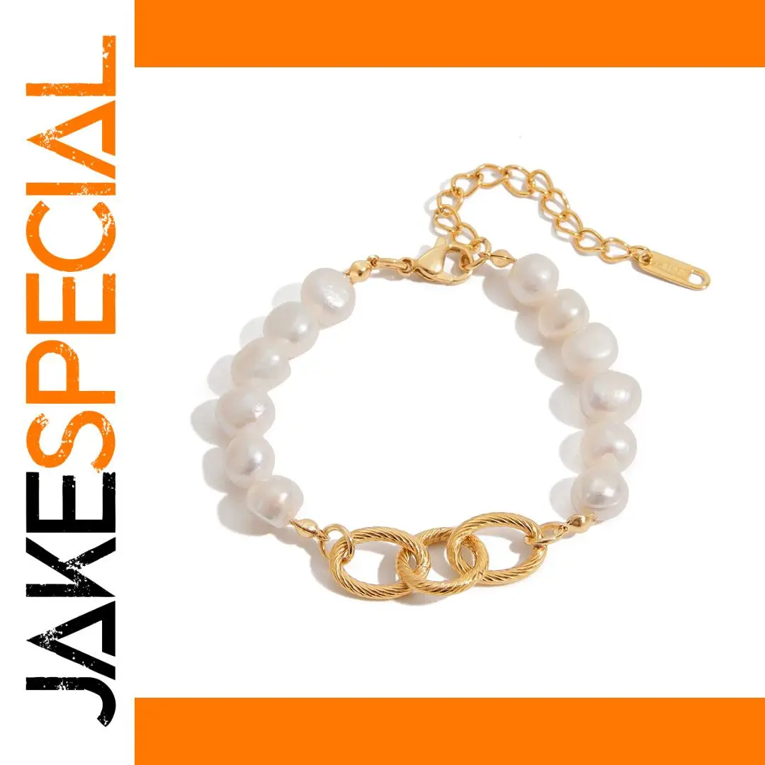 Enhance your style with this elegant freshwater pearl bracelet crafted from high-quality stainless steel, featuring a durable, waterproof, tarnish-free, and scratch-resistant design. The piece showcases lustrous, irregular white freshwater pearls that add organic charm, balanced by three textured gold-tone intertwined rings at the center for a modern geometric touch. Secured with a box-with-tongue clasp and an adjustable extension chain, it offers a perfect, customizable fit. Hypoallergenic, nickel-free, lead-free, and cadmium-free, this versatile bracelet seamlessly combines timeless elegance with contemporary accents, making it an ideal accessory for both daily wear and special occasions. Model number: JDB0103016.
