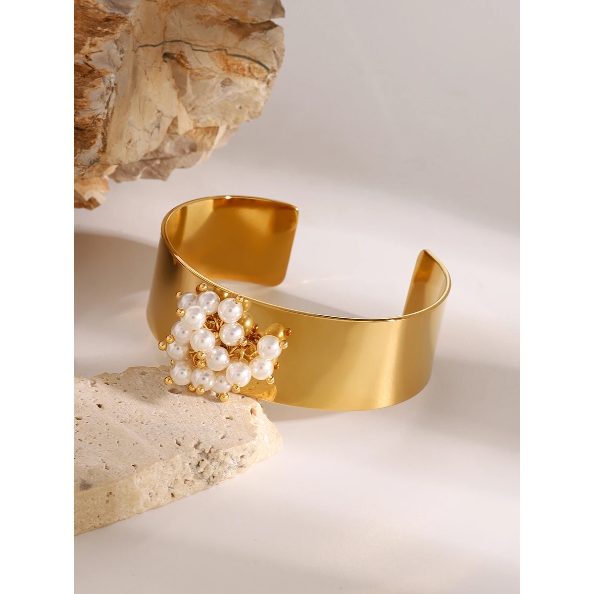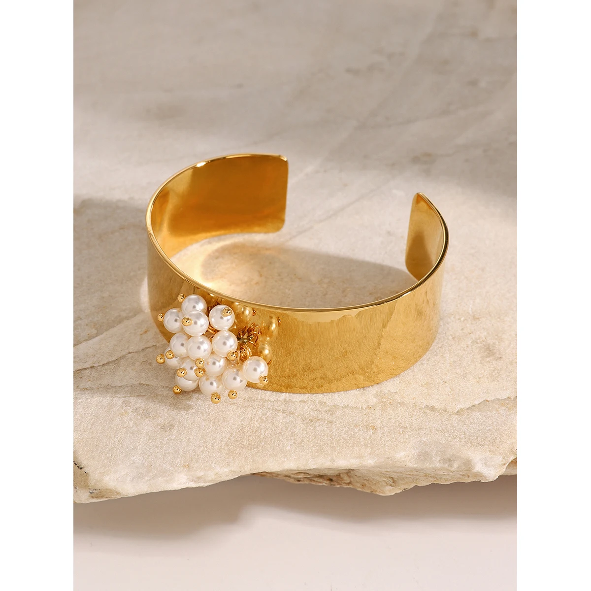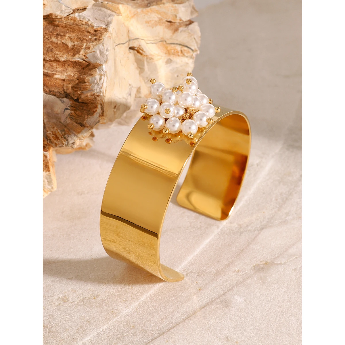 - Technical details include stainless steel composition, PVD gold finish, freshwater pearls, with dimensions aligning with a standard wide cuff design, non-resizable for a perfect fit.