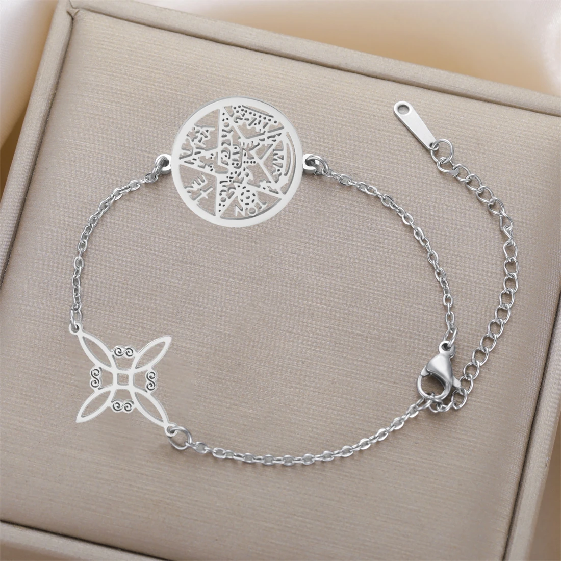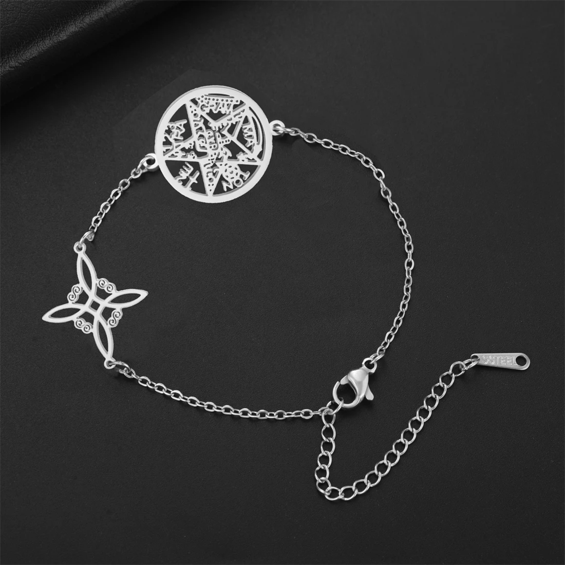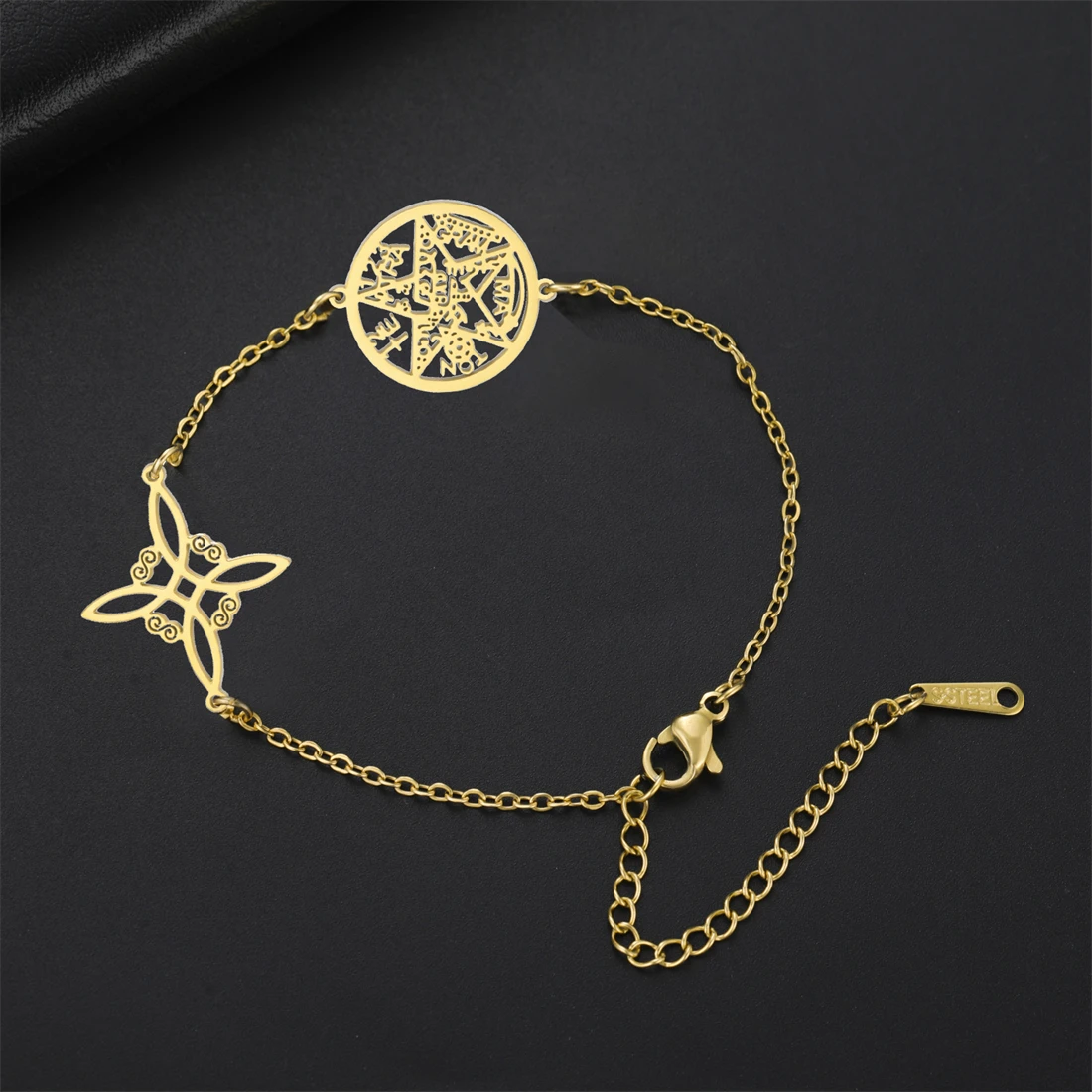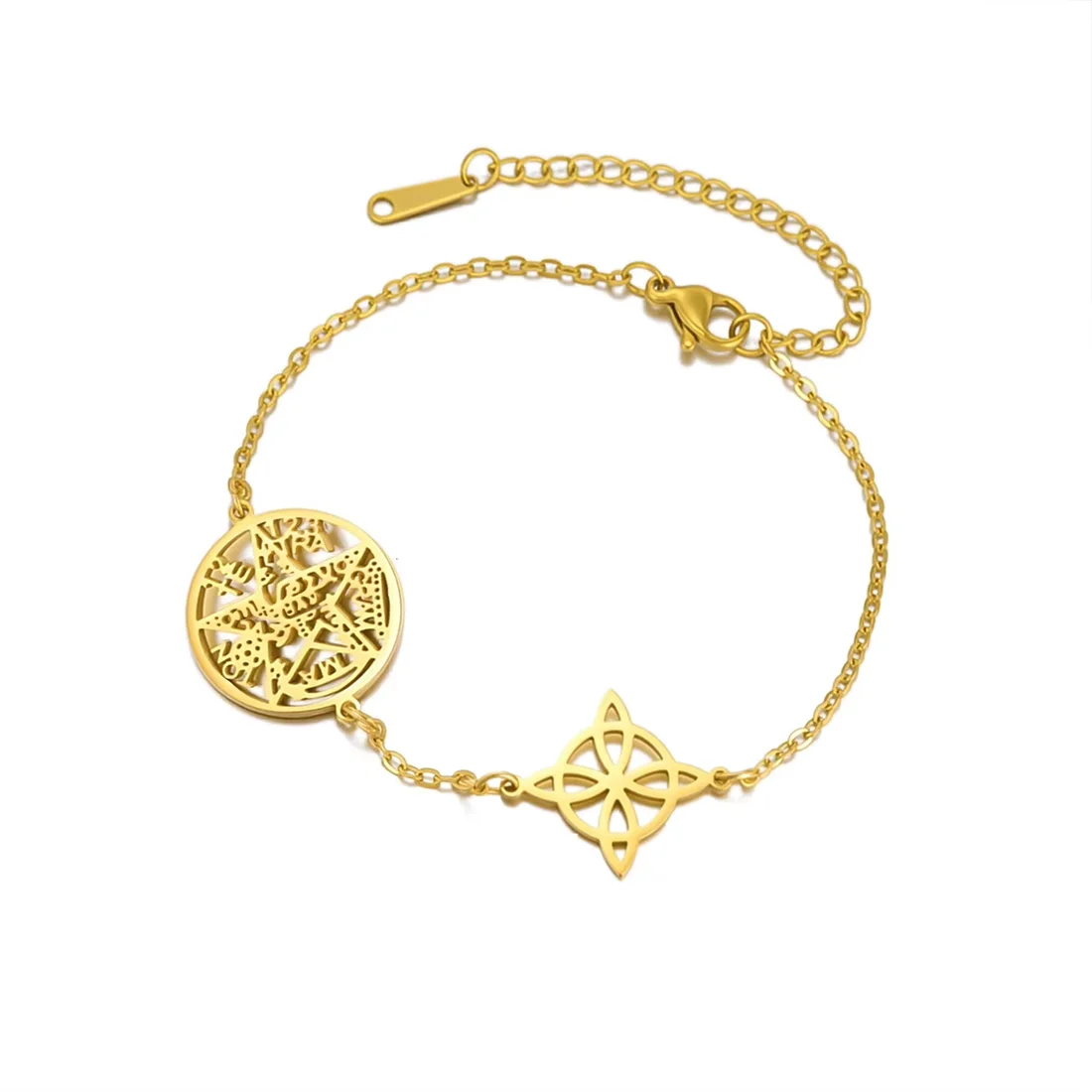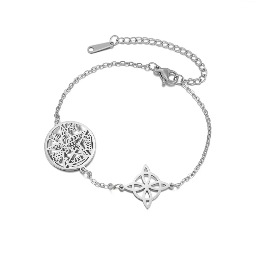 Experience timeless style with this beautiful stainless steel bracelet, crafted with attention to detail and available in classic silver or gold tones. Its delicate chain links and layered circular pendant featuring an intricate geometric cutout design evoke a sense of mysticism and sophistication. The pendant’s sharp lines and angular segments beautifully combine vintage and modern aesthetics, making it a versatile accessory for all occasions. Whether you’re dressing up for a special event or adding a subtle touch to everyday wear, this bracelet offers a perfect balance of elegance and symbolism. The high-quality stainless steel ensures durability and a sleek polished finish, making this piece a meaningful gift or a treasured addition to your jewelry collection.