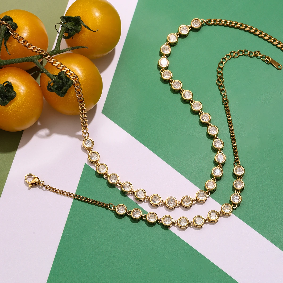 Experience the charm of this women's jewelry set crafted with a stainless steel core and a durable gold-tone finish. Designed to resist tarnishing, it offers long-lasting shine and sophistication. The set includes a tennis chain bracelet and a matching necklace, both adorned with geometric rhinestone accents, such as large oval and rectangular stones, alongside densely set small rhinestones for an eye-catching, glamorous effect. Perfect for daily wear, casual outings, or special occasions, this versatile collection complements various styles effortlessly. Its secure clasp ensures comfort and safety during active lifestyles. With its modern design and bright finish, this jewelry set is a perfect choice to elevate your look and showcase your refined taste.