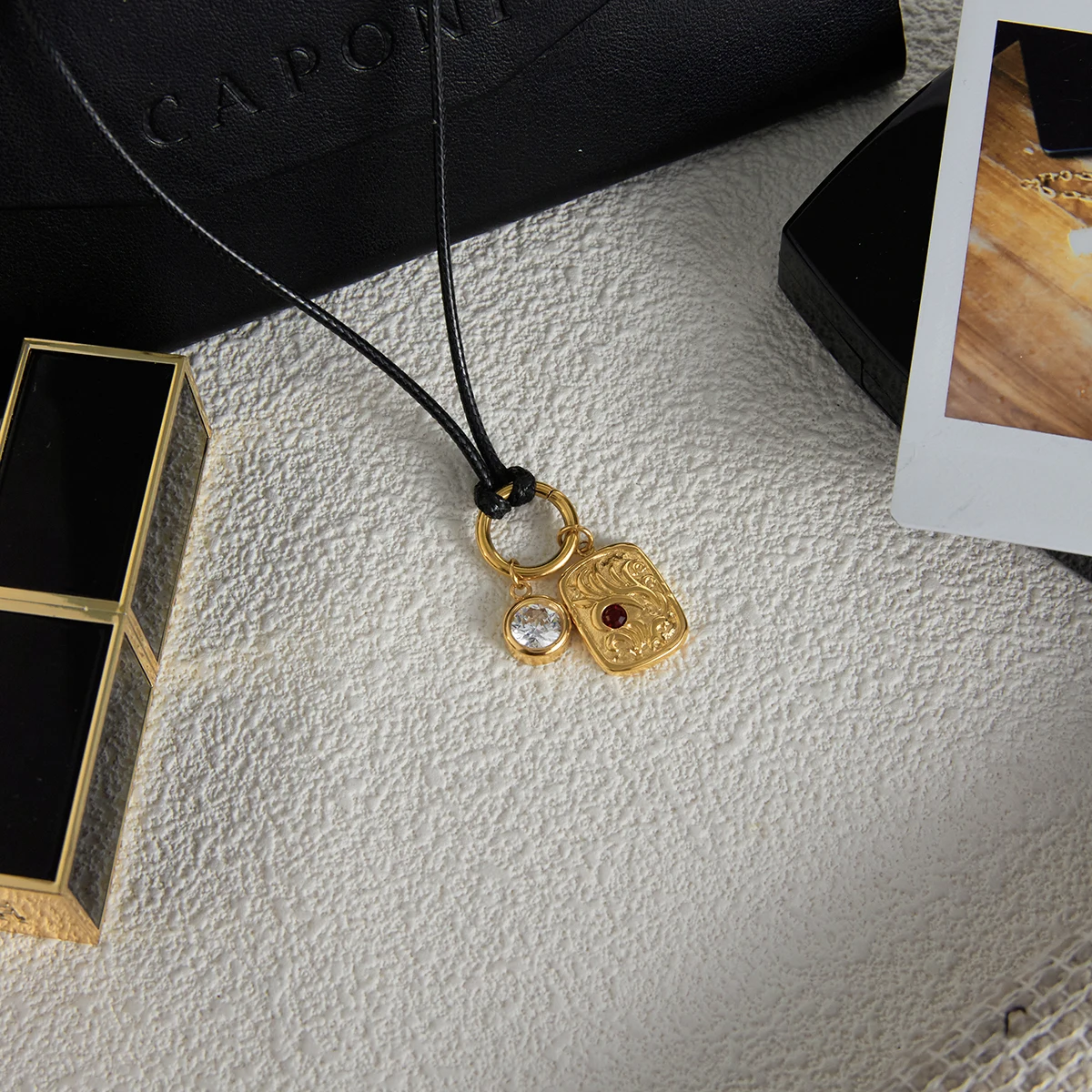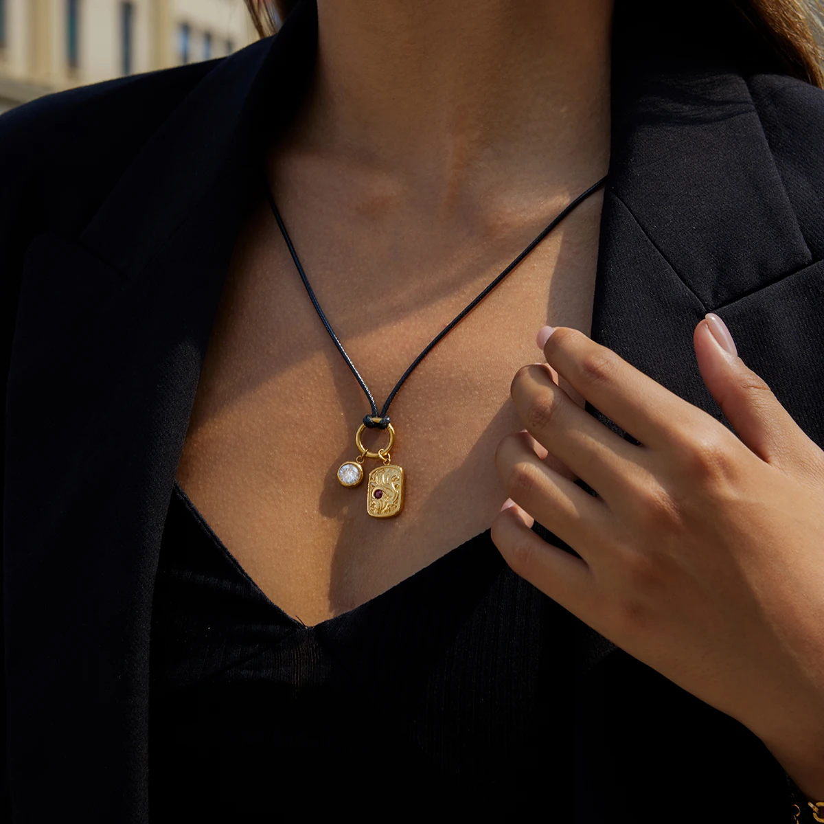 Elevate your style with this stainless steel women’s necklace featuring a 2cm square geometric pendant inlaid with sparkling zirconia stones. The polished chain offers durability and resistance to tarnishing, while the black wax rope passing through a gold-toned circular ring adds contrast and texture. Designed with a flexible link chain, this elegant piece is perfect for parties or formal occasions. Crafted with REACH certification, it guarantees safety and long-lasting beauty. Whether worn for special events or everyday sophistication, this necklace’s intricate design and luxurious sparkle will complement any outfit, making it a timeless addition to your jewelry collection.