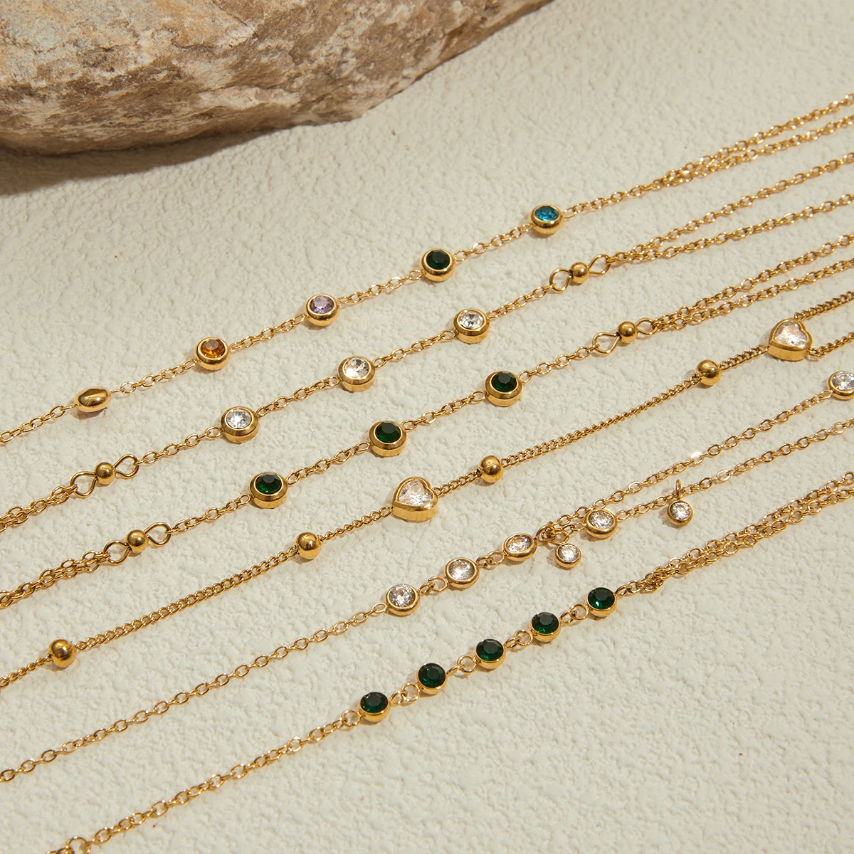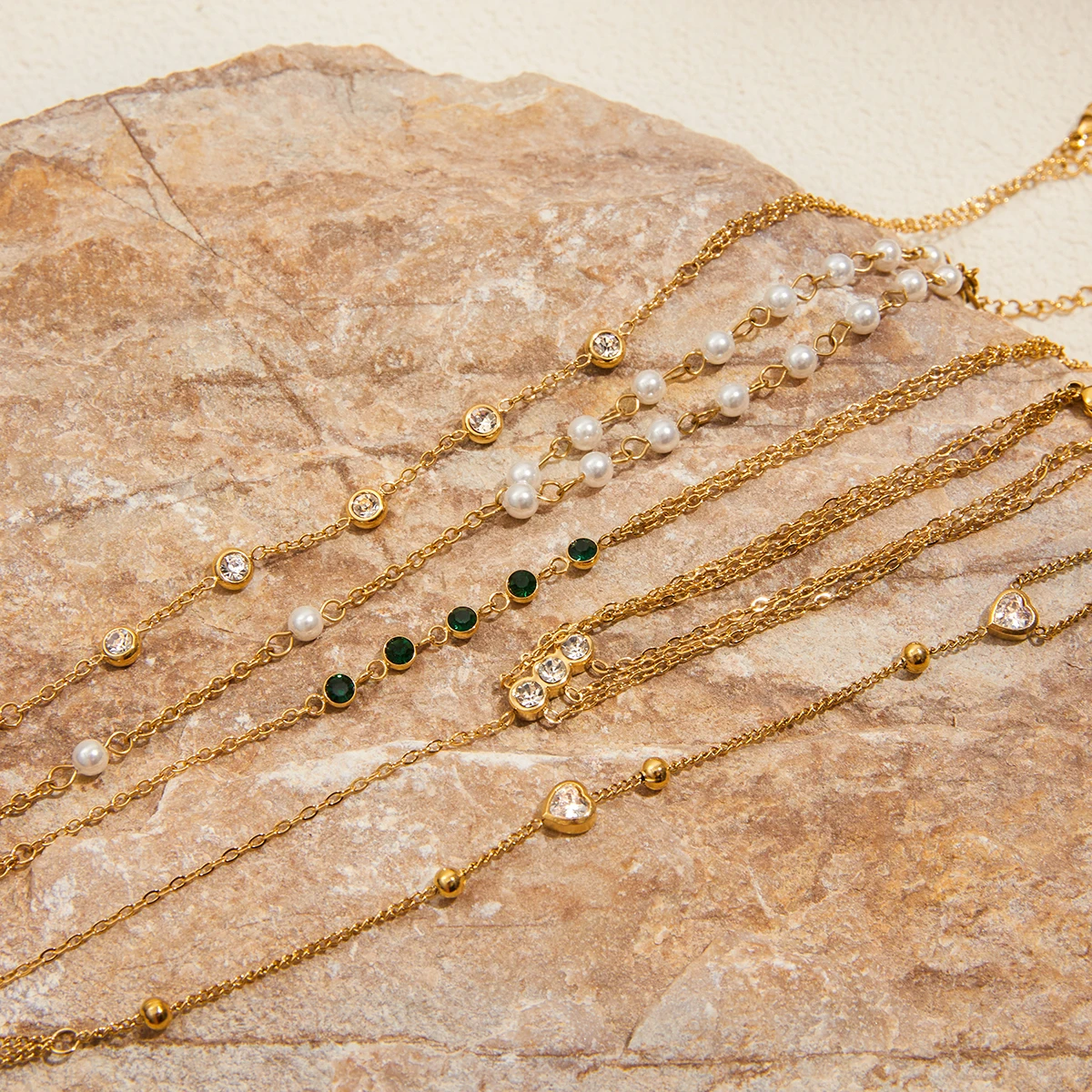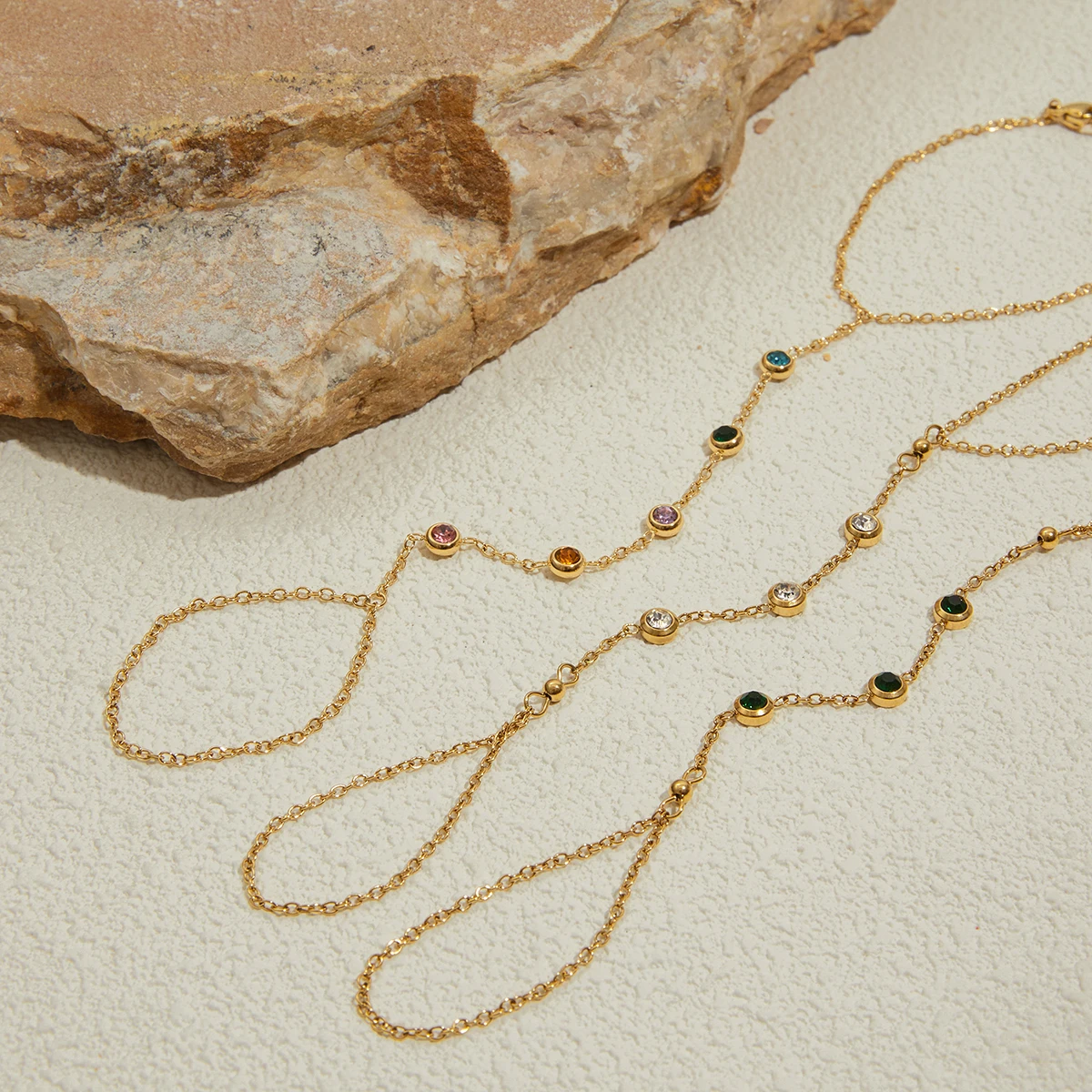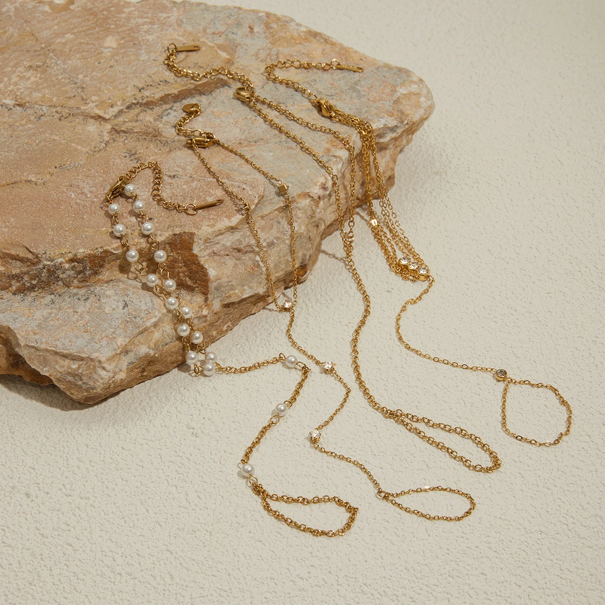 Immerse yourself in subtle luxury with this exquisite three-layer gold-colored stainless steel bracelet. Designed with a minimalist aesthetic, it features delicate link chains connecting smoothly, creating a sophisticated layered effect. The bracelet combines polished surfaces with charming details like tiny zircon embellishments and a petite finger design, adding a touch of sparkle and elegance. Perfect for both casual outings and party occasions, this accessory enhances any look with its refined yet trendy appeal. Crafted from high-quality stainless steel, it offers durability and a radiant gold finish, free from chemical concerns. Experience the beauty of timeless simplicity and chic style, elevating your jewelry collection effortlessly. Revel in its versatile design that feels as beautiful as it looks on your wrist, making every moment special.