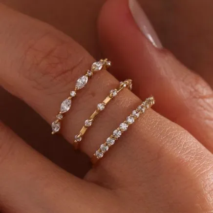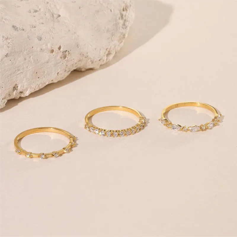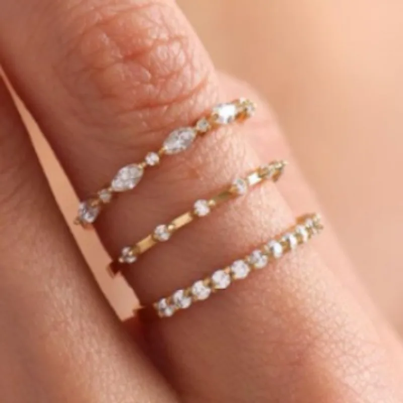- This set includes three rings with varied design elements: marquise stones, round stones, and minimalist styles, perfect for mixing and matching to suit your mood or outfit.