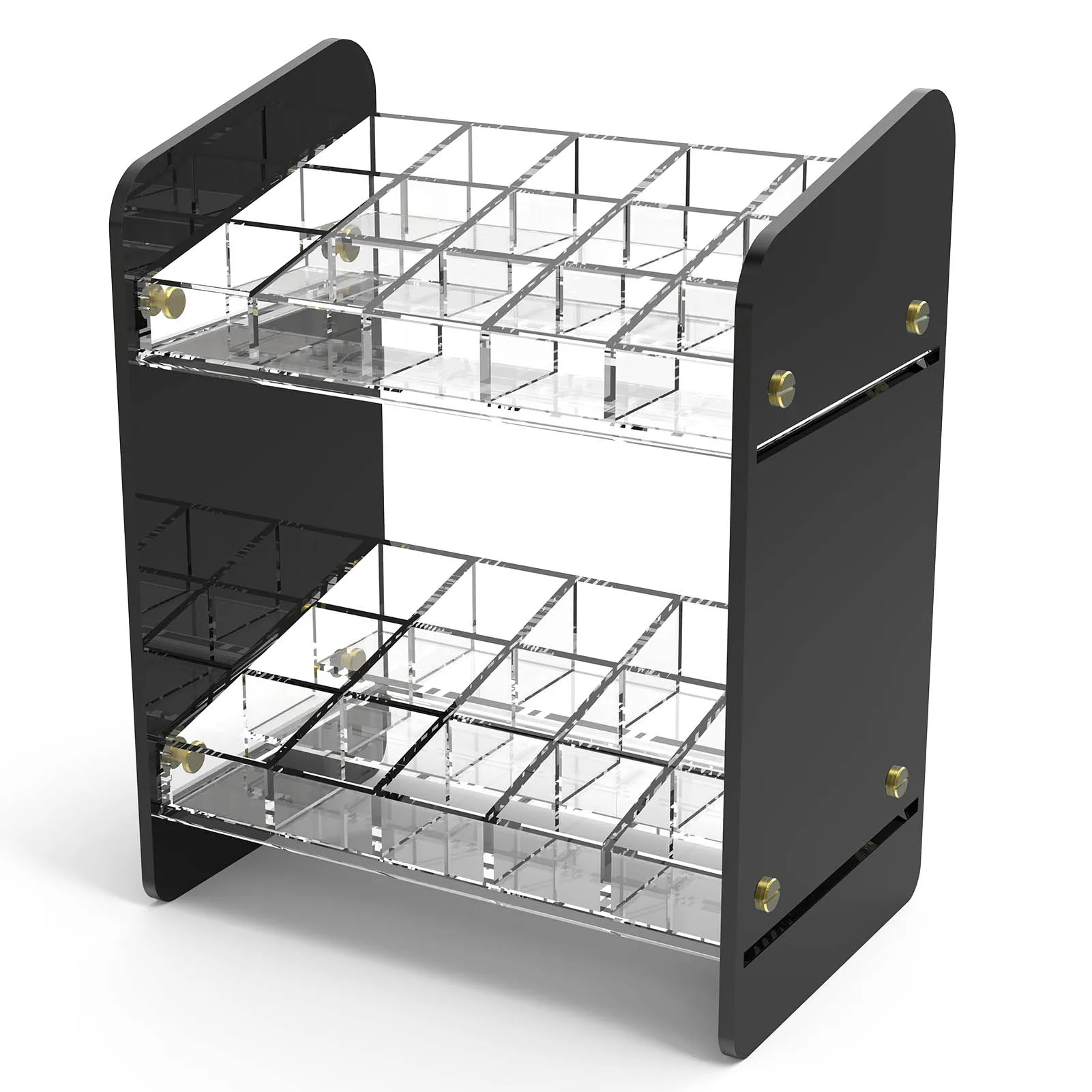 Transform your space with this sleek, two-layer acrylic organizer by Evemodel, designed for meticulous display of cosmetics, paint bottles, and collectibles. Its modern trapezoid shape, combined with transparent acrylic, offers a bright, airy feel that enhances any setting. The sturdy construction ensures longevity, while the compact dimensions—210mm wide, 135mm deep, and 262mm high—maximize storage without clutter. The black side panels with softly rounded upper edges add a sophisticated touch. The integrated grid pattern in each tier, with 30 compartments measuring approximately 36mm x 36mm, ensures items are organized neatly and are easily accessible. Simple to assemble, this versatile rack clearly showcases your collection, creating a stylish and efficient display.