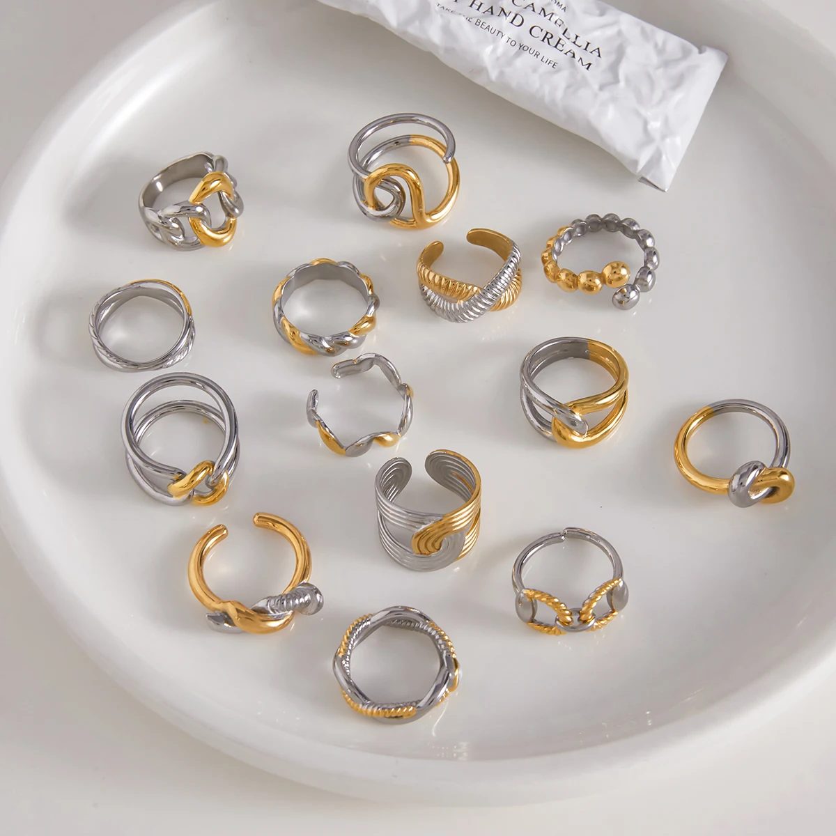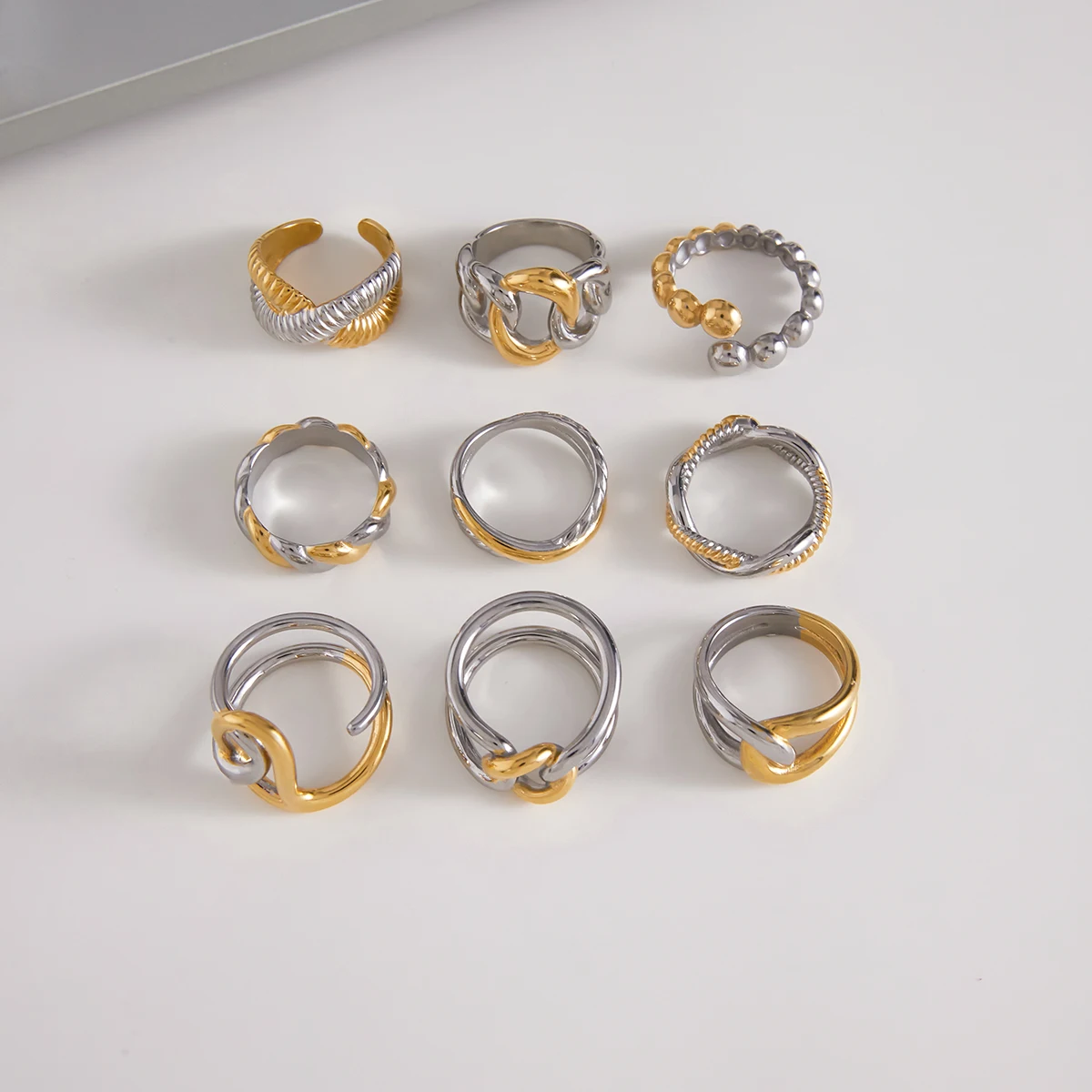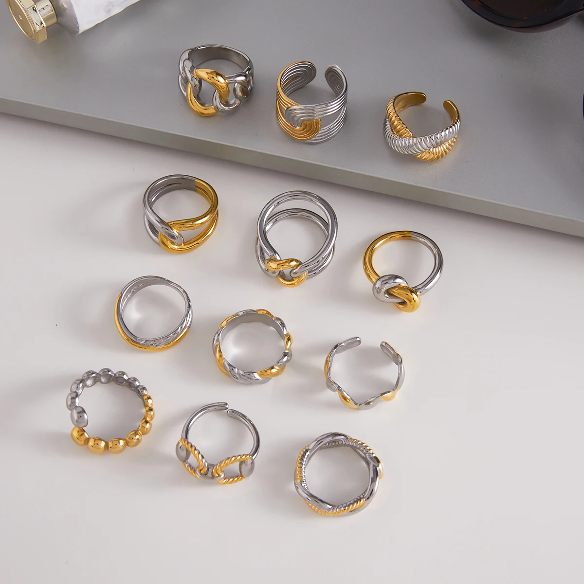 Experience modern elegance with this minimalist two-tone knot ring, expertly crafted from durable stainless steel with a beautiful gold finish. Its sleek, smooth surface features a geometric pattern with a narrow 2mm width, offering a delicate yet sophisticated look. The knot motif adds a trendy touch suitable for both casual and party occasions. Its lightweight design allows effortless wear, making it versatile for daily use or special events. The stainless steel ensures long-lasting shine without high-concern chemical treatments, making the ring resistant to tarnishing. Whether you are dressing up or down, this stylish piece complements all outfits. Elevate your jewelry collection with a ring that blends contemporary fashion and refined simplicity effortlessly.