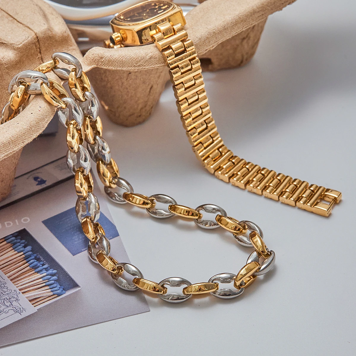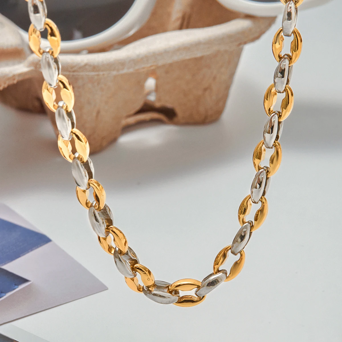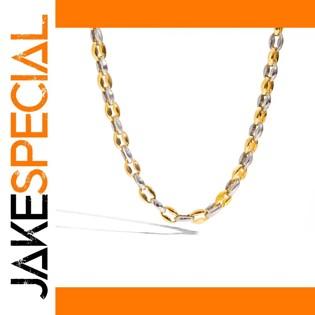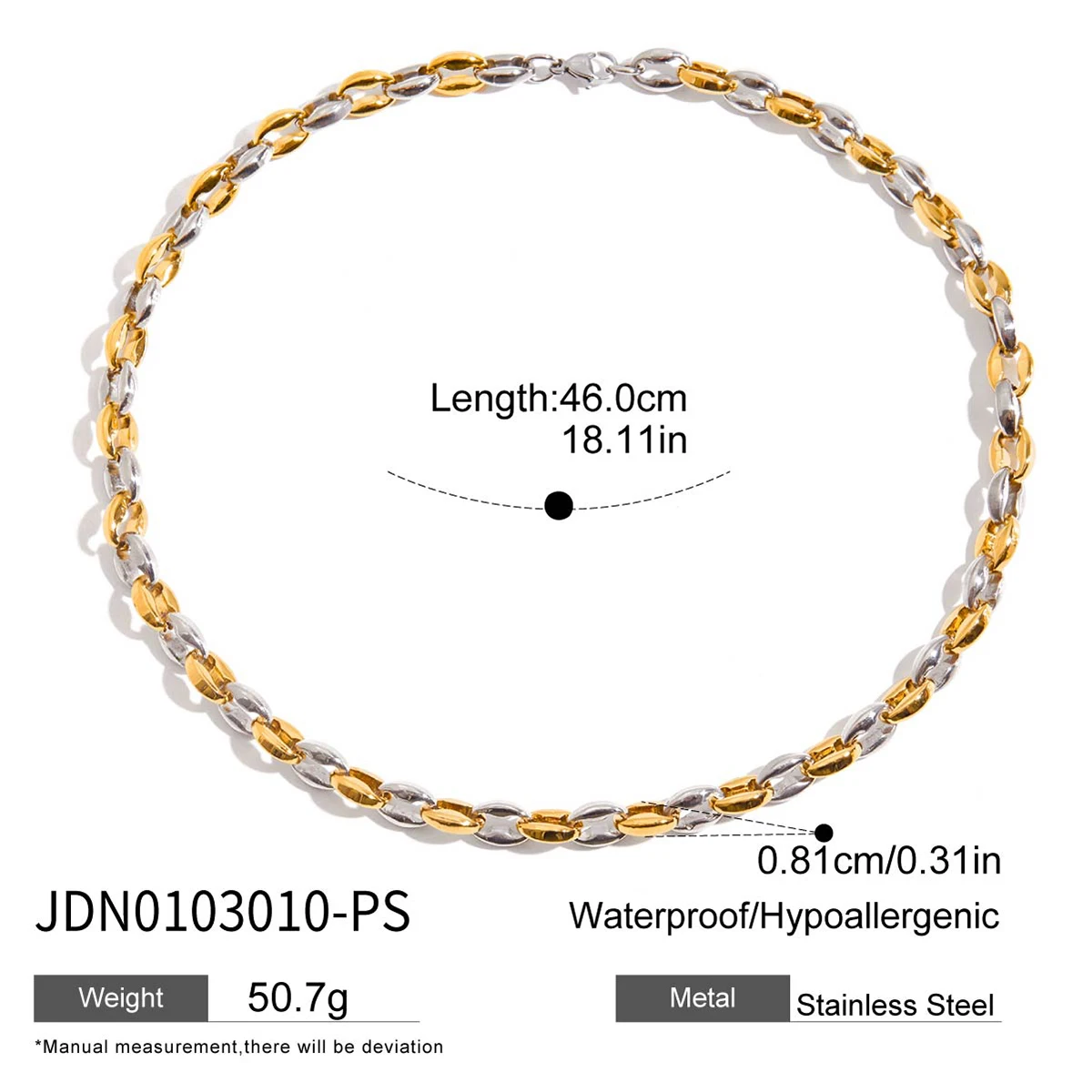 Experience the perfect blend of modern style and timeless sophistication with this unisex two-tone necklace. Crafted from high-quality stainless steel with a durable titanium steel core, it offers excellent corrosion and tarnish resistance, ensuring long-lasting beauty. Featuring an elongated oval hollow skeleton pattern with alternating gold and silver tones, the design provides a lightweight, breathable feel suitable for everyday wear. The smooth, polished surface of each link reflects a shiny metallic luster, accentuating its sleek aesthetic. Subtle zircon stones add a touch of understated brilliance, enhancing the minimalist yet refined style. Its versatile construction makes it ideal for casual outings, formal events, or elevating your daily wardrobe effortlessly.