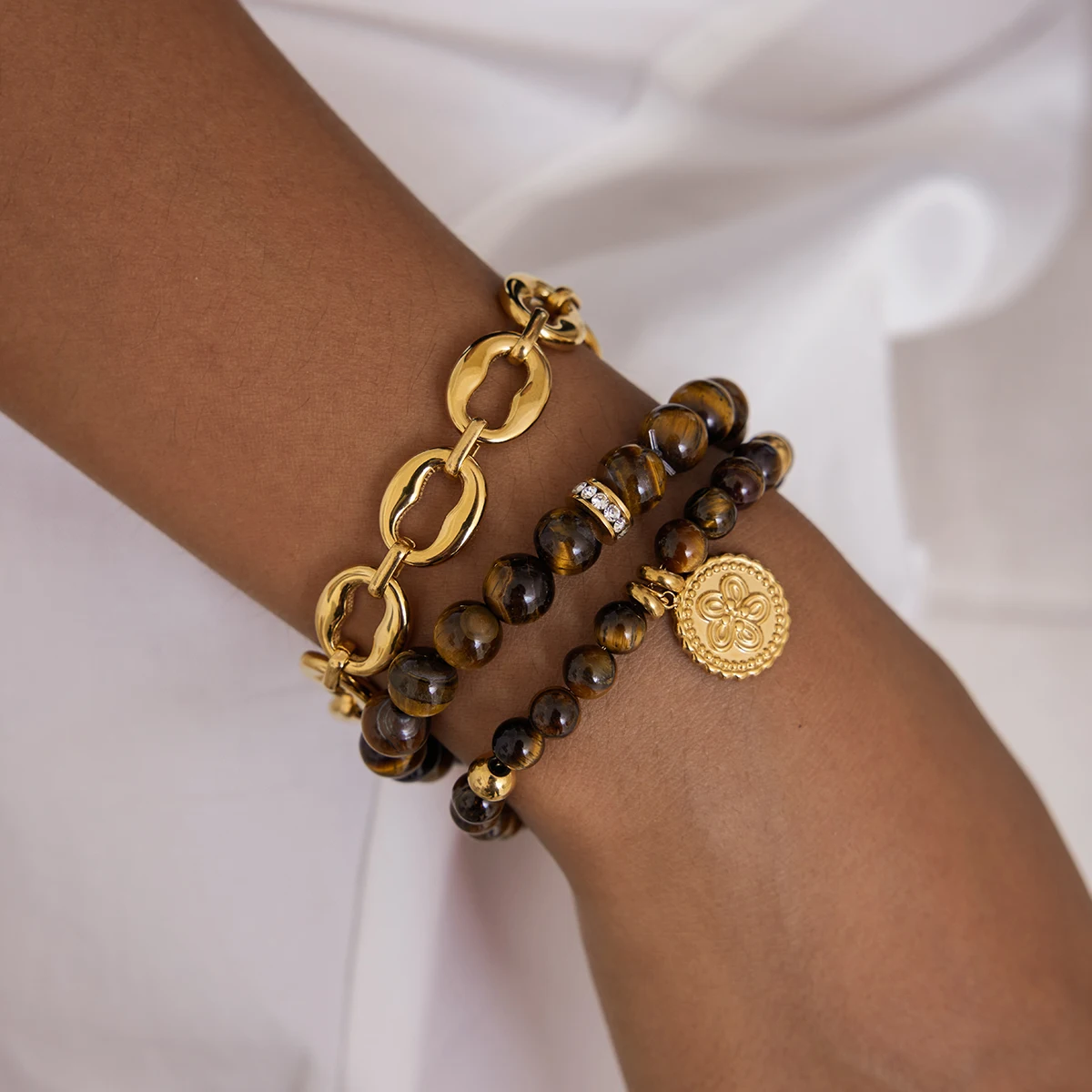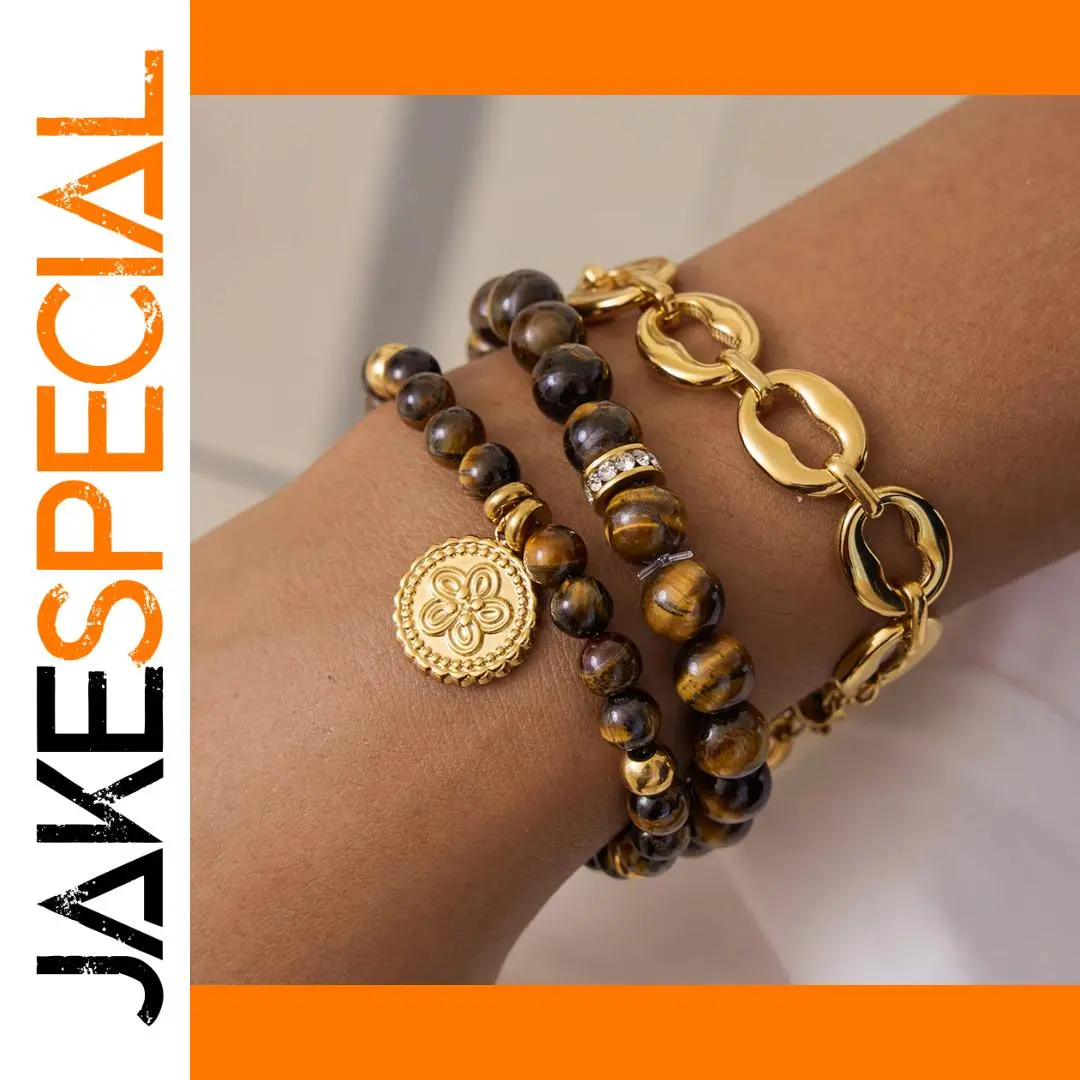 Imagine elevating your style with this exquisite vintage-inspired jewelry set. Crafted from durable stainless steel, these bracelets feature a harmonious blend of natural stone beads and sleek gold-tone metal links. The beaded design highlights polished tiger’s eye stones with warm brown streaks, complemented by delicate star-shaped charms and rhinestone accents for subtle sparkle. The chain-style bracelet’s large, glossy oval links add boldness, while the beaded strand with a spacer bead delivers a touch of glamour. Perfect for sophisticated occasions or daily wear, this set combines timeless elegance with modern fashion. Its waterproof feature ensures lasting beauty. Wear these jewelry pieces to showcase your unique style confidently and effortlessly.